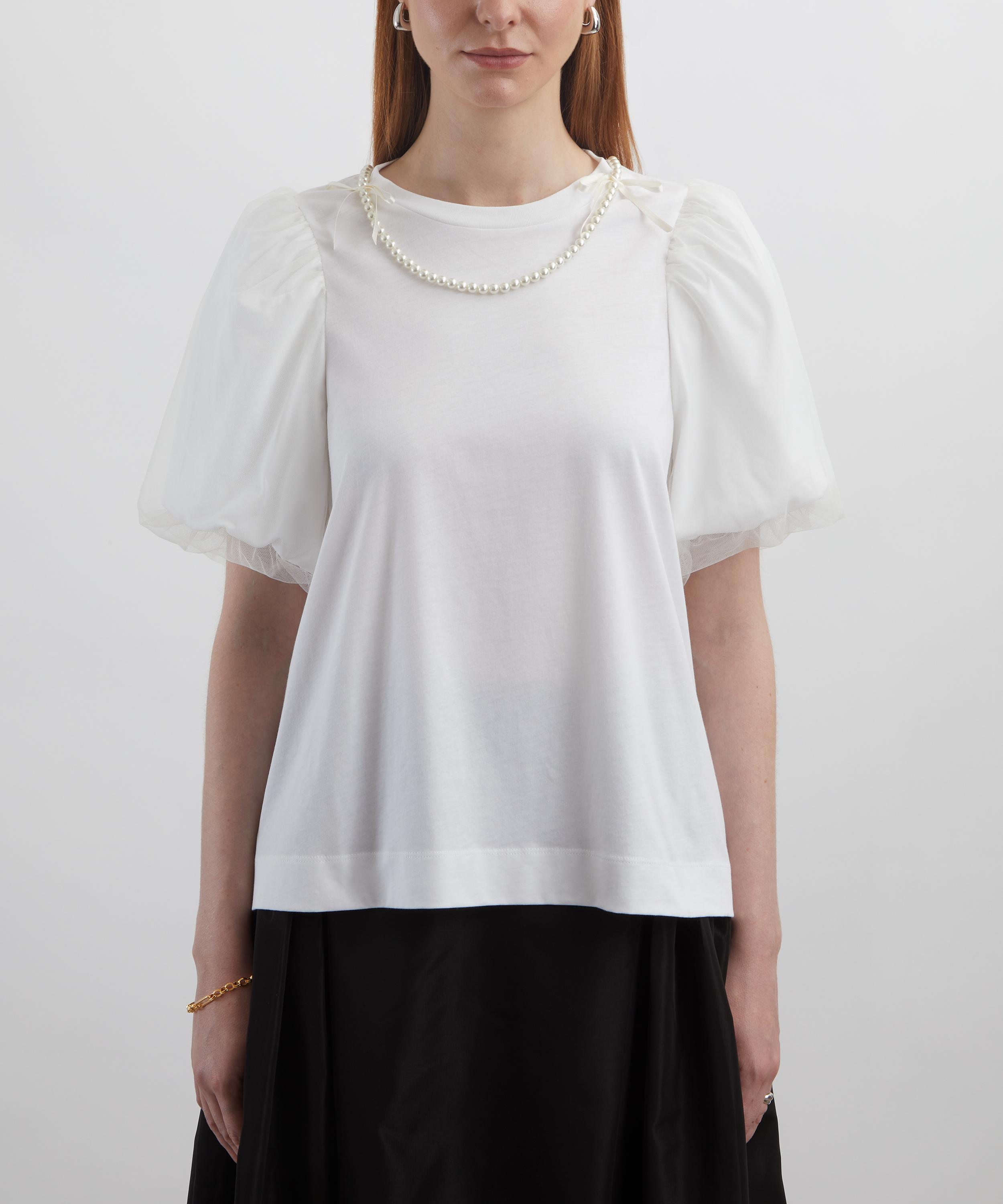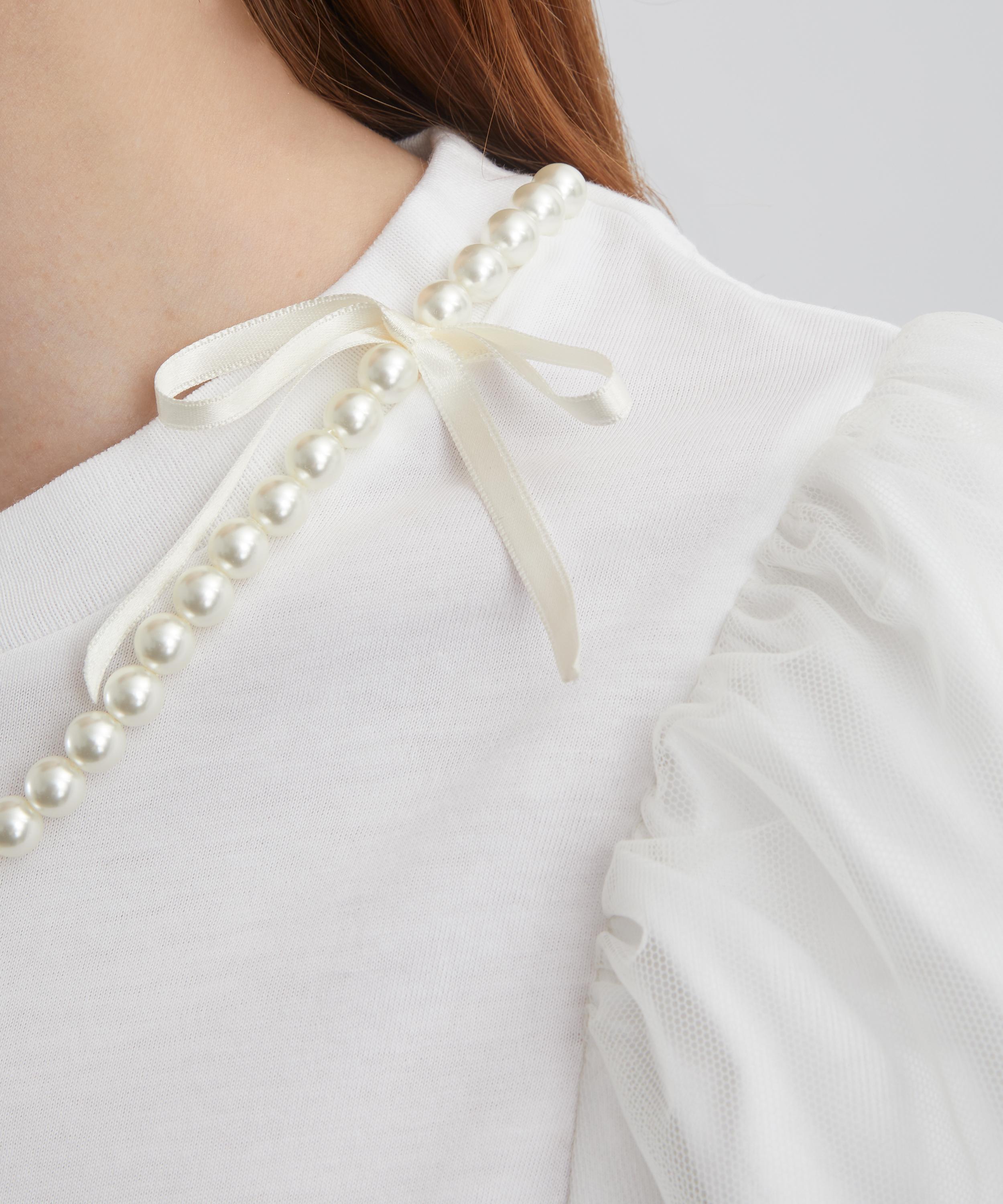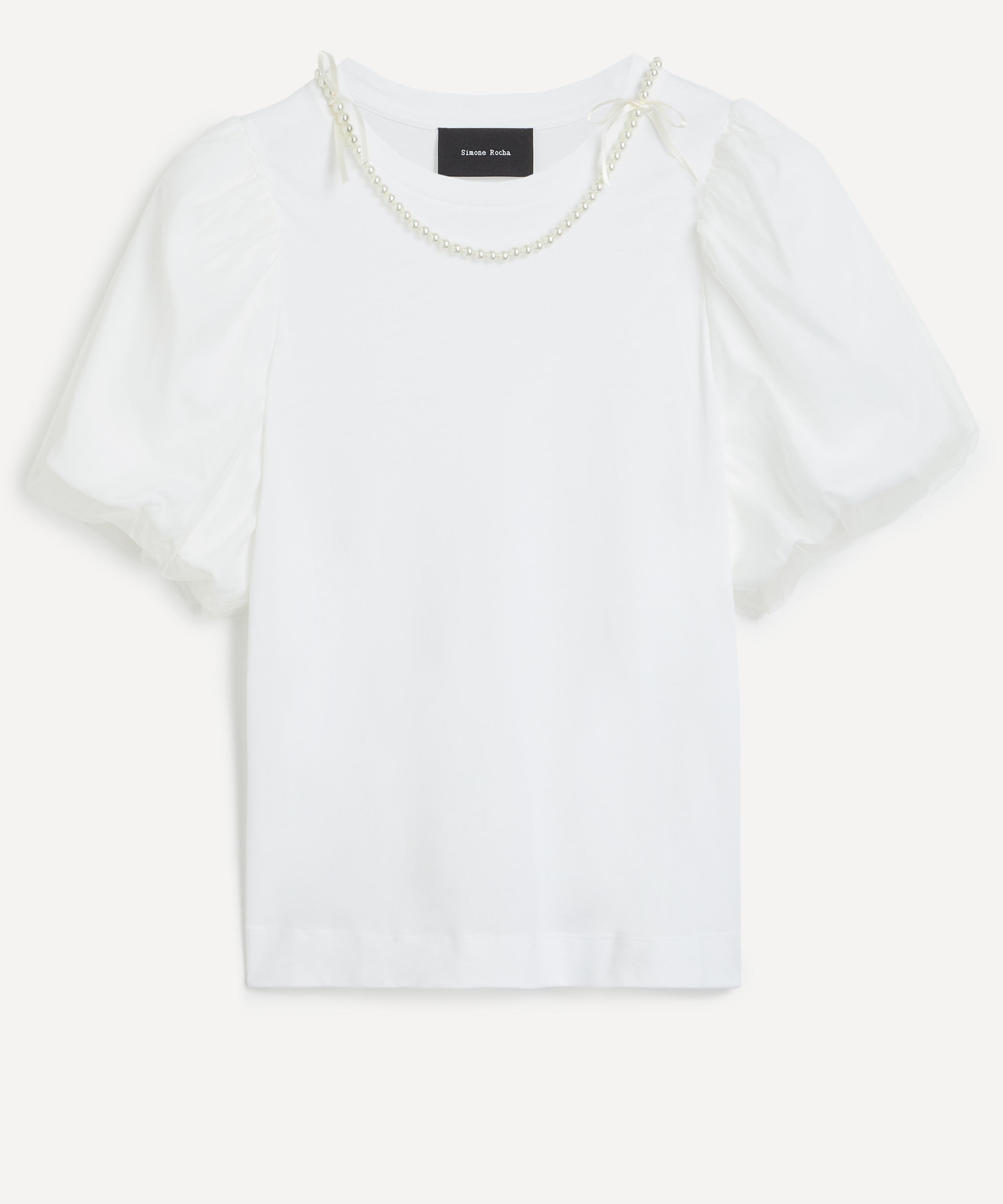 Crafted from lightweight cotton jersey, this white t-shirt features voluminous puff sleeves with tulle overlay, and is accented with delicate pearl embellishment along the neckline for a touch of romantic elegance.