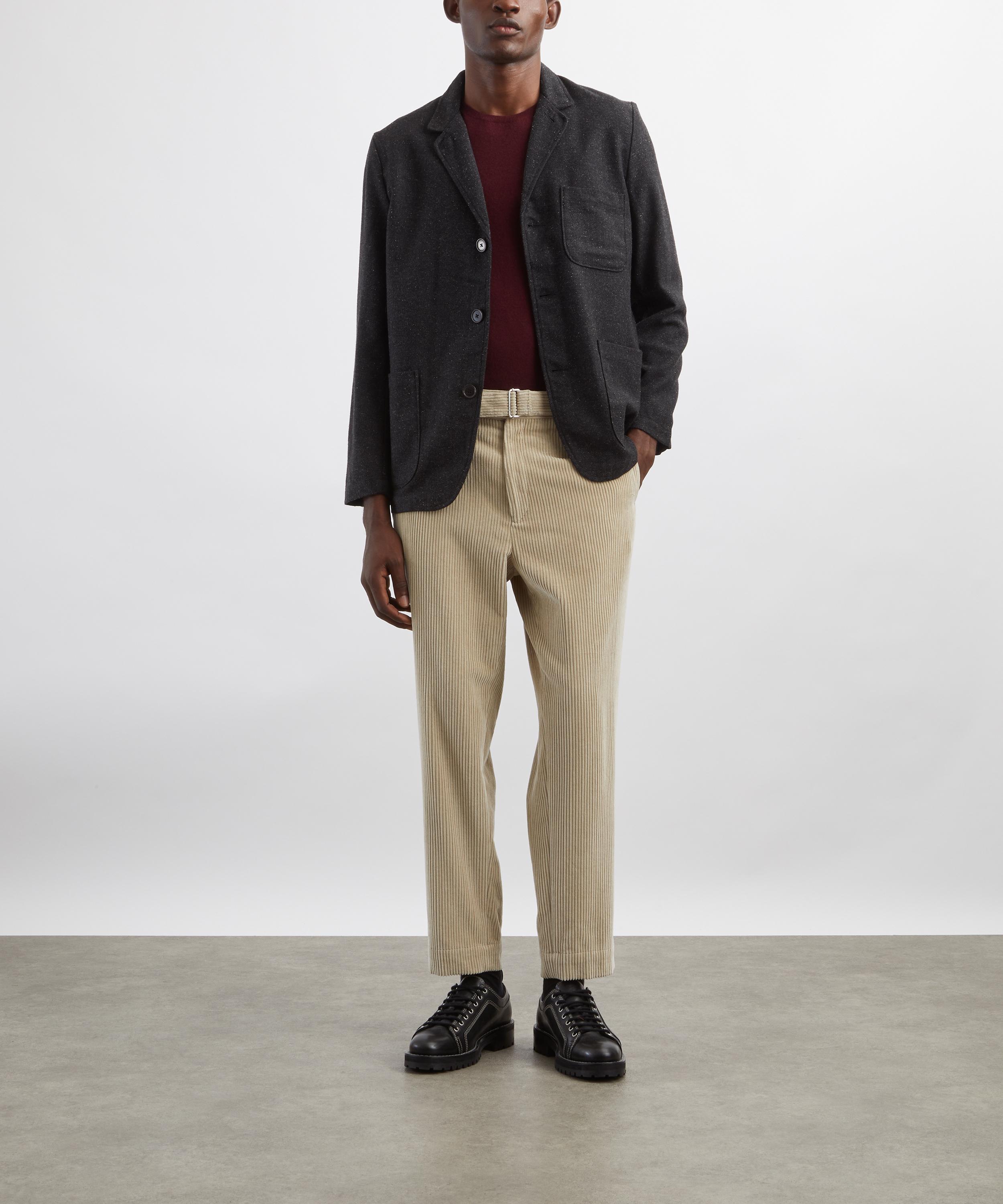 Cut from herringbone tweed, it features raglan sleeves for a relaxed fit and a neat spread collar. Versatile and effortlessly stylish, it pairs perfectly with single-pleat trousers for a modern, sartorially polished ensemble.