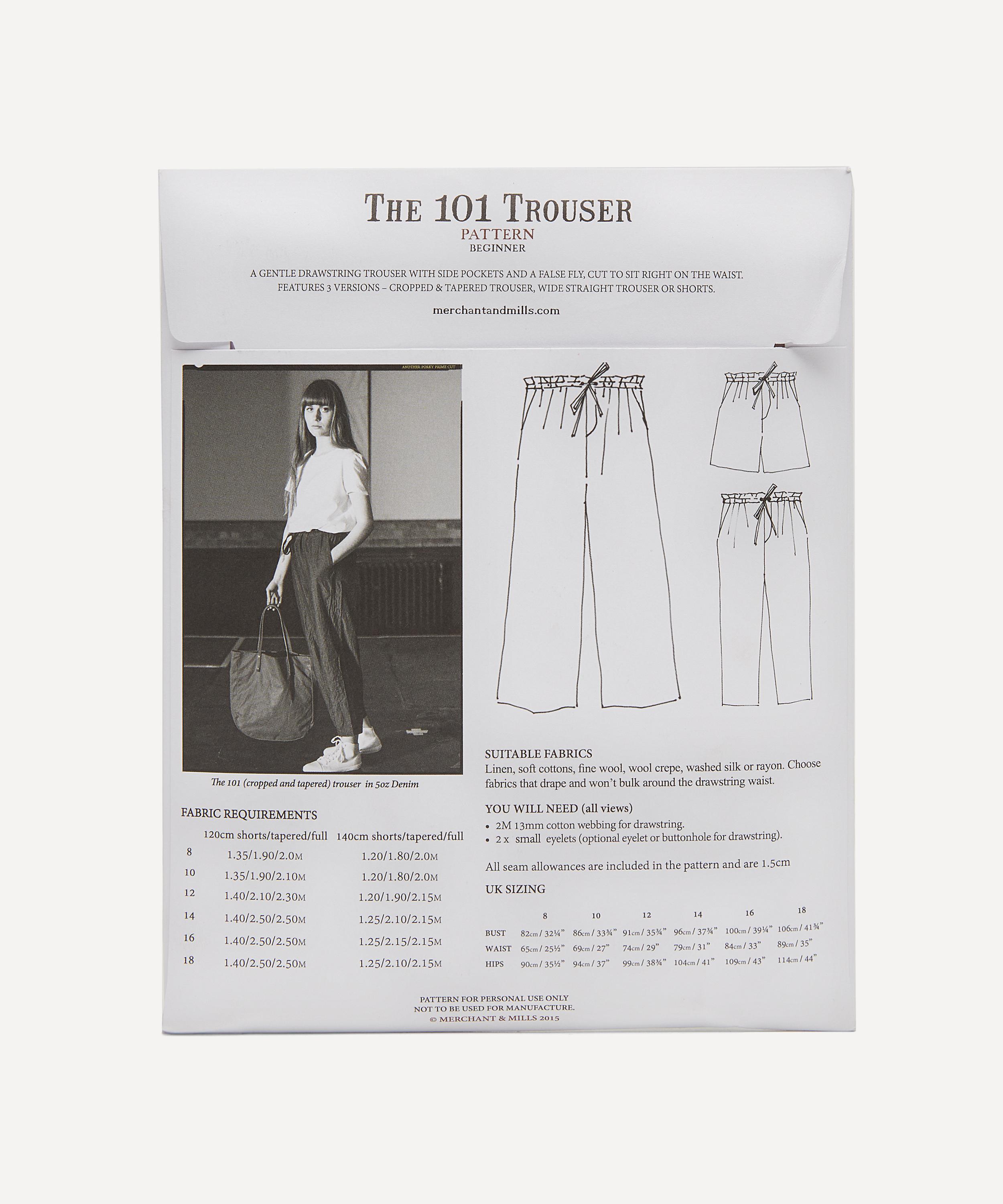 This pattern was developed over several months by Merchant & Mills, to help you craft a bespoke garment to suit your own specifications. Adjustable for sizes 8-18, the 101 Trouser pattern can be customised as cropped and tapered, wide and straight, or even as shorts. The pattern works well with a wide variety of fabrics, from chambray and twill to corduroy and light denim.