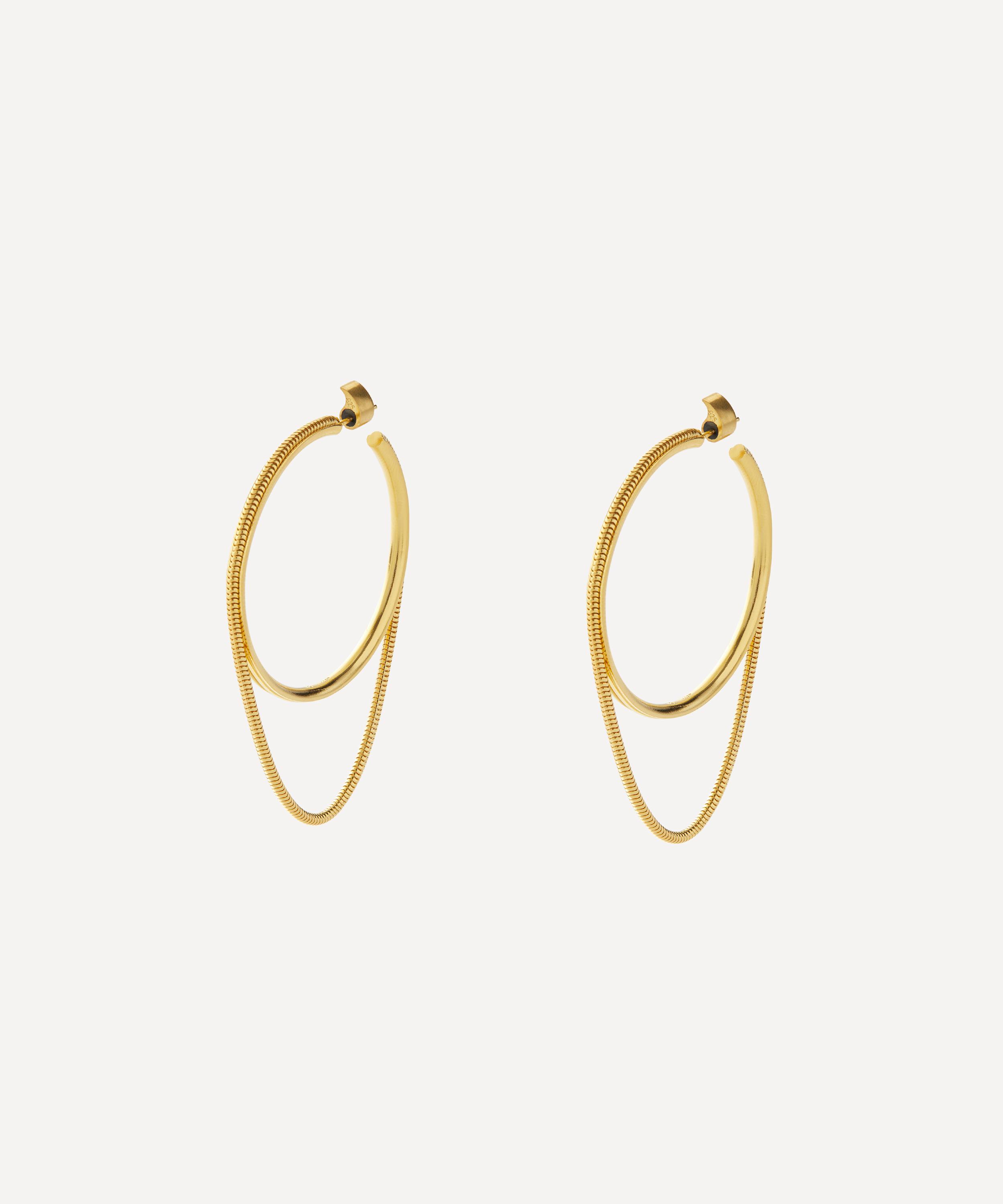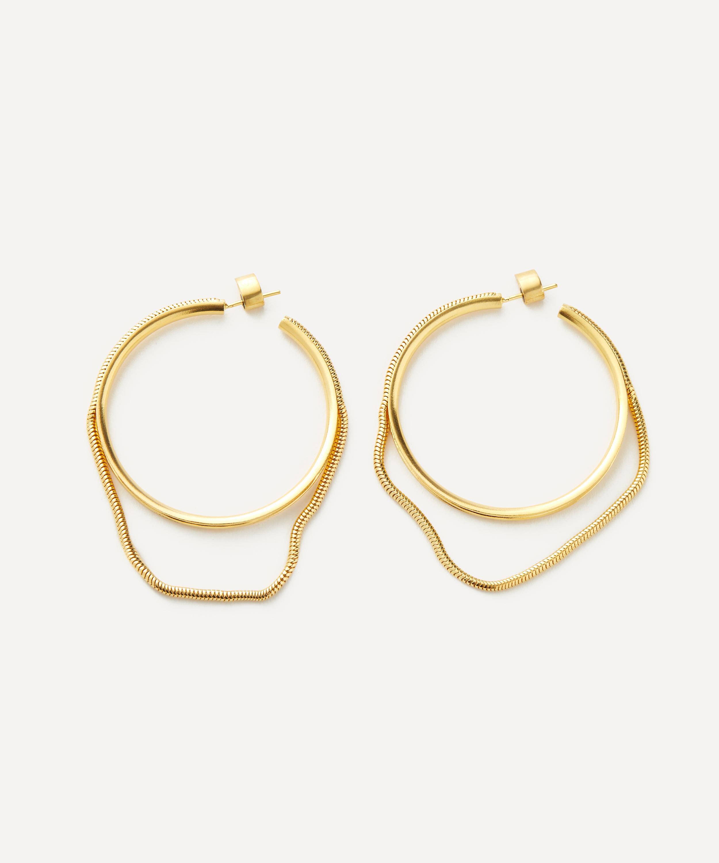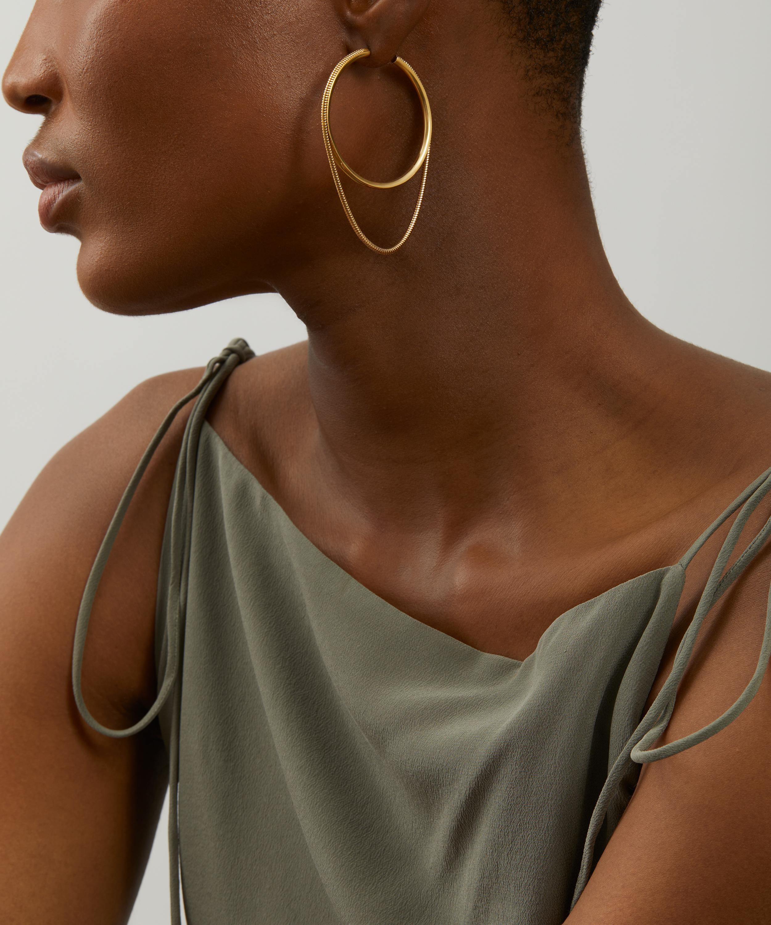 Maggoosh is an extension of the body’s natural movement fashioned into fluid forms, here expressed in the Twinkler hoop earrings. Crafted from 10ct gold and gold-plated silver, each earring features a slim, polished hoop adorned with a snake chain. Style yours with complimenting pieces from the brand’s extensive collection, or favourites from your own jewellery archive.