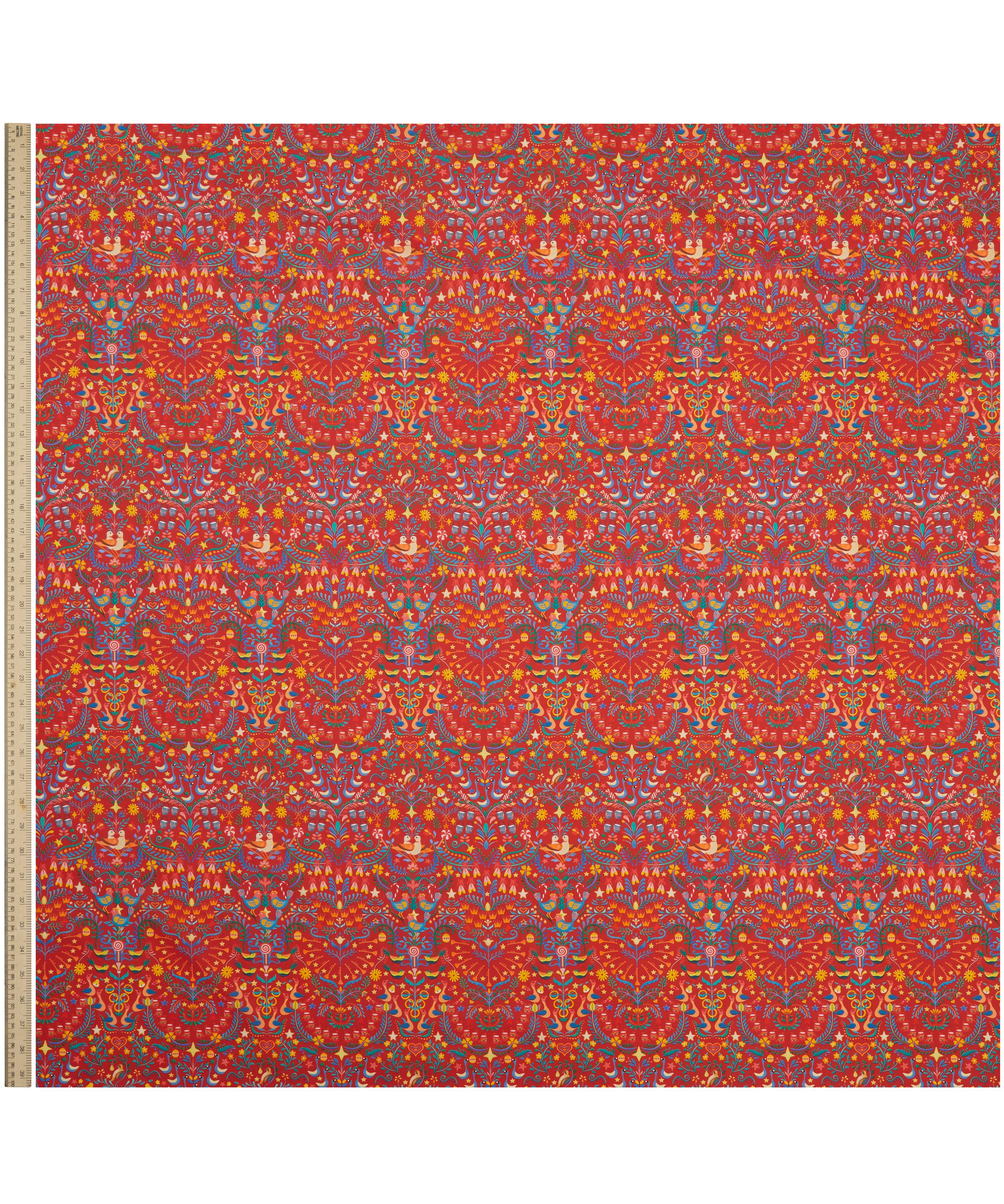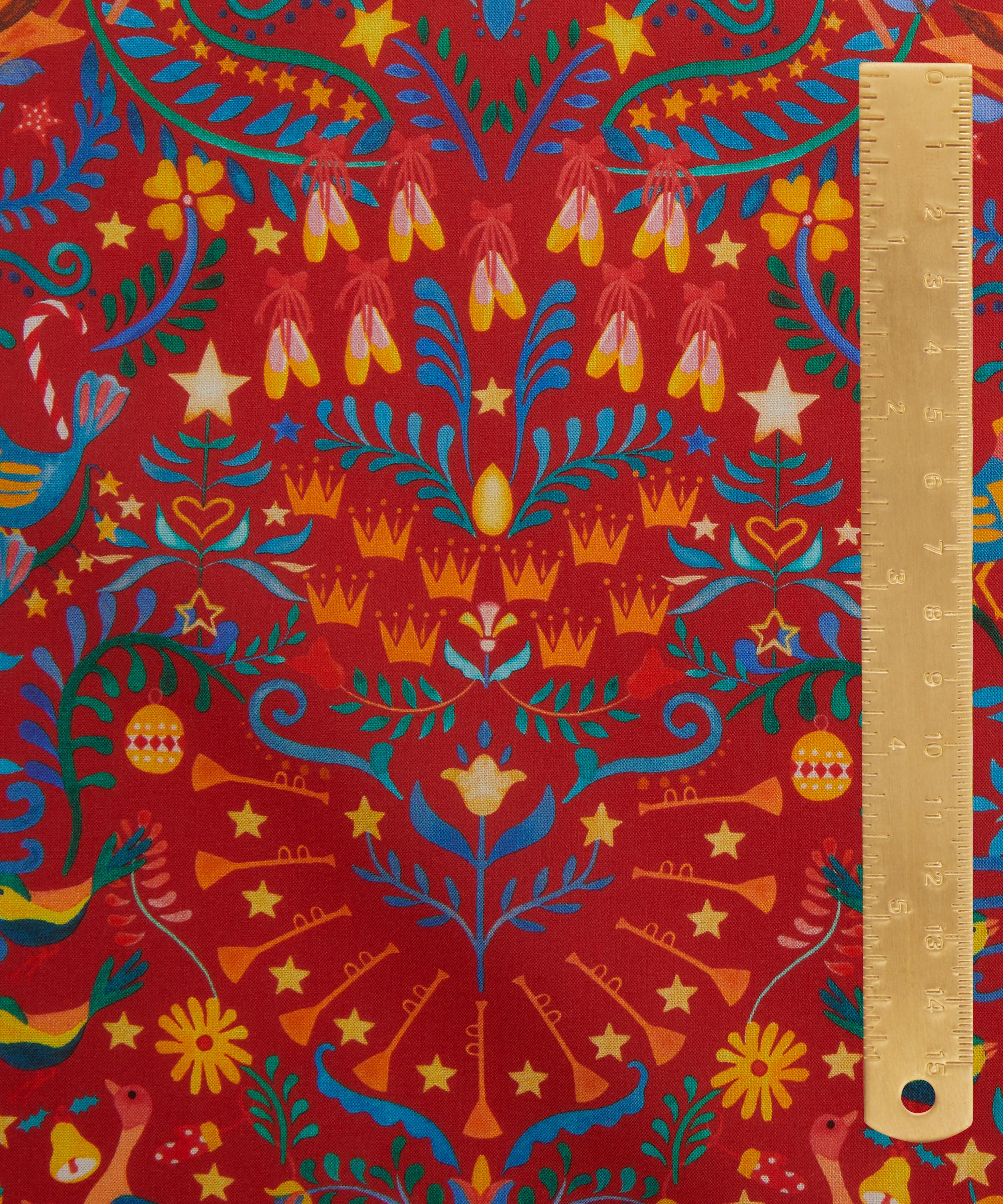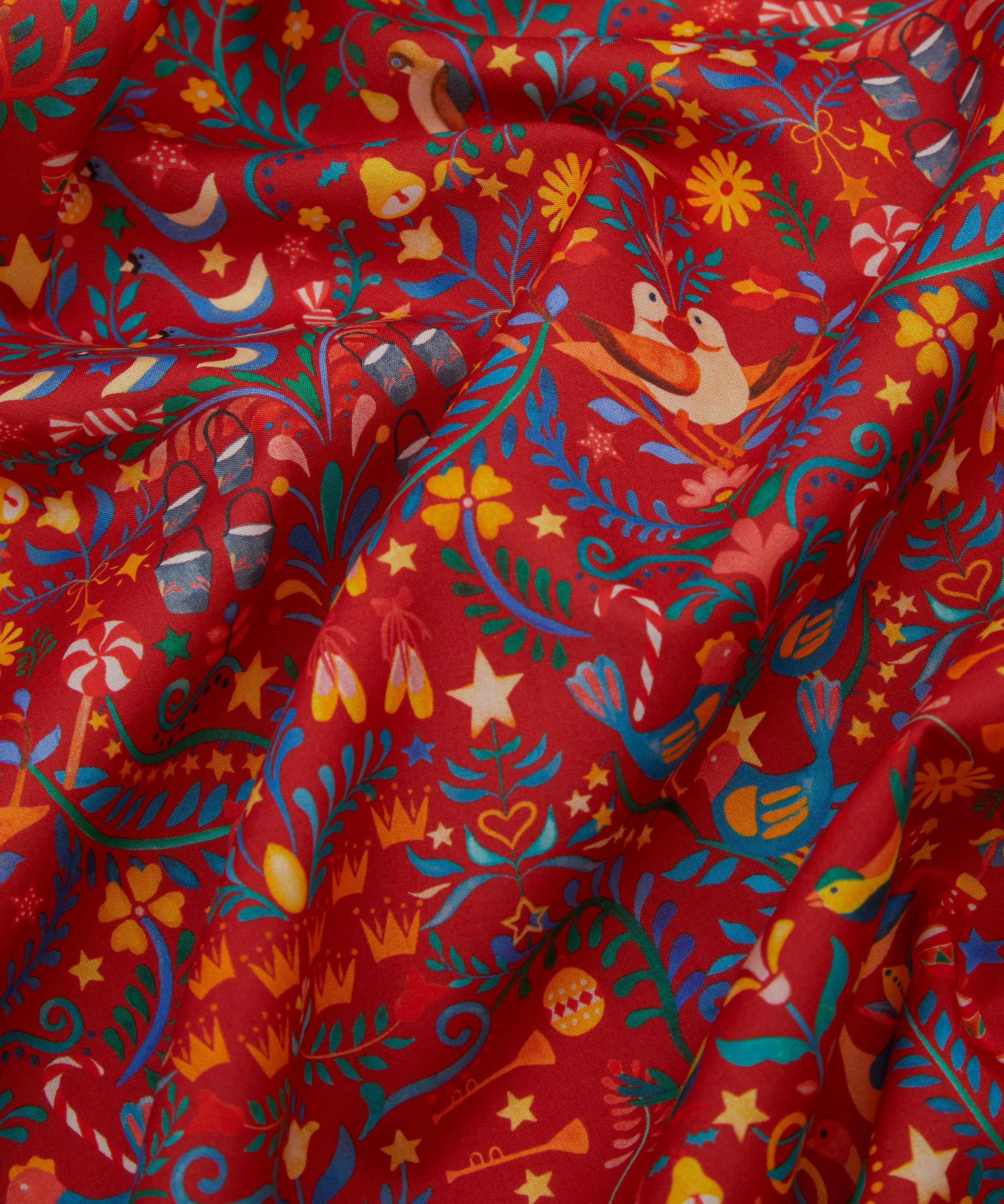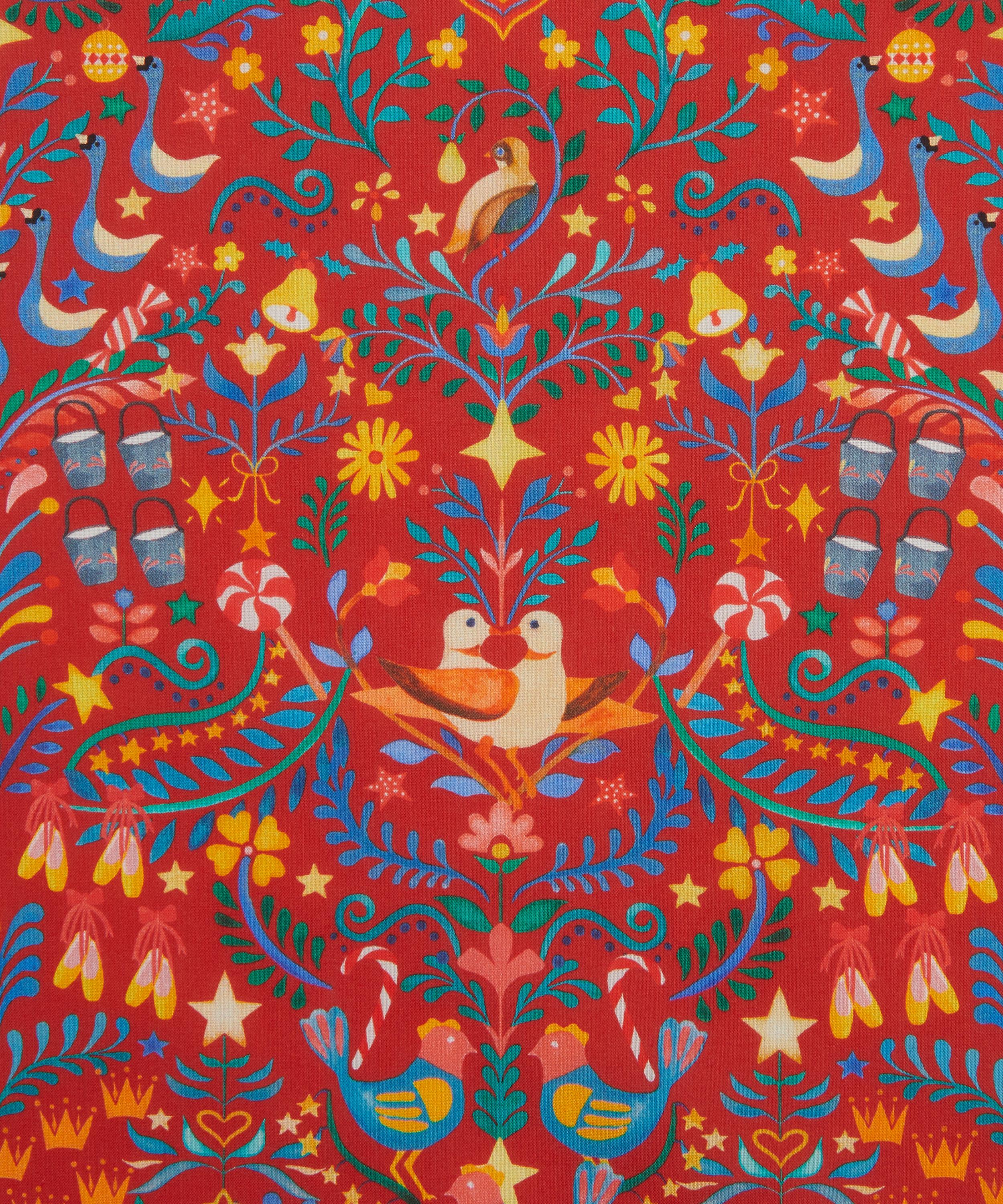 Influenced by folk art, this joyful Arts and Crafts style print is a dazzling representation of the gifts given in the famous Christmas Carol, The Twelve Days of Christmas. Painted in bright watercolours, gifts are intertwined with swirling foliage and scattered stars, imaginatively paying homage to the traditional aesthetic of Liberty design.
