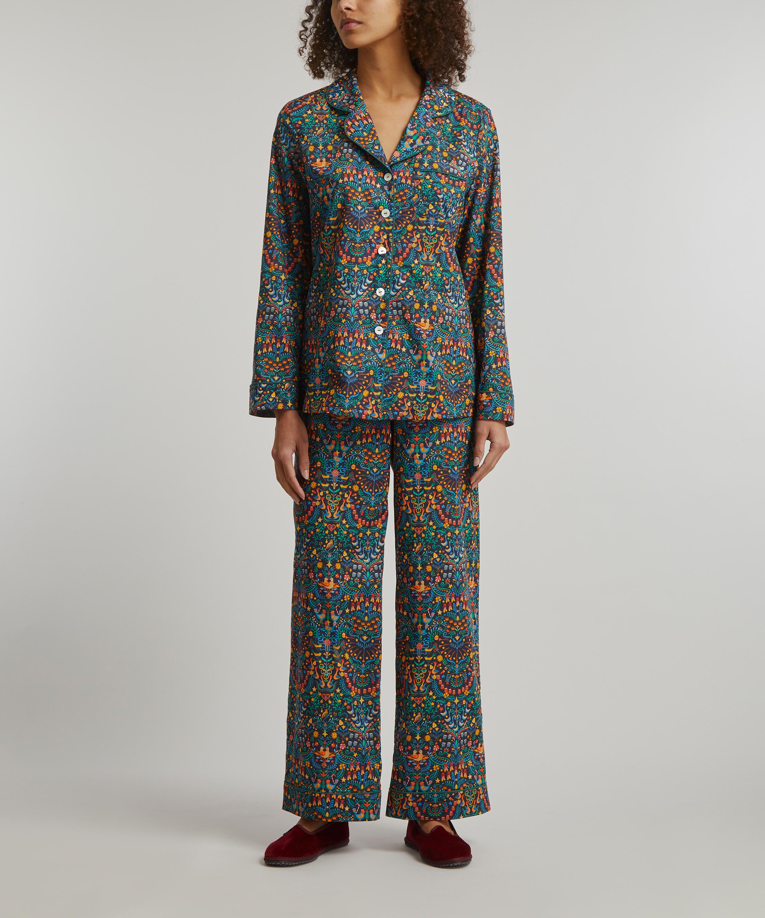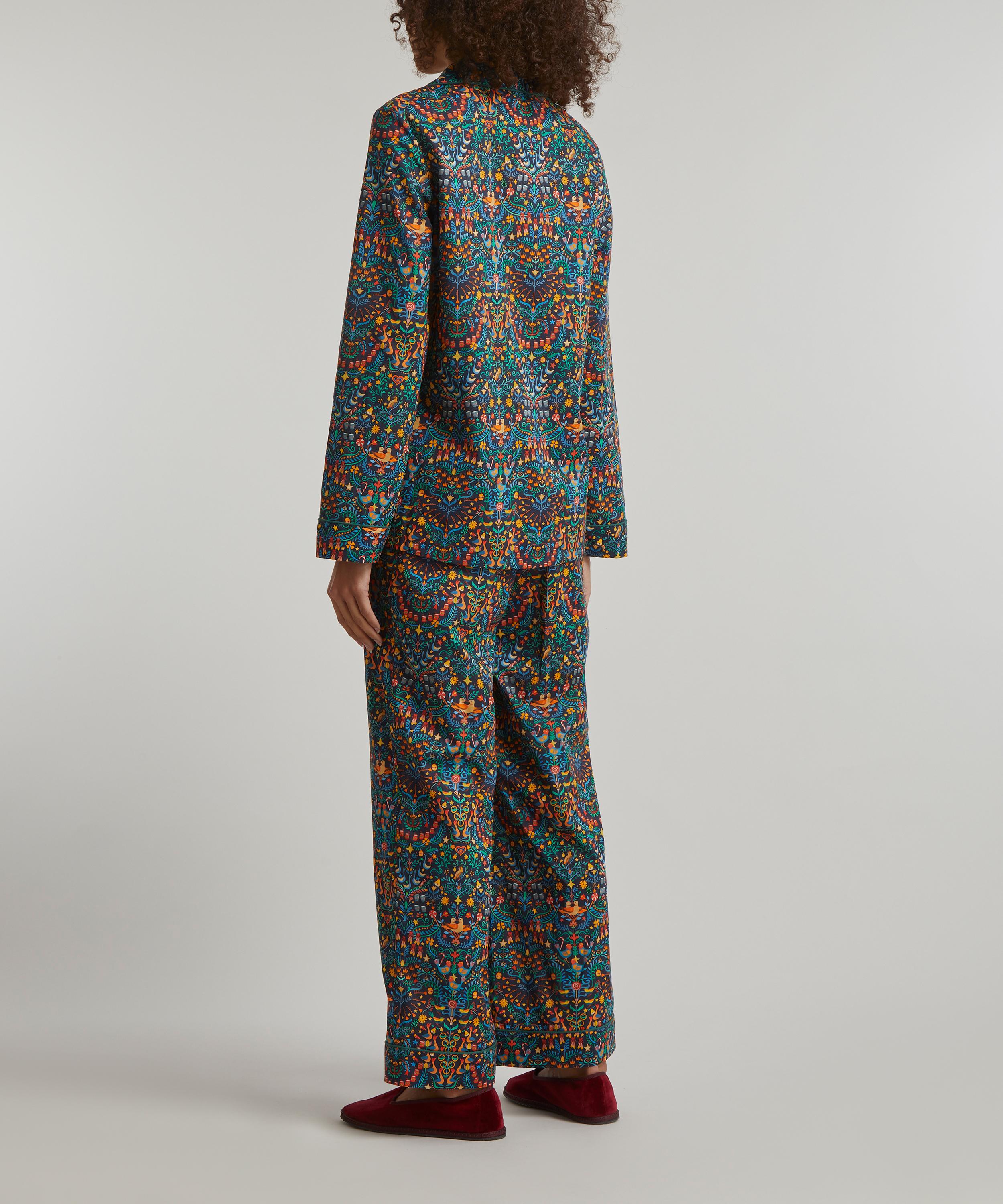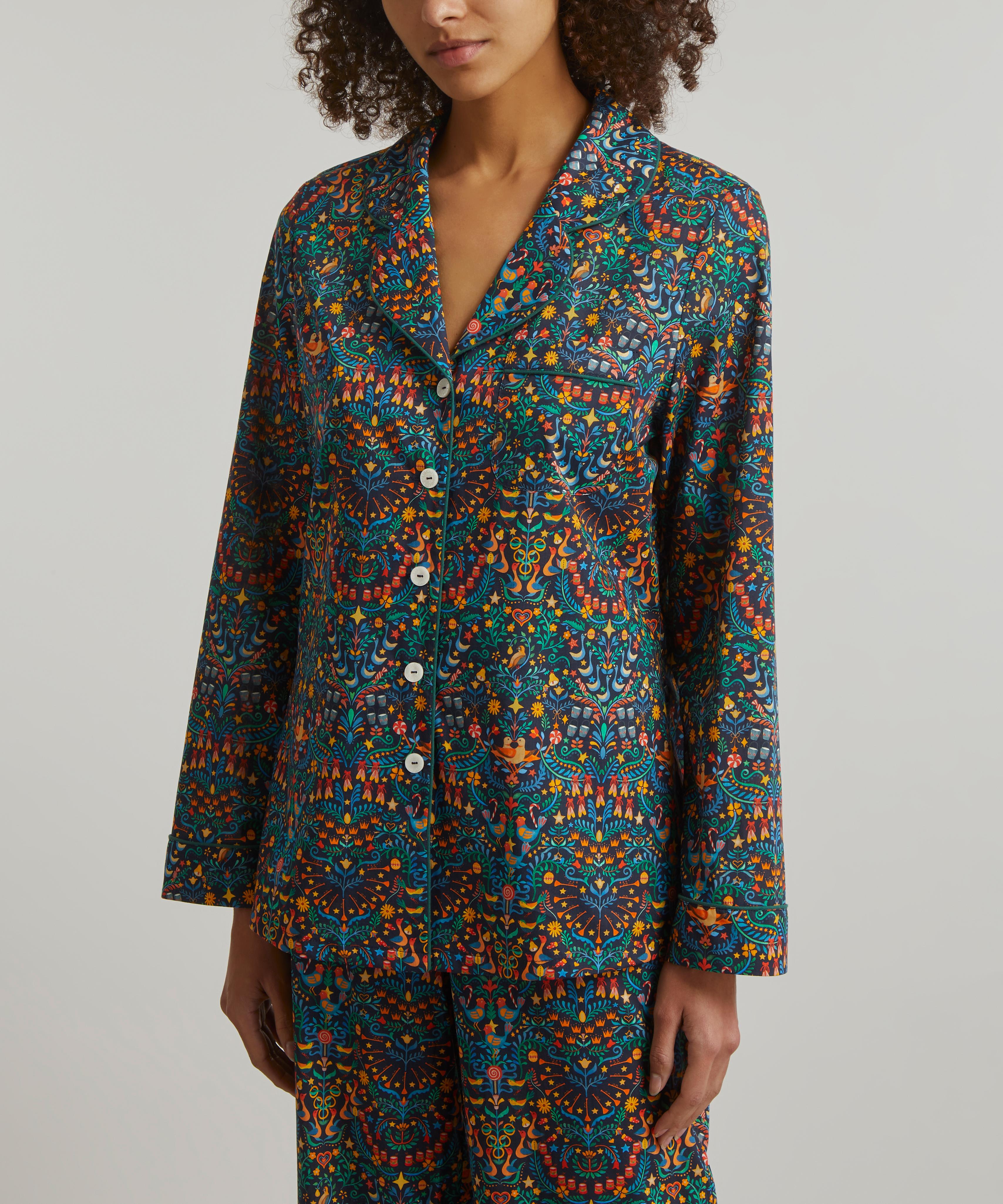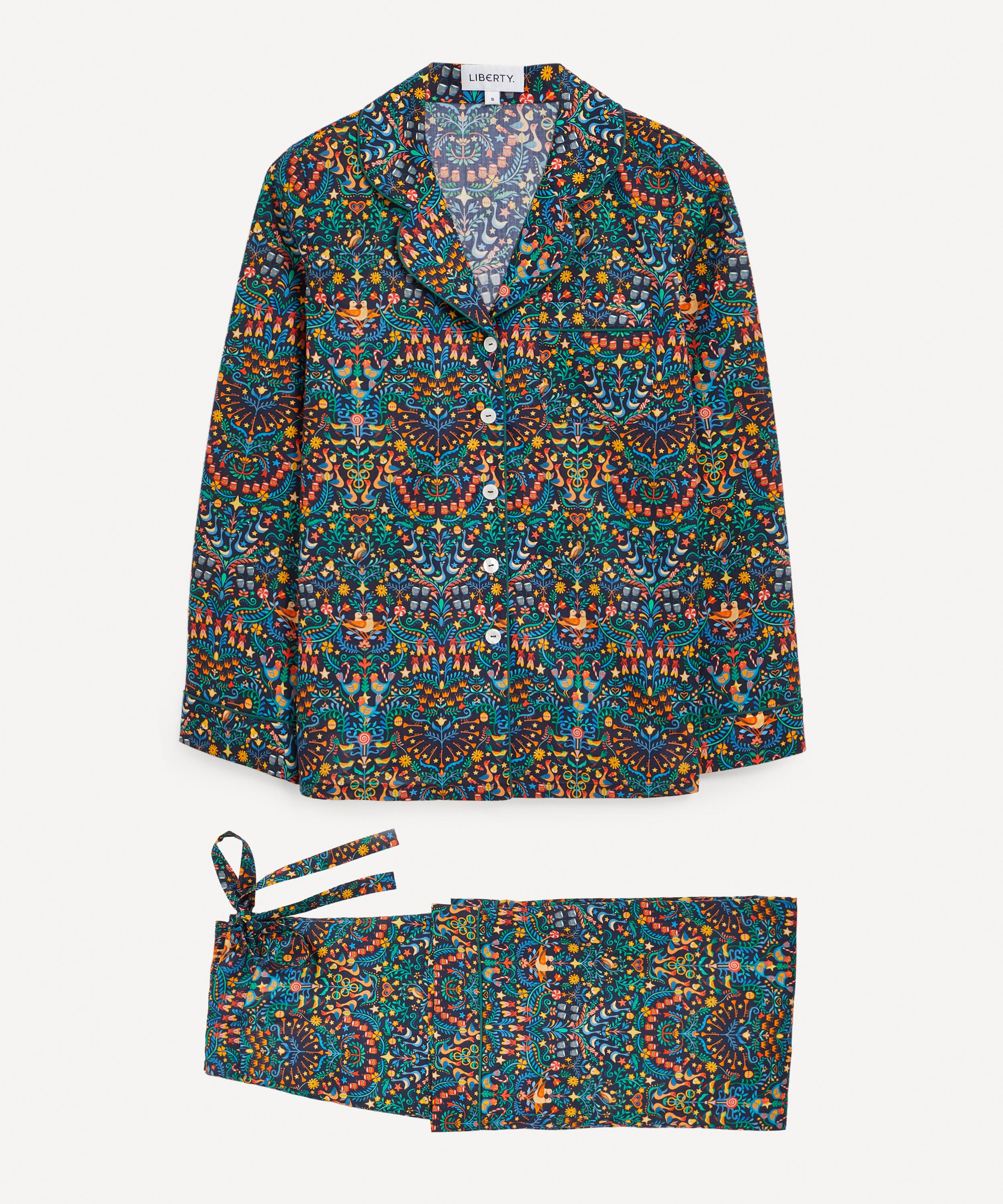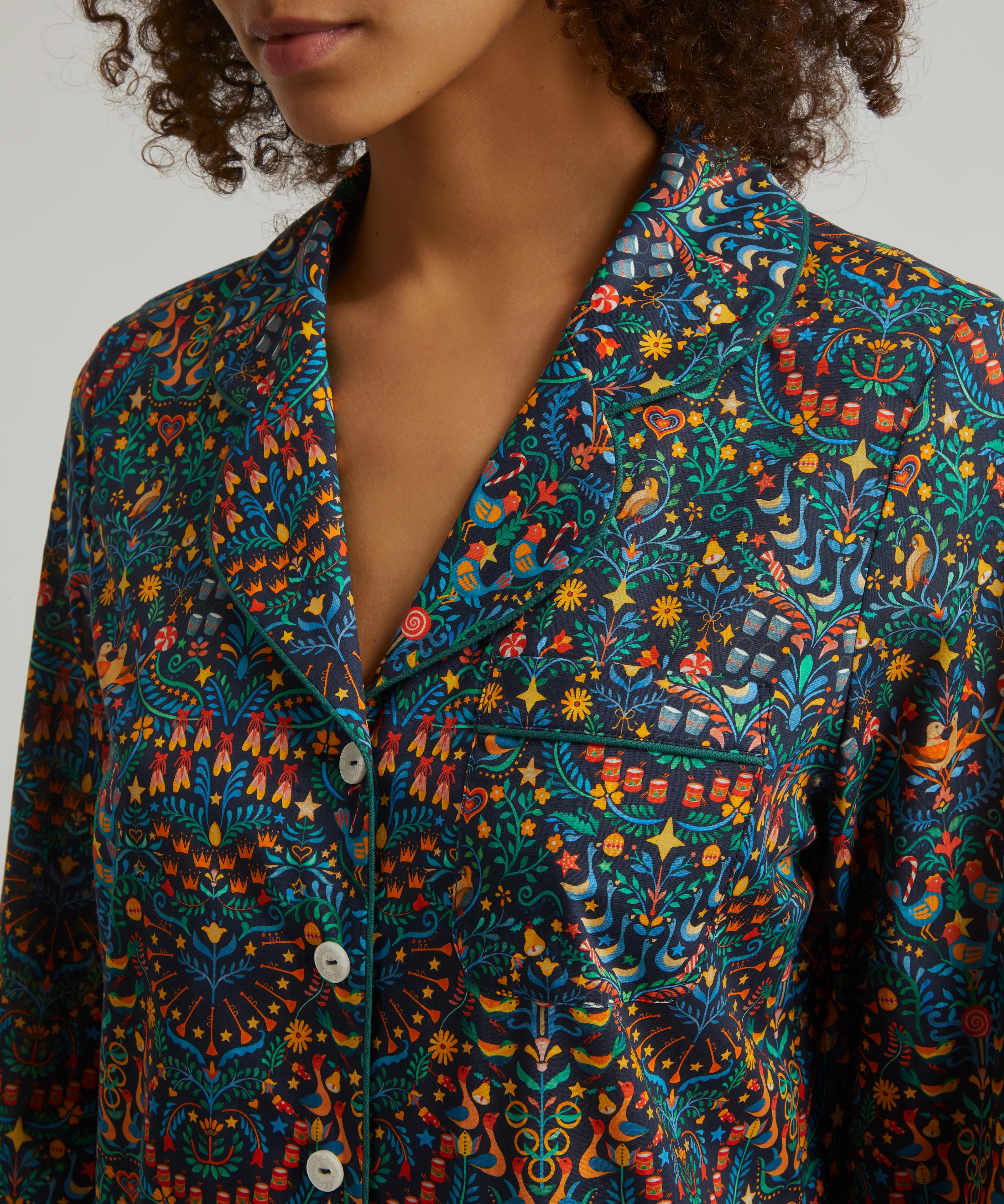 Tana is a true Liberty signature – a light, fluid revelation of a fabric that we’ve been perfecting for over a century, ultra-smooth to the touch and ideal for keeping cosy yet cool at night. Finished with elegantly piped trims, notched lapels and an adjustable drawstring waist, this traditional two-piece pyjama set spotlights our festive 12 Days of Christmas print – influenced by folk art, this joyful Arts and Crafts style design is a dazzling representation of the gifts given in the famous Christmas Carol, The Twelve Days of Christmas.
