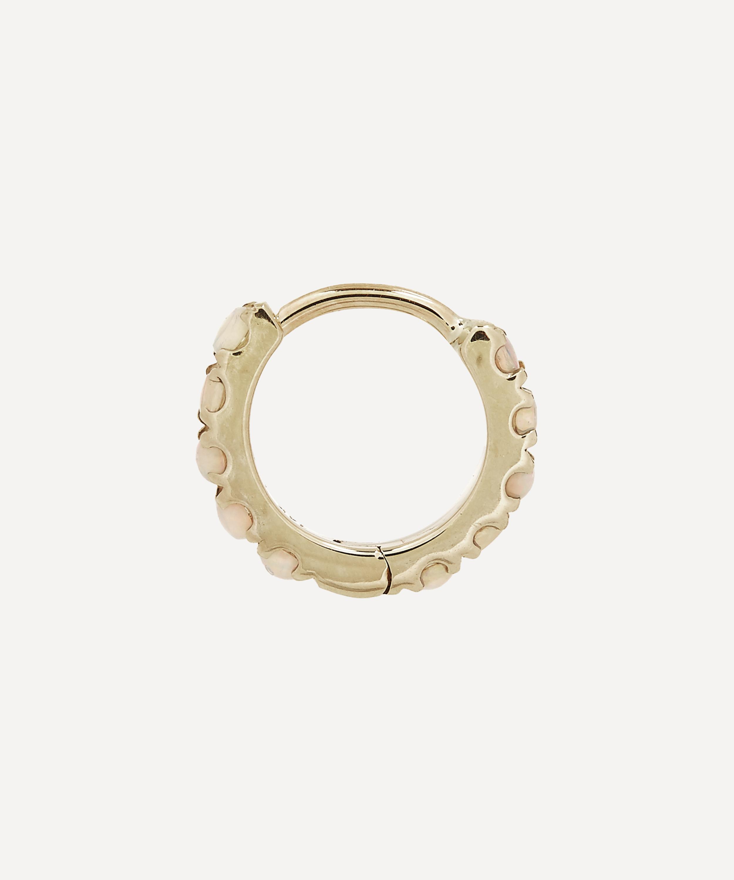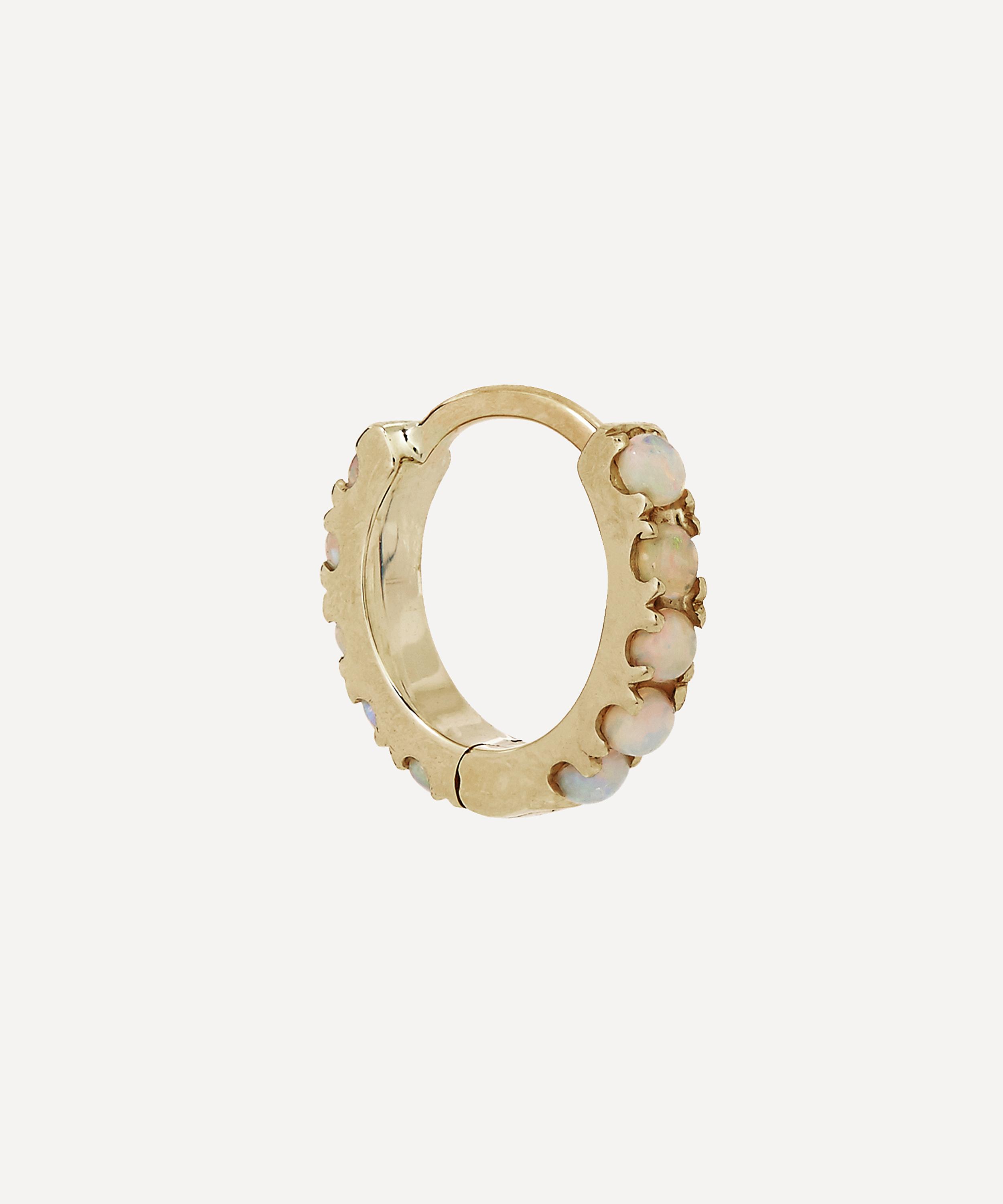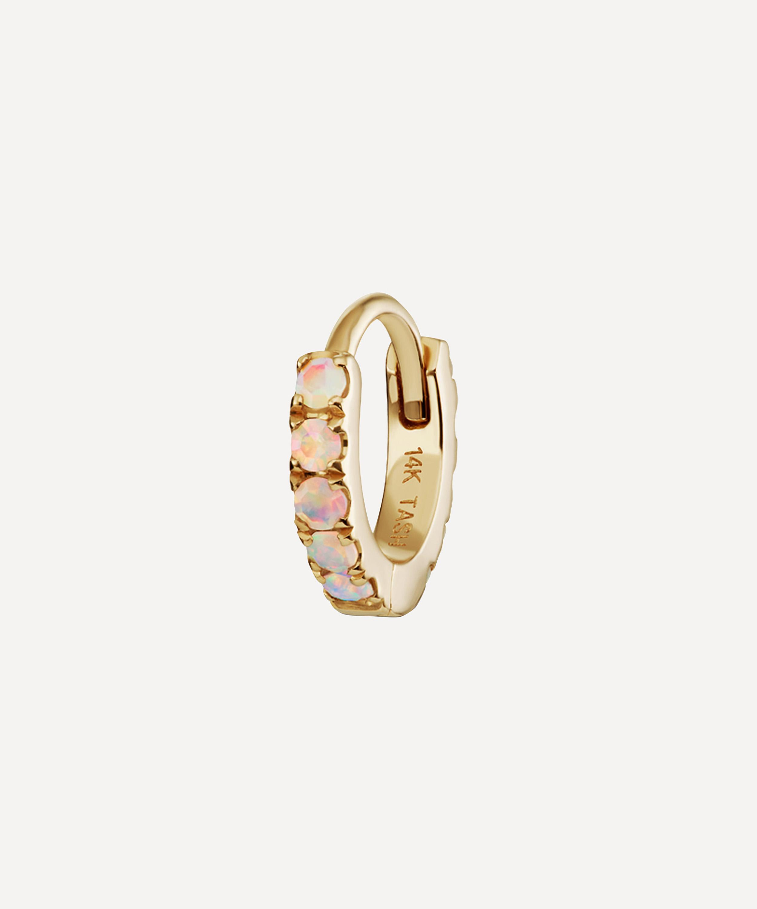 Available in multiple variations of high-polished 14 carat gold, this eternity hoop earring is set with 10 natural Australian opals for an exquisite, iridescent shimmer. Complete with an endlessly convenient clicker fastening, it styles beautifully in helix, rook and lobe piercings, with the helix offering a slightly looser fit. The perfect starting point for a show-stopping ear curation, try yours with gem-encrusted studs and stacks of huggie hoops for the full Tash effect.
