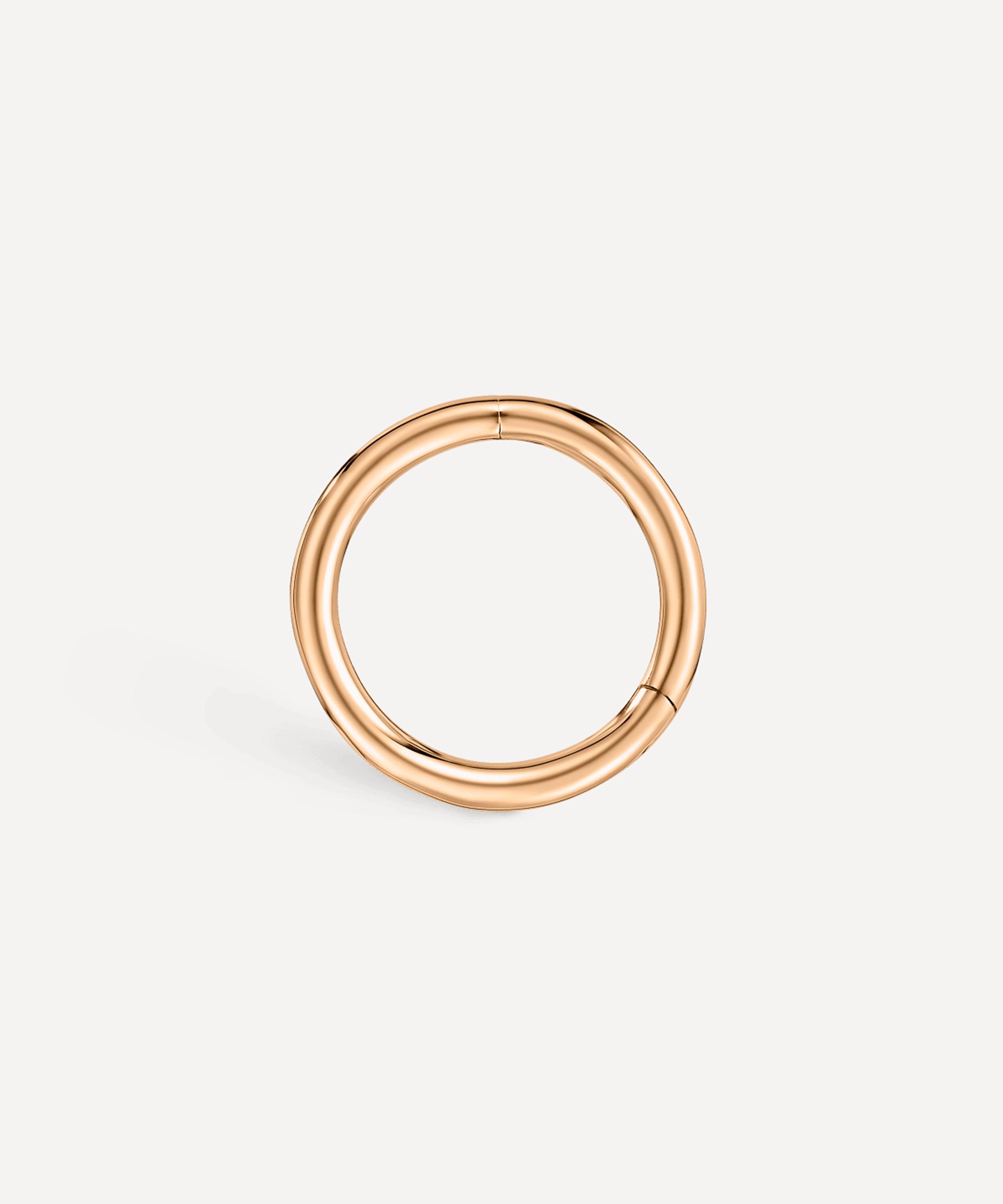 Available in multiple variations of high-polished 14 carat gold, this understated ring is the perfect starting point for any curation of hoops, from ultra-minimal to heavily embellished. Complete with an invisible clicker fastening that allows it to rotate freely in the ear, this piece styles beautifully in helix, rook and lobe piercings, with the helix offering a slightly looser fit. Try yours with diamond-encrusted studs and stacks of huggie hoops for the full Tash effect.