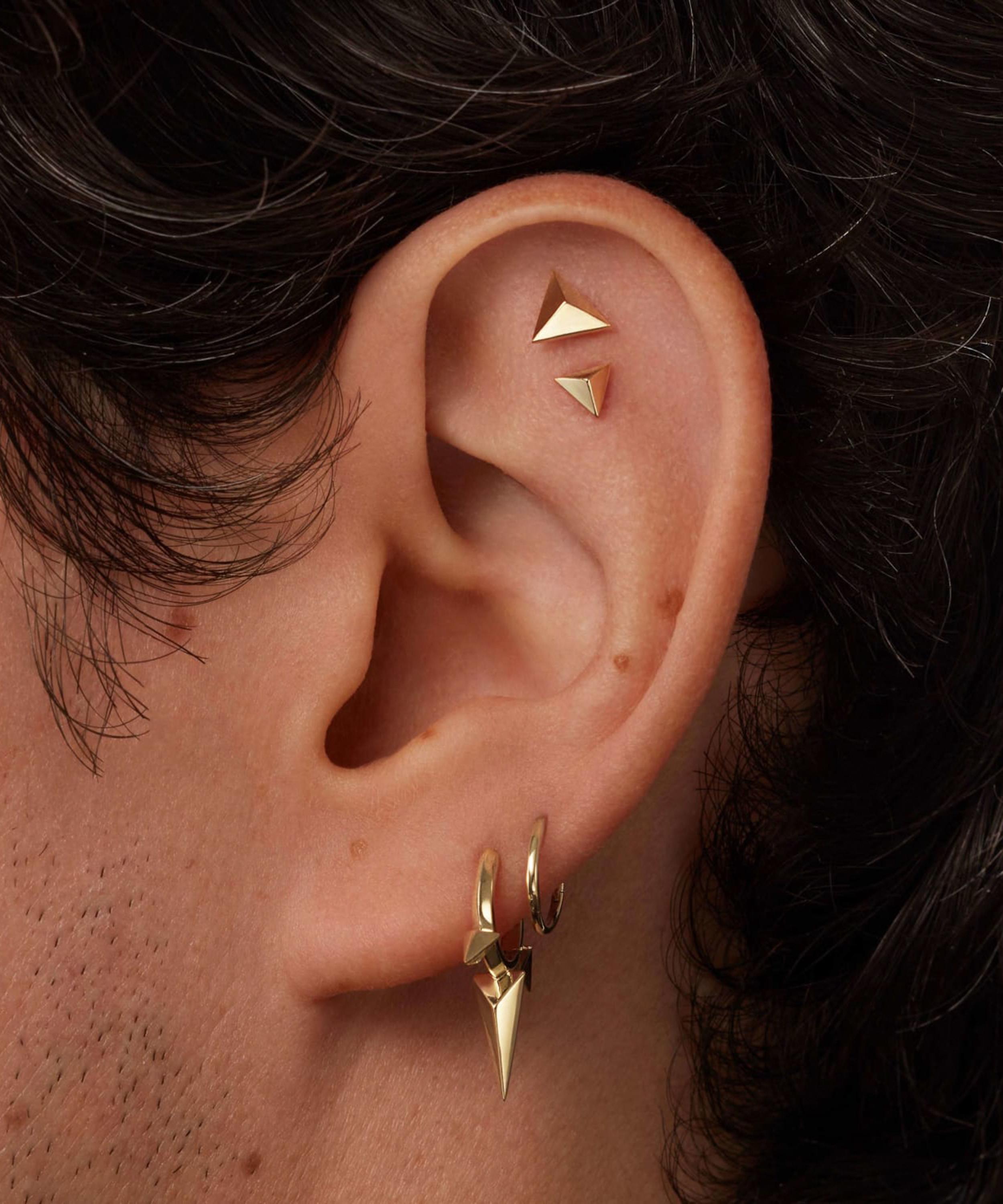 Available in multiple variations of high-polished 14 carat gold, this petite stud earring features a faceted triangle design – offering a punk-inspired touch. Complete with the brand's signature threaded backing, it styles beautifully in a range of lobe and cartilage piercings.