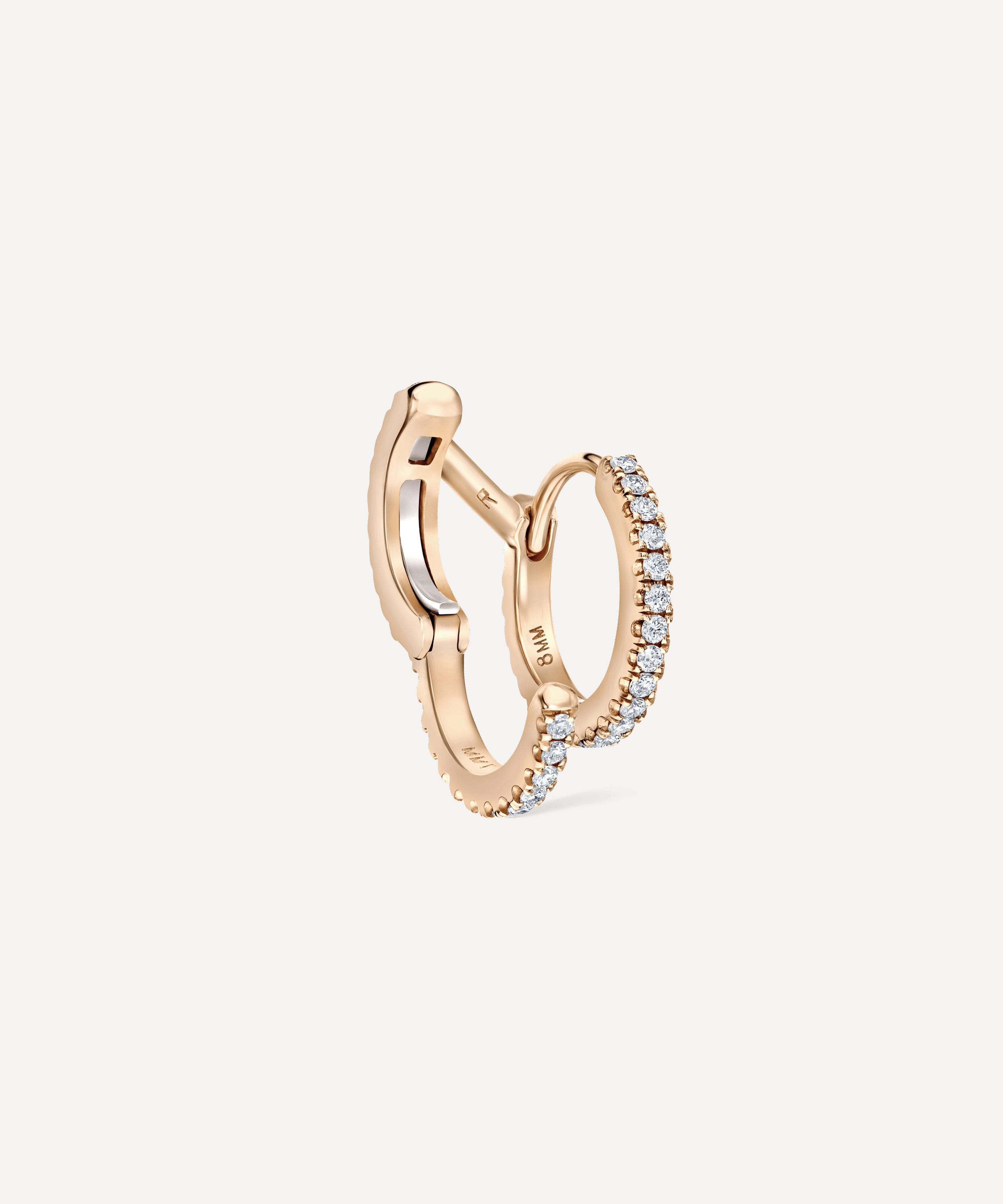 Inspired by Maria Tash’s eternity rings, this two-in-one single hoop earring from styles beautifully at the lobe. Available in multiple variations of high-polished 14 carat gold, it features a double linked silhouette – mimicking two piercings. The first ring fits into any lobe piercing and the second ring fastens as a cuff. Complete in an eternity-style, lined with sparkling diamonds, try layering it with a selection of small studs for a complexion-illuminating finish.