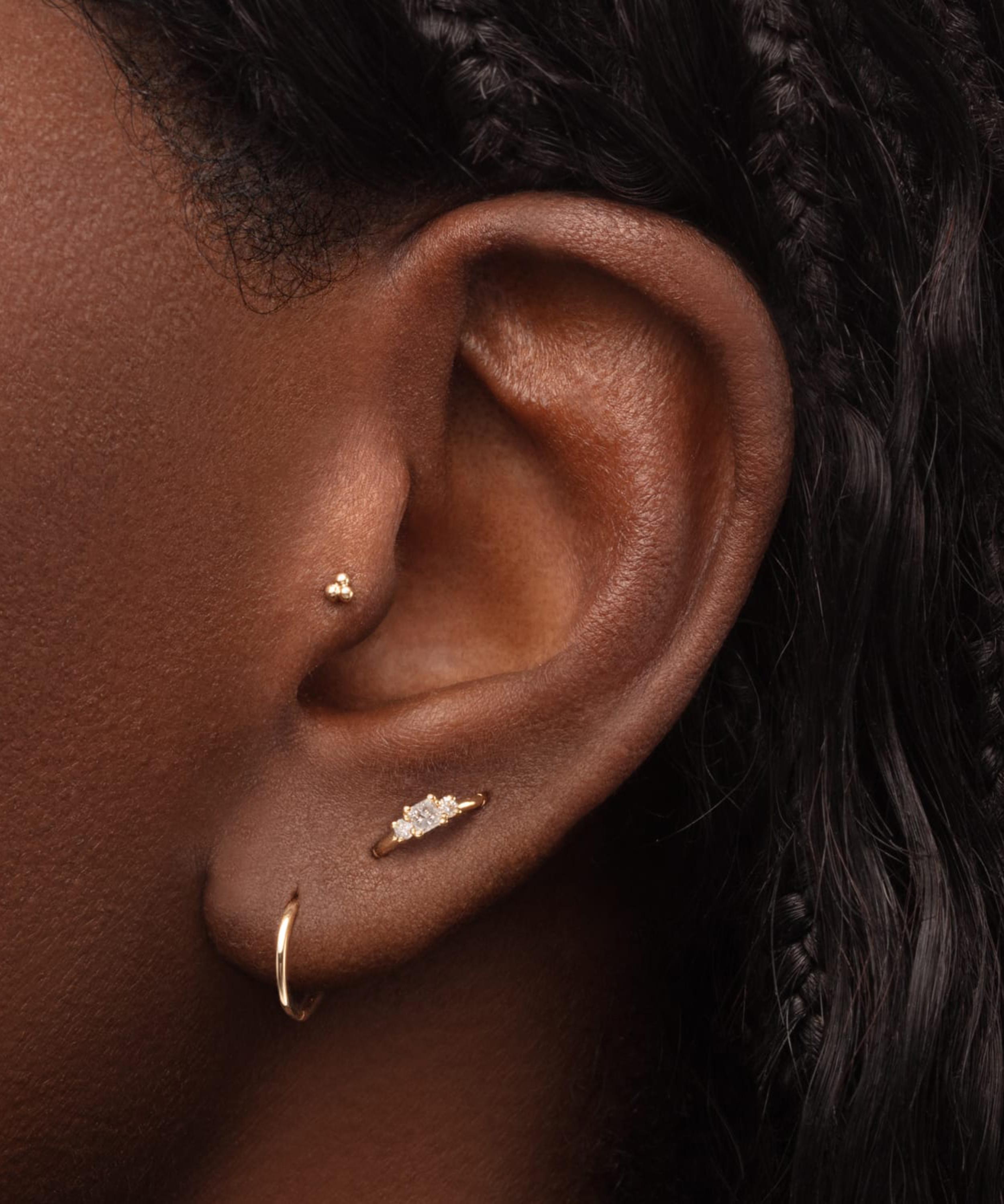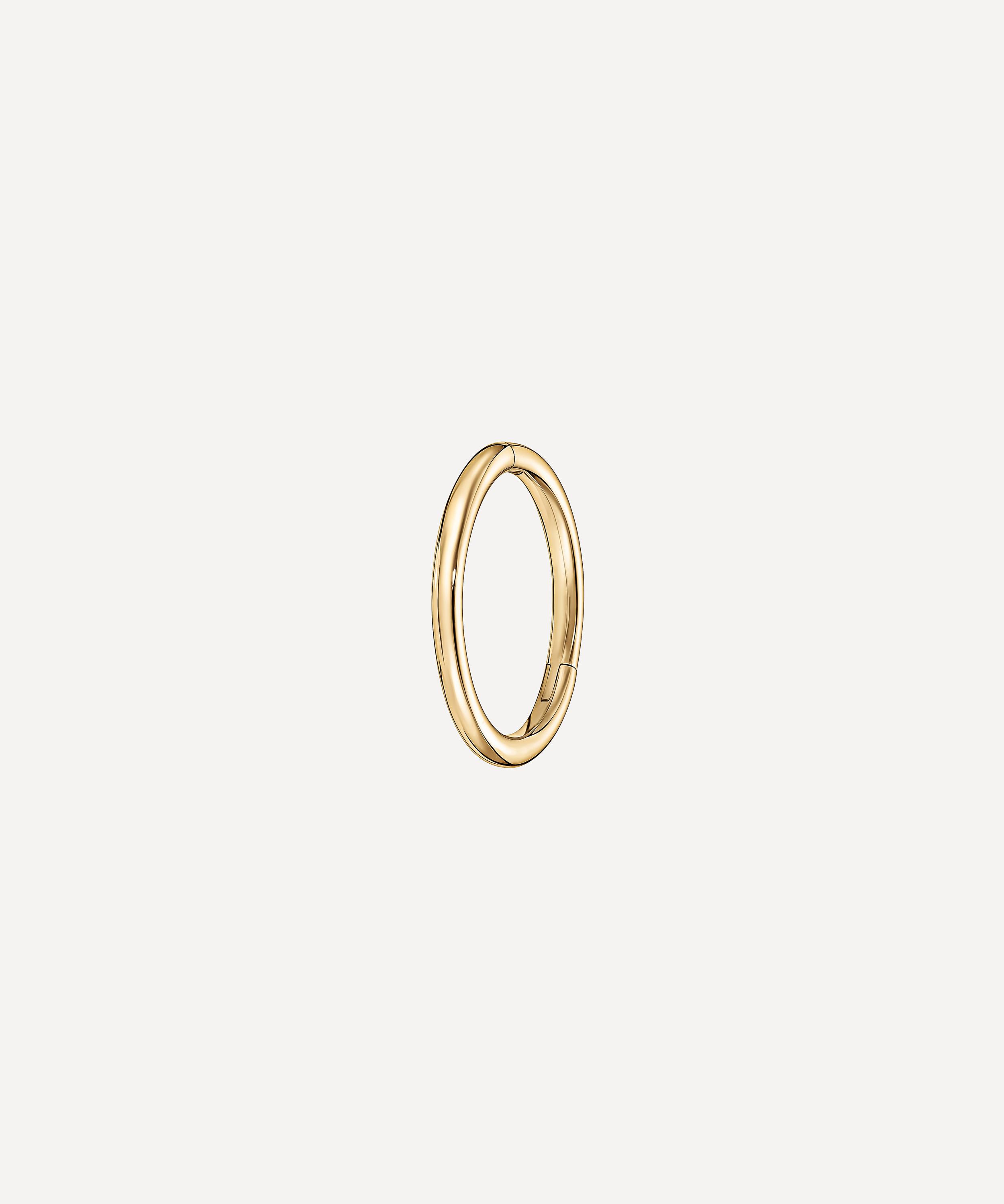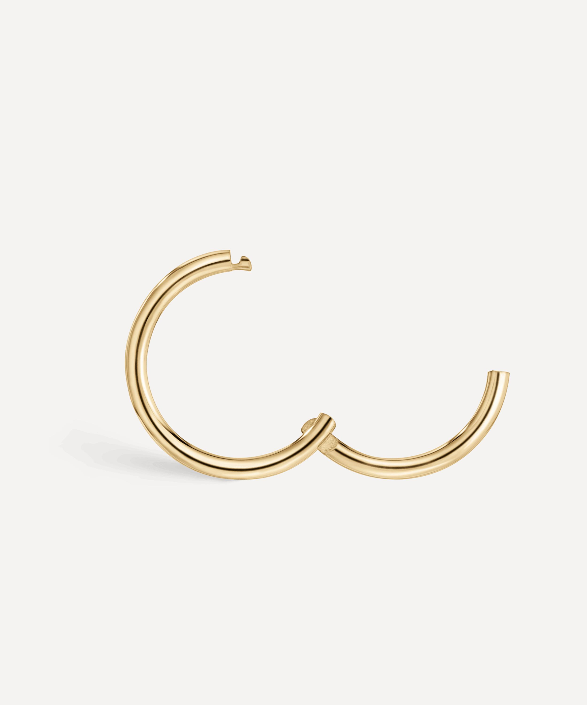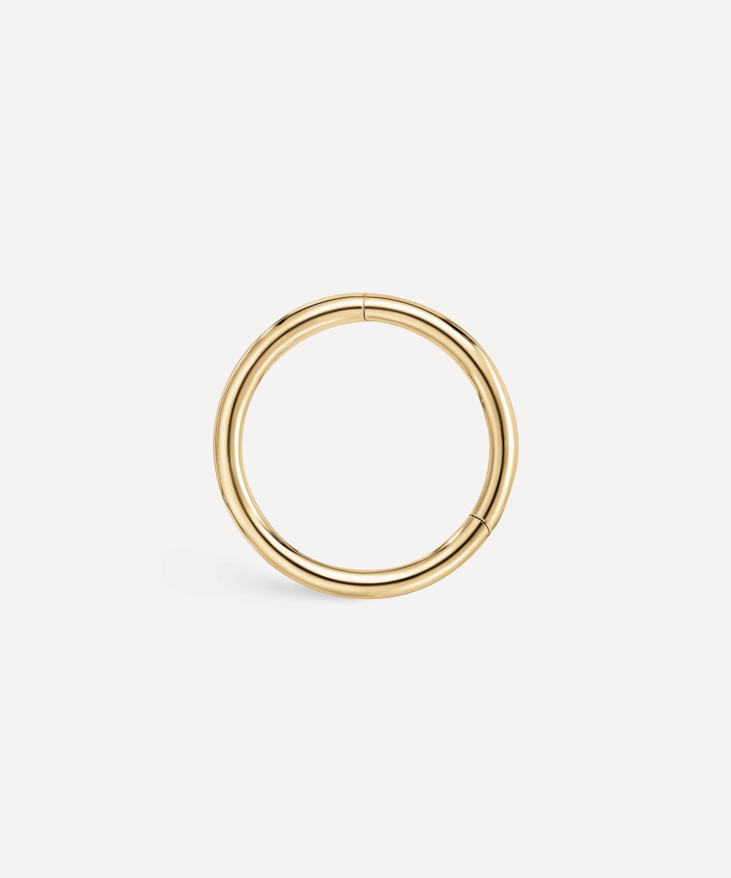 Available in multiple variations of high-polished 14 carat gold, this understated ring is the perfect starting point for any curation of hoops, from ultra-minimal to heavily embellished. Complete with an invisible clicker fastening that allows it to rotate freely in the ear, this piece styles beautifully in both helix and lobe piercings, with the helix offering a slightly looser fit. Try yours with diamond-encrusted studs and stacks of huggie hoops for the full Tash effect.