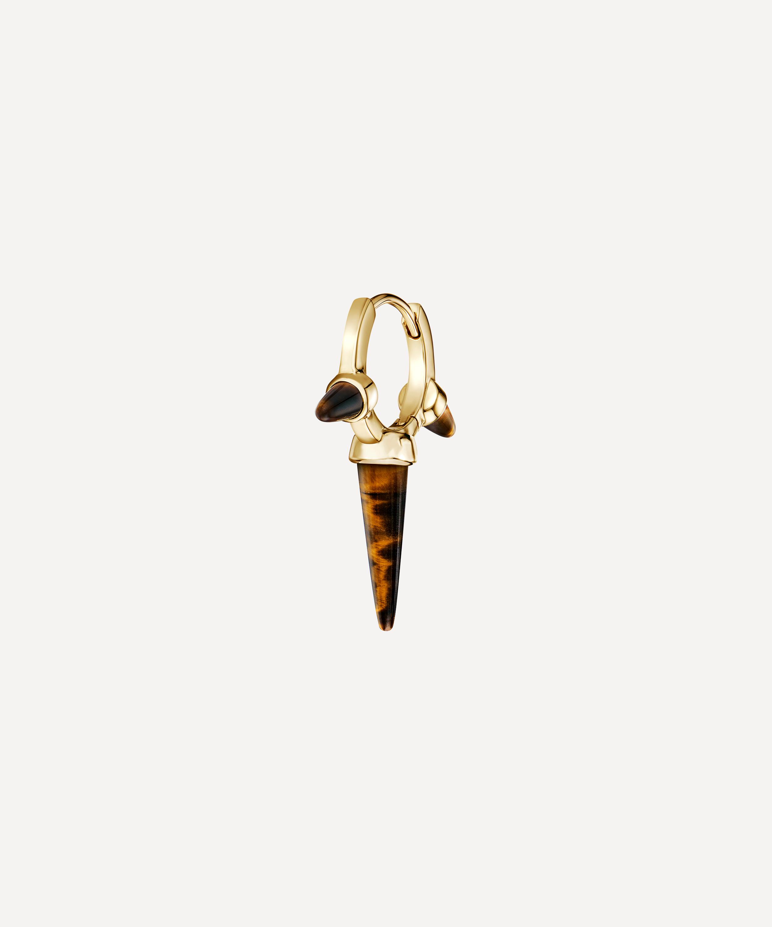 Exclusively crafted from high-polished 14 carat gold, this single hoop features a long tiger’s eye spike flanked by two shorter spikes, composed of rich hues from beige to dark brown. Complete with a convenient clicker fastening, it styles beautifully in both helix and lobe piercings - try yours with diamond-encrusted studs and stacks of huggie hoops for the full Tash effect.