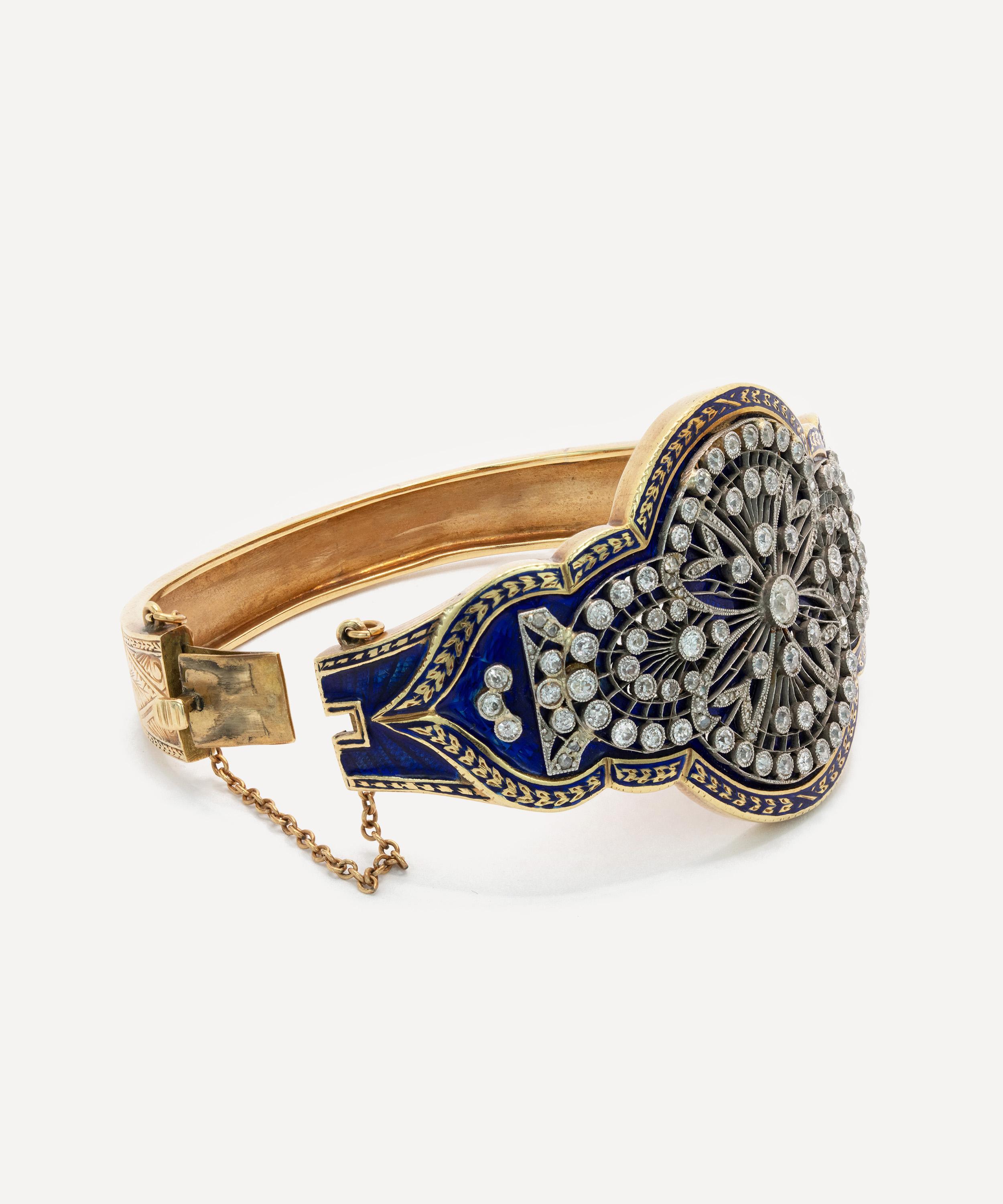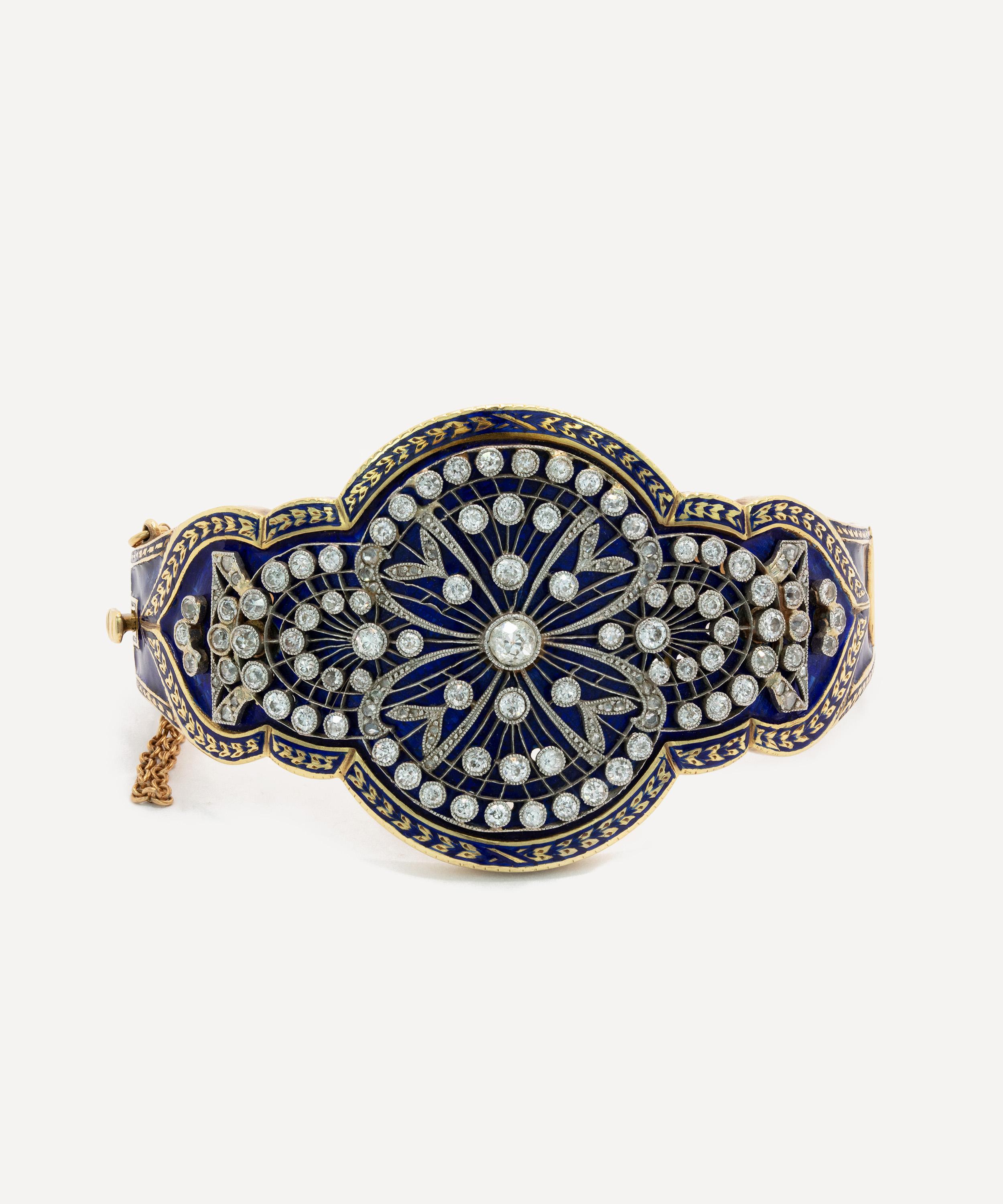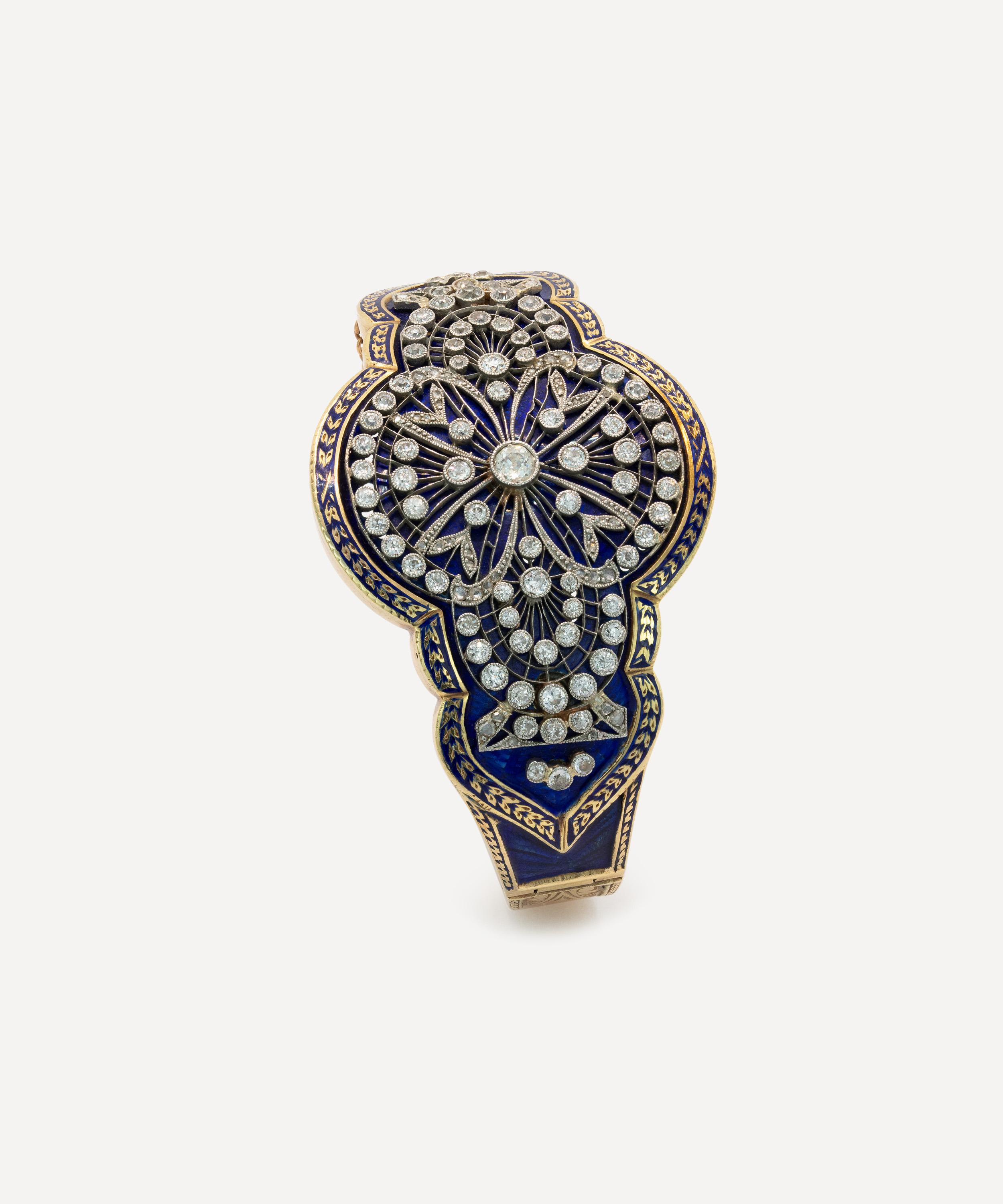 Invest in a piece from the past and express your unique style with this antique bangle bracelet from Kojis. Made from 14ct gold, it’s showcasing skilled, artisanal craftmanship, featuring a larger plaque that tapers towards the sides. Old and rose cut diamonds, bezel set in white with a milgraine finish adorn the dark blue enamel coating, whilst gold foliate detailing decorates the edges of the bangle. It’s finished with engraved shoulders across the hinge, leading to a polished back.