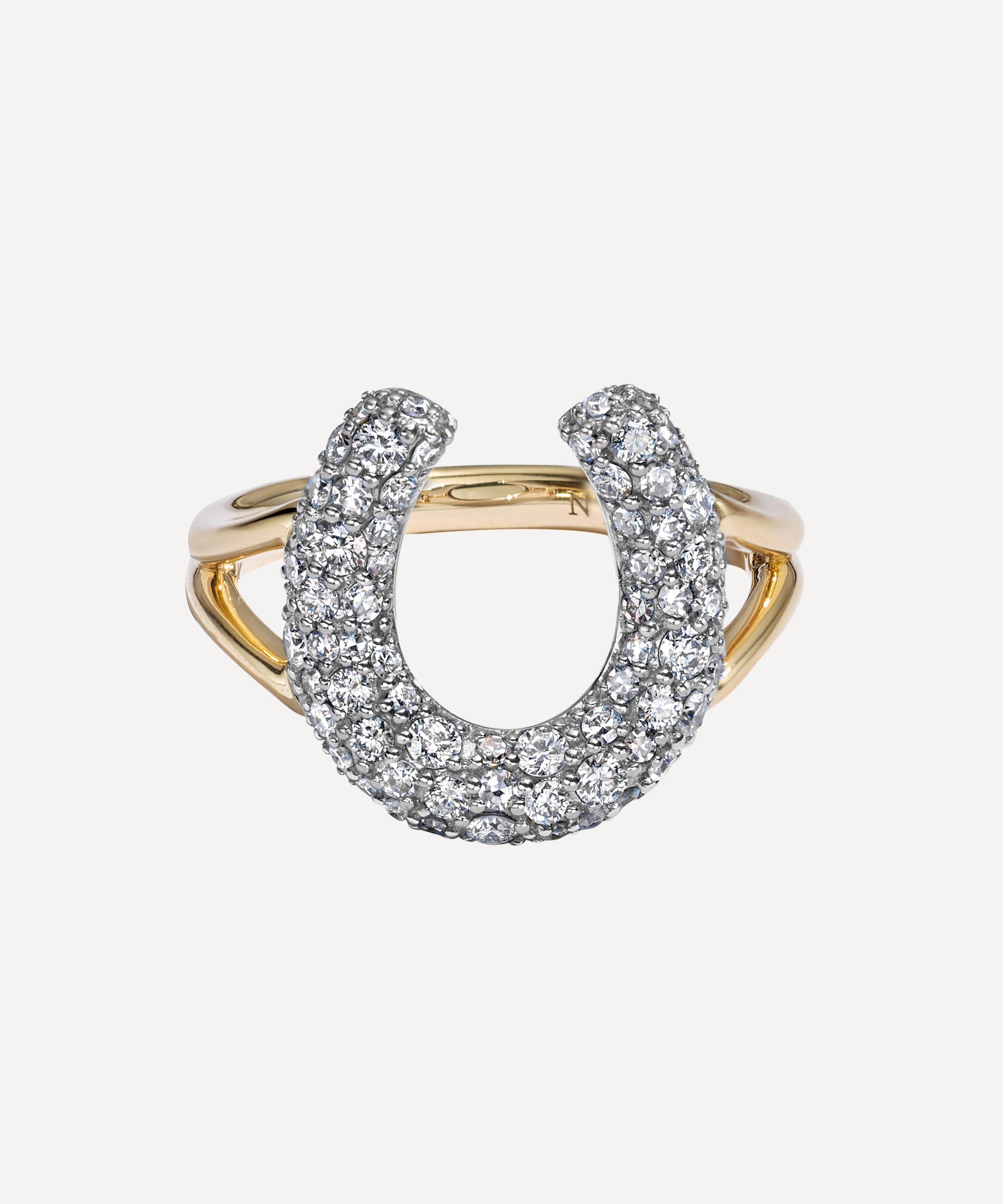 Rendered in 14ct gold, it features a polished band with split shoulders and a horseshoe design, adorned with Victorian-set, random pavé diamonds atop black rhodium. Referencing a vintage silhouette with a modern sentiment, it makes for a versatile addition to any jewellery collection. Whether worn alone or layered, it will instantly draw attention to both casual and formal looks with its subtle allure.
