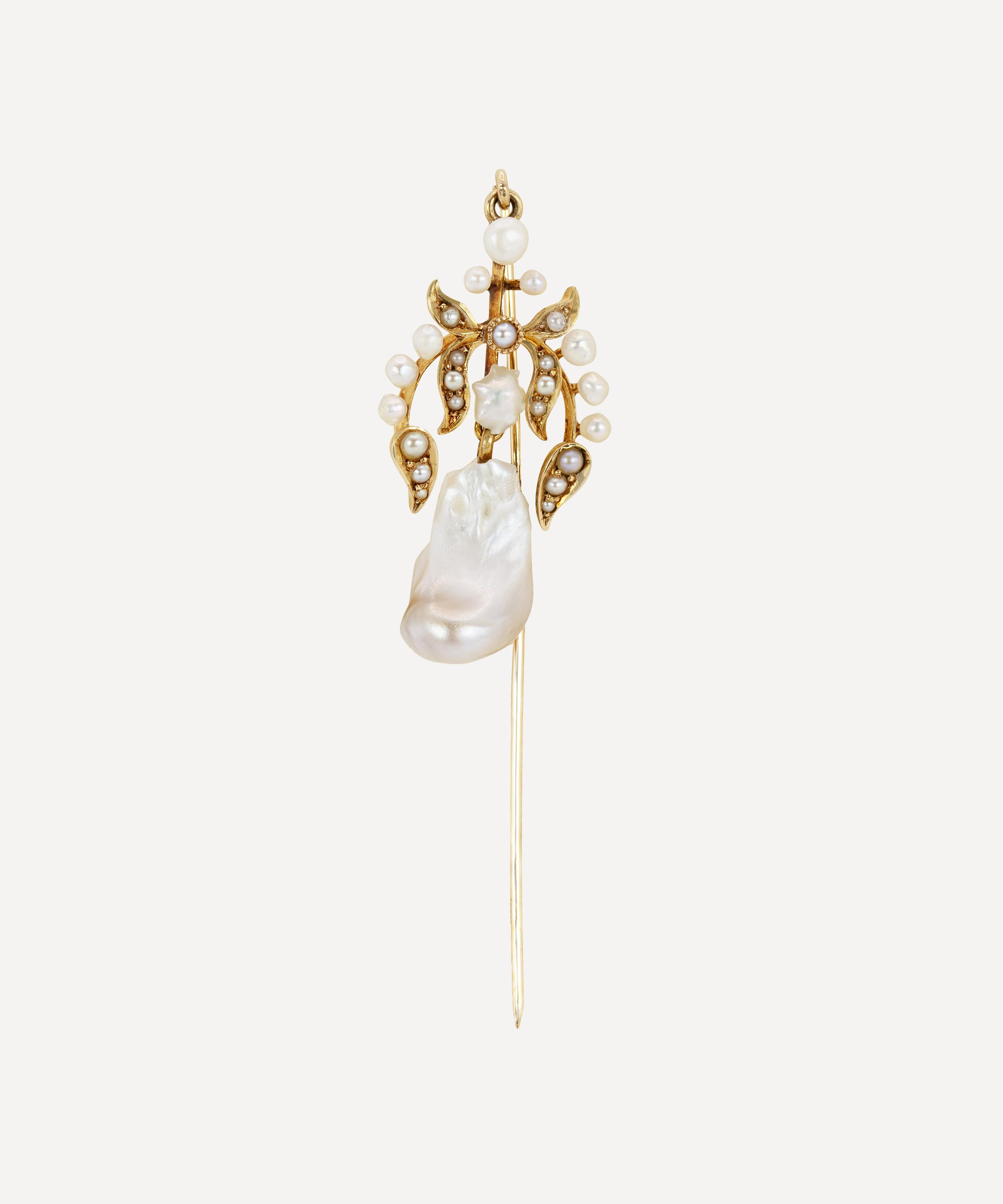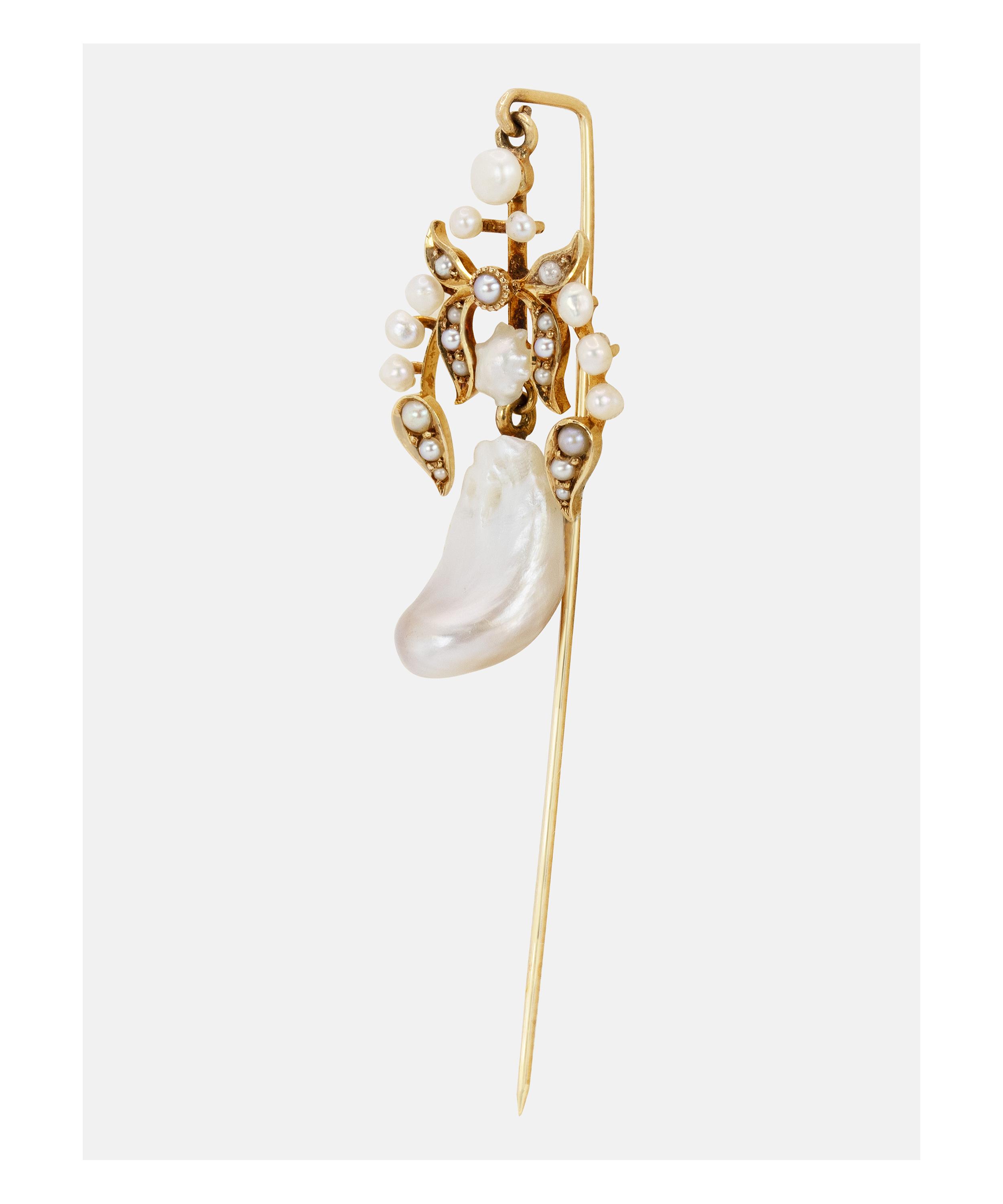 Brimming with character, this pin is a one-of-a-kind statement piece from antique purveyor Kojis. Crafted from 14ct gold, it features a large natural pearl hanging with articulation from a foliate design, set with multiple seed pearls and finished with a polished pin. Wear it alone or team it with several other artisanal brooches and pins for a maximalist take on traditional formalwear.