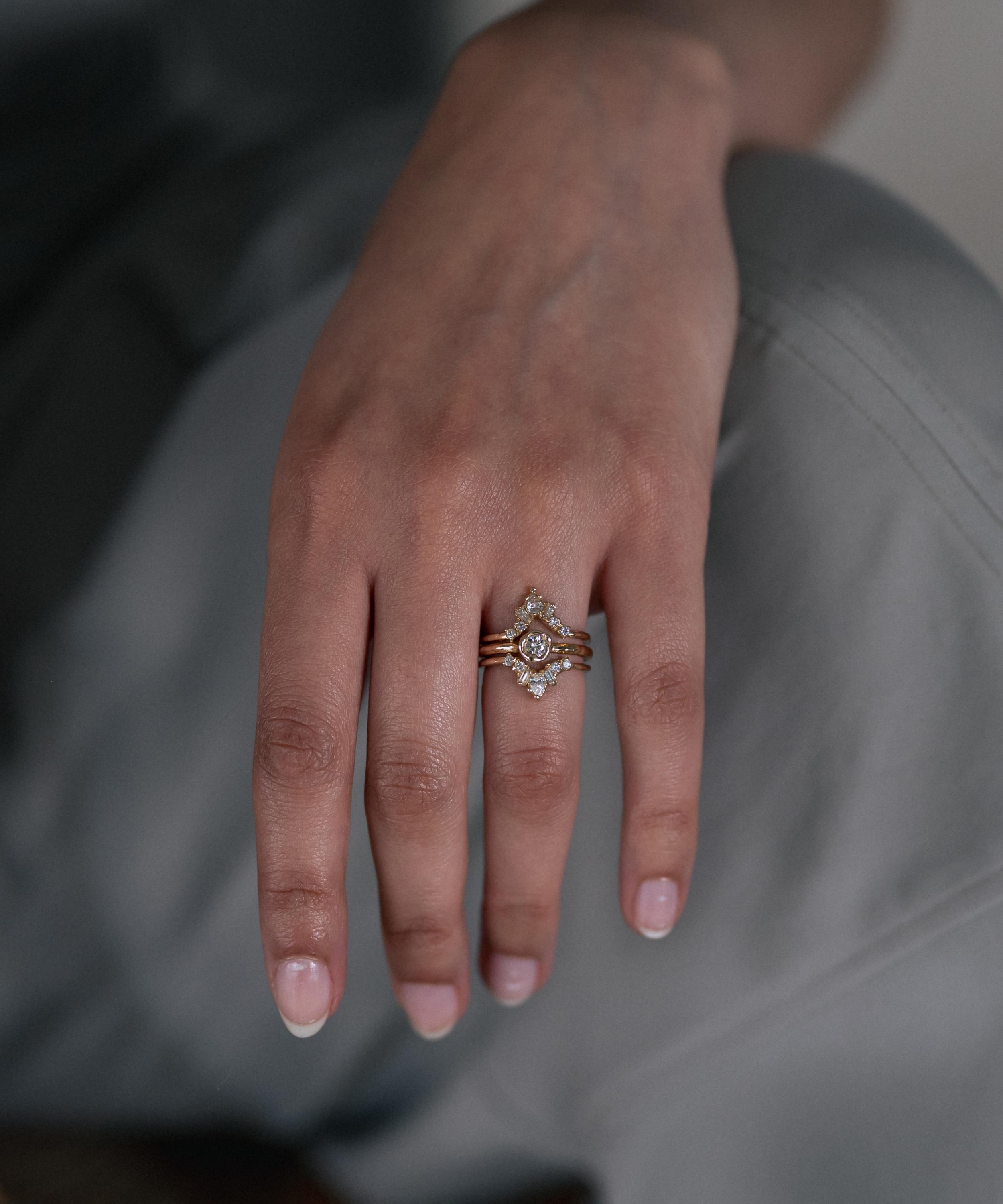 Inspired by the medieval jewellery hoards found across Scotland, it boasts a sculptural V shape illuminated by round-cut and pear-cut white diamonds. Crafted from 14ct gold, it can be worn alone as a solo piece for a statement look or paired with other rings for a curated stack.