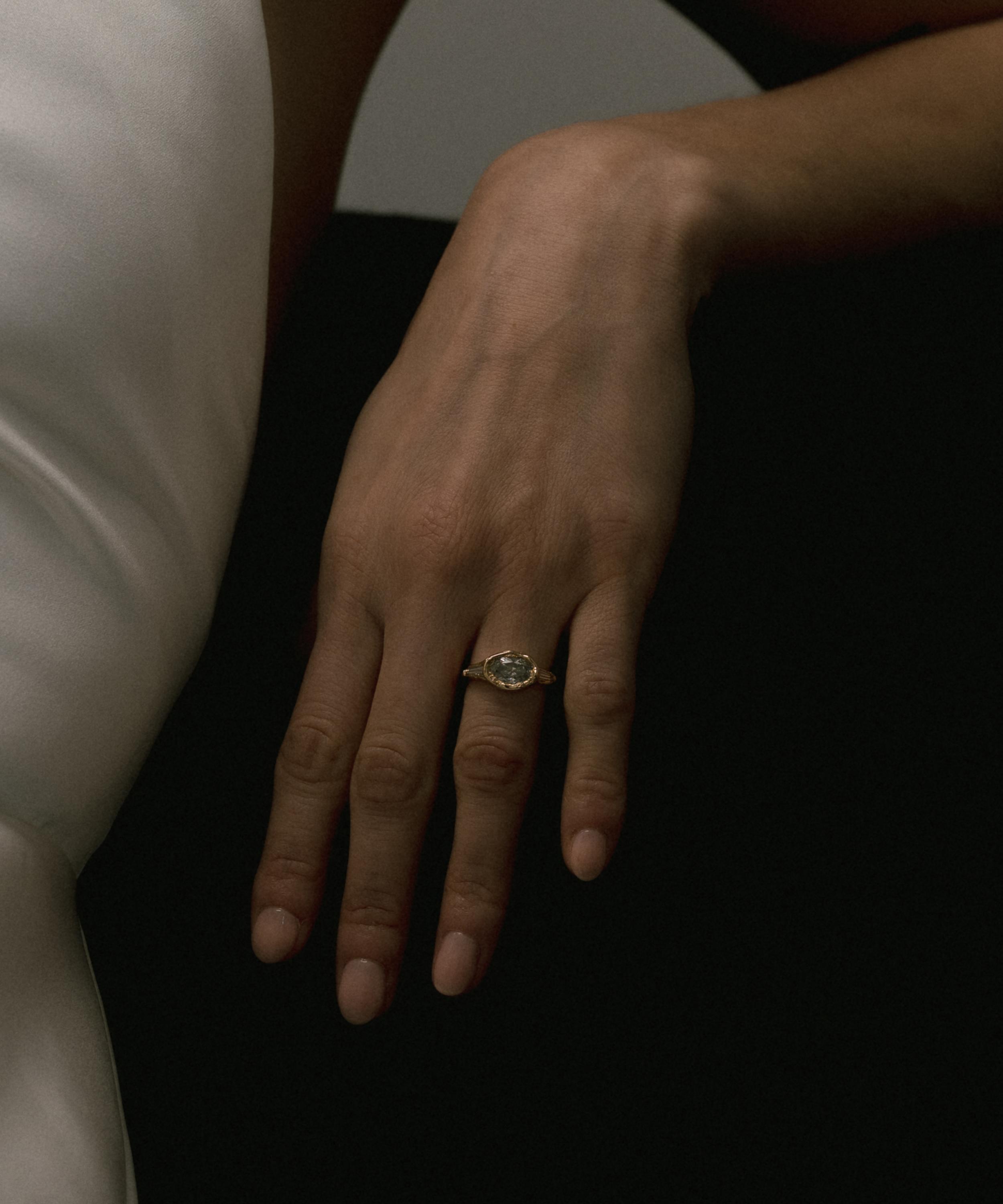 Embodying a unique, antique aesthetic, inspired by medieval jewellery hoards found across Scotland, it features a central, brilliant cut salt & pepper diamond, flanked by a baguette cut white diamond on each side. The stones are set in a softly distressed, molten texture, as if it has been uncovered like buried treasure. Ellis Mhairi Cameron pieces are designed to form sculptural stacks – wear alongside other rings, pair with a wedding band or style it solo as a statement piece.