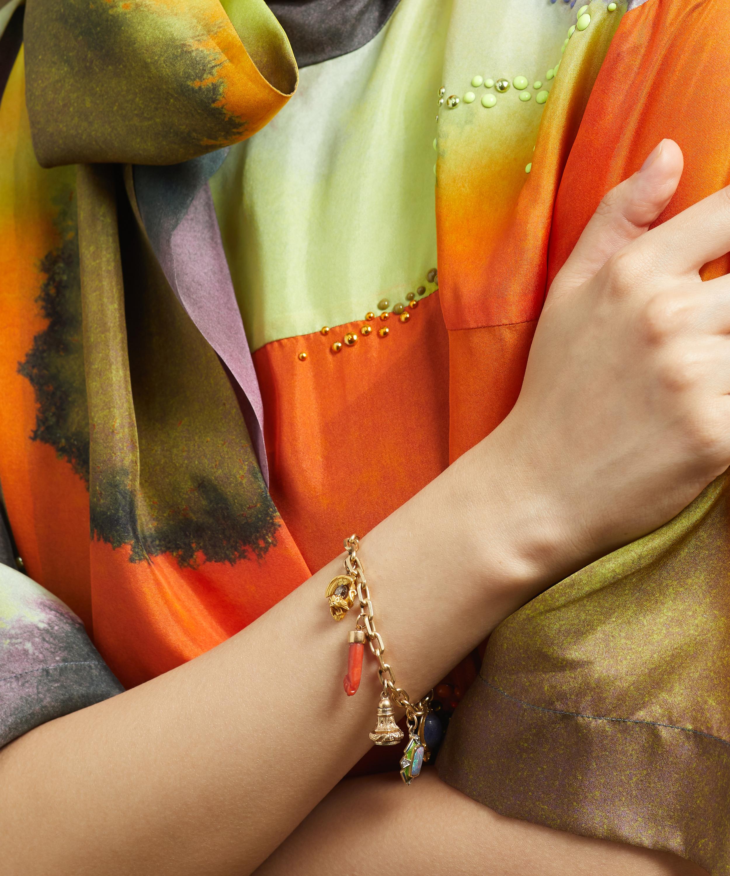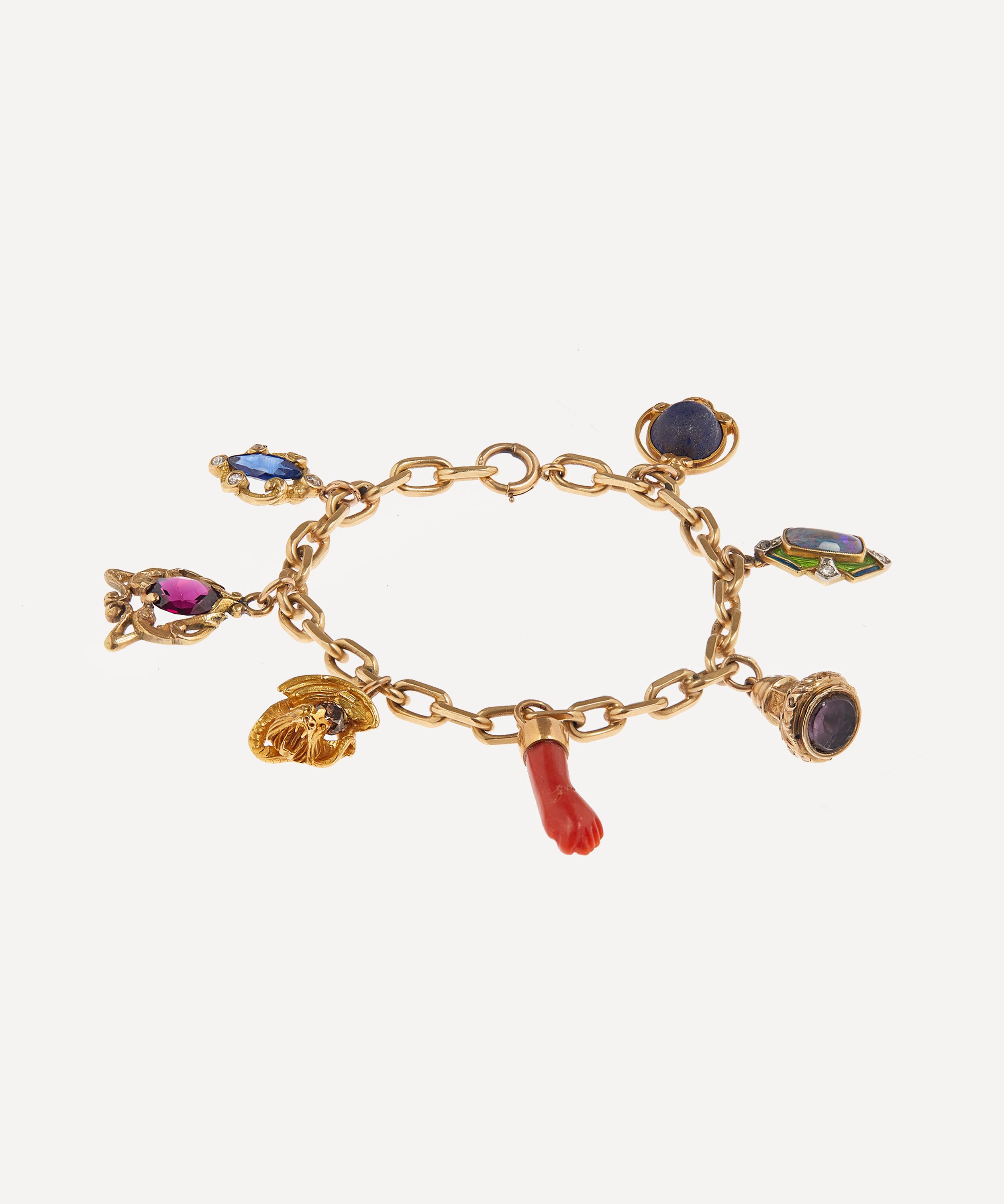 An original Art Nouveau piece dating back to the 1880s, this 14ct gold bracelet is composed of an antique chain adorned with several Victorian charms: An Art Nouveau sapphire charm, set with a navette cut sapphire in a textured, gold scroll design. Within the scroll, sit four old-cut diamonds, presented in a gold bezel setting. An oval-cut garnet charm encased in gold. An antique dragon charm, set with an old-cut brown diamond in the centre of its body. A coral Figa charm, with a yellow gold cuff – representing an ancient symbol of luck and fertility. A Victorian seal charm, set with an amethyst in a decorated scroll design. A rectangular-cabochon black opal surrounded by green and blue enamel set with four old-cut diamonds in the frame. An oval-cabochon cut lapis lazuli in the centre of a gold, stylised wire framework. The bracelet is complete with a spring clasp fastening – to easily embellish the wrist with iridescent jewels. Let this piece shine on its own, or layer it additional gemstone bangles for a showstopping curation.