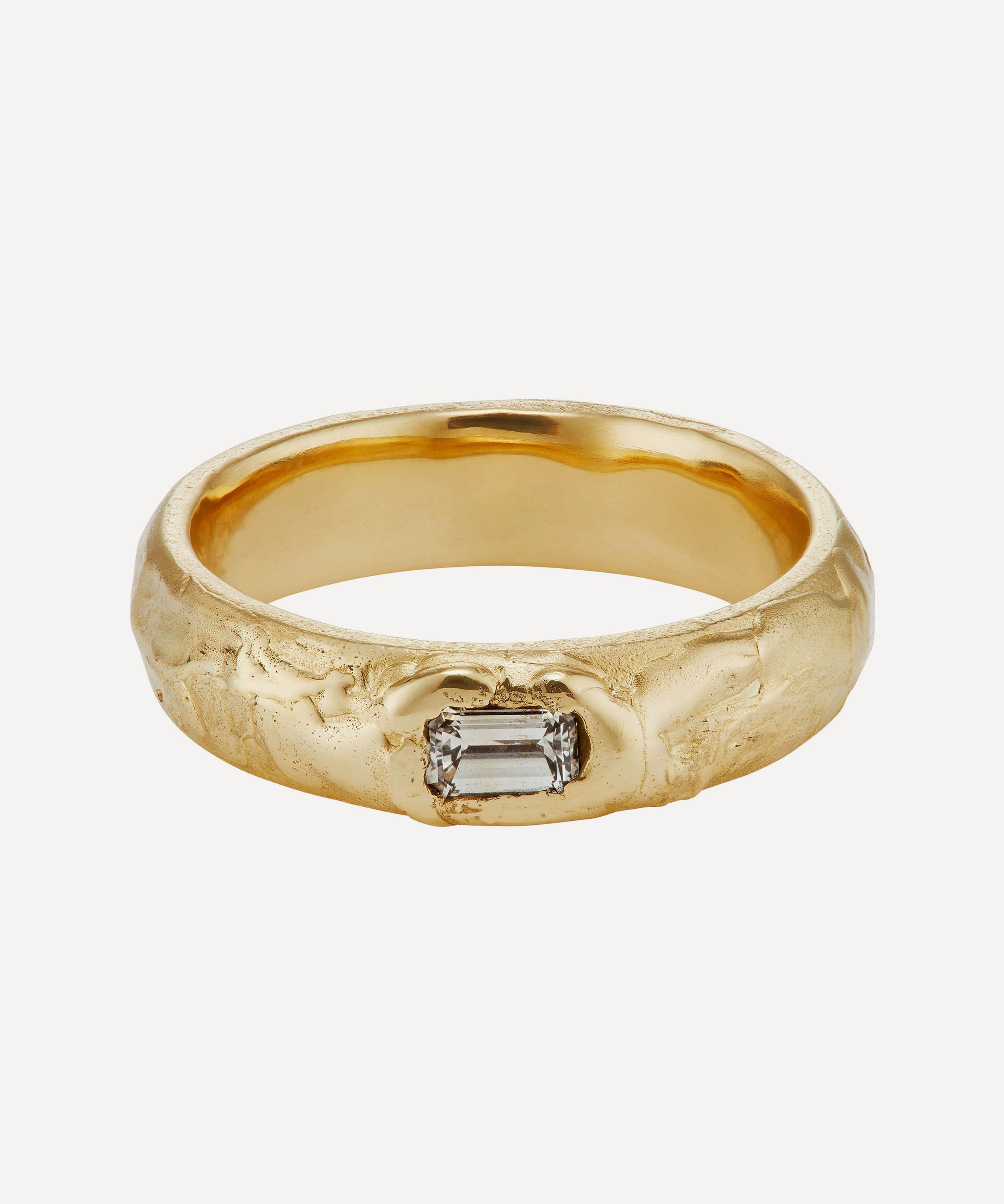 Inspired by medieval jewellery hoards found across Scotland, this ring is softly distressed, with the diamond set into the rough texture as if it has been uncovered like buried treasure. Ellis Mhairi Cameron pieces are designed to form sculptural stacks – pair with an engagement ring from the collection for the full look.