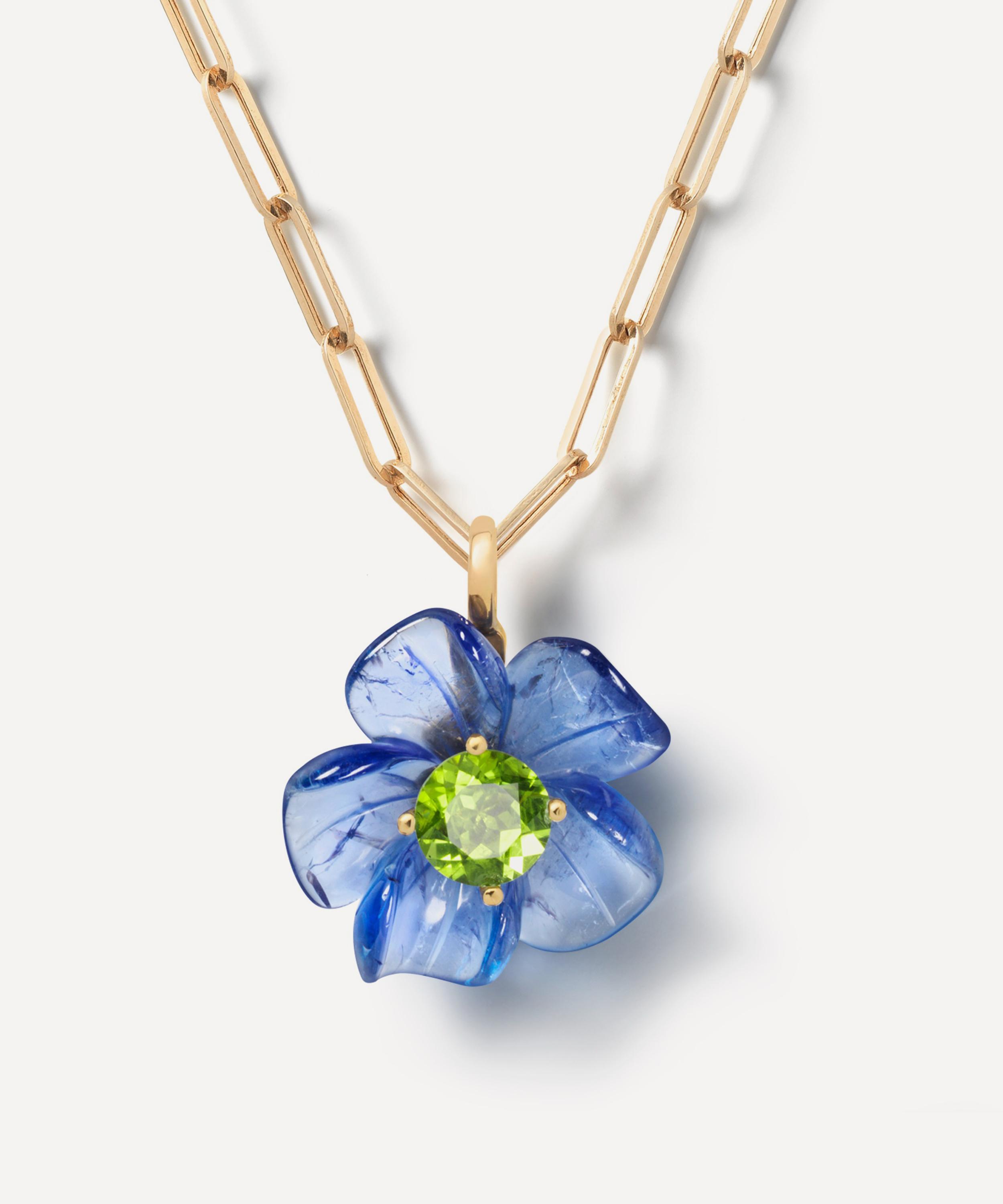 Drawing inspiration from Andy Warhol’s 1964 flower series, it features a blossoming floral design composed of hand-carved tanzanite petals and a brilliant cut peridot at the centre – a representation of positive energy, joy, and happiness. Suspended from a 14ct gold clasp, the pendant shimmers in a delectable colourway, perfect for pairing with Sophie Joanne’s Time To Bloom Necklace or Flat Link Chain Necklace – try teaming it with matching pieces from the brand for a truly efflorescent curation.