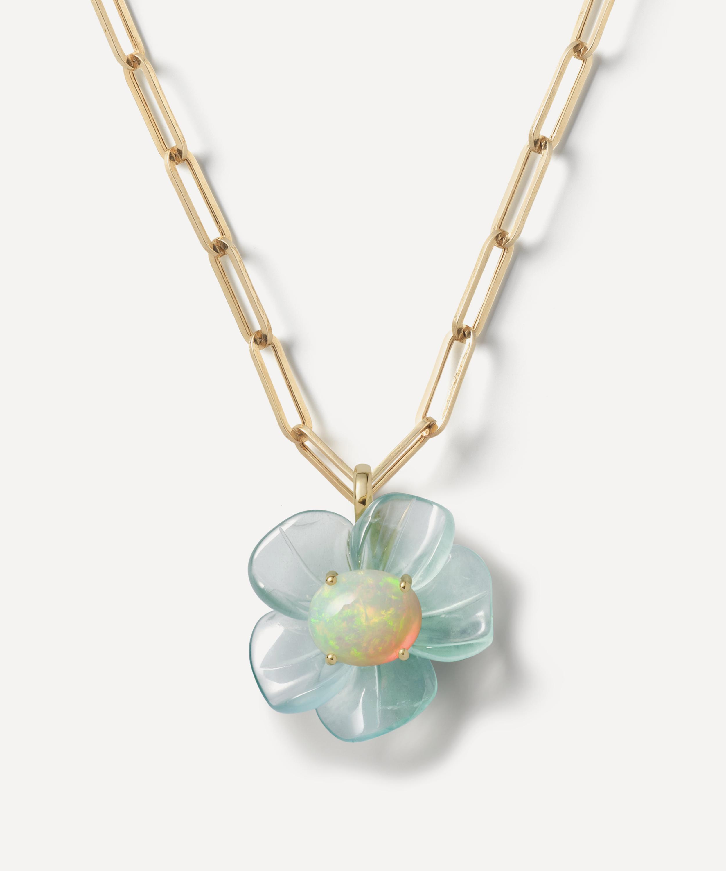 Drawing inspiration from Andy Warhol’s 1964 flower series, it features a blossoming floral design composed of hand-carved aquamarine petals and a cabochon-cut Ethiopian opal at the centre – a representation of emotional grounding and growth. Suspended from a 14ct gold clasp, the pendant shimmers in a delectable colourway, perfect for pairing with Sophie Joanne’s Time To Bloom Necklace or Flat Link Chain Necklace – try teaming it with matching pieces from the brand for a truly efflorescent curation.