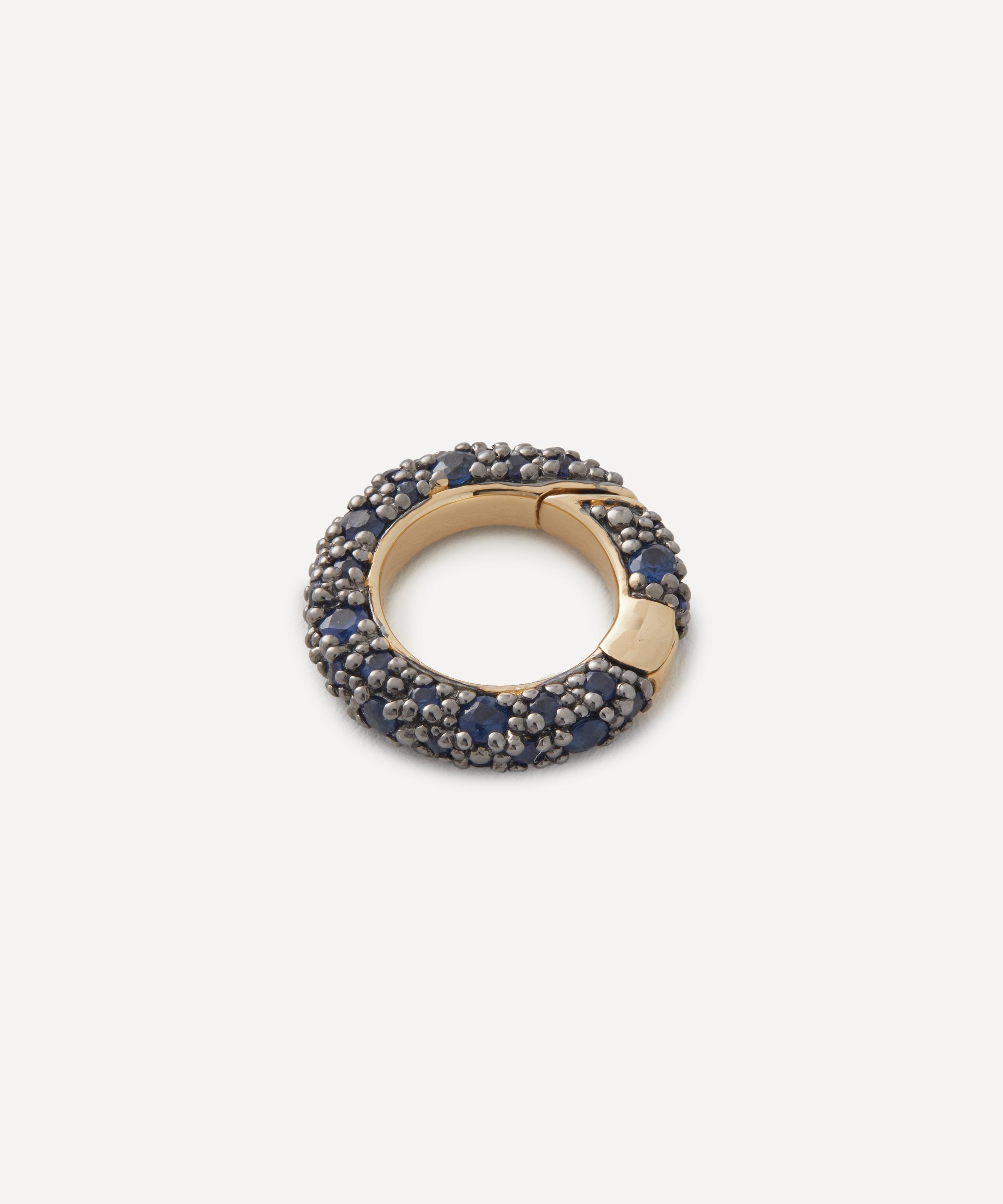 Crafted from 14ct gold, it features a circle-shaped silhouette adorned with sparkling pavé blue sapphire atop black rhodium. With its hidden spring hinge closure, it perfectly complements the brand’s Gemstone T-Bar Pendant – add existing charms to a necklace or use it as a connector for the Trombone Link Chain Necklace.