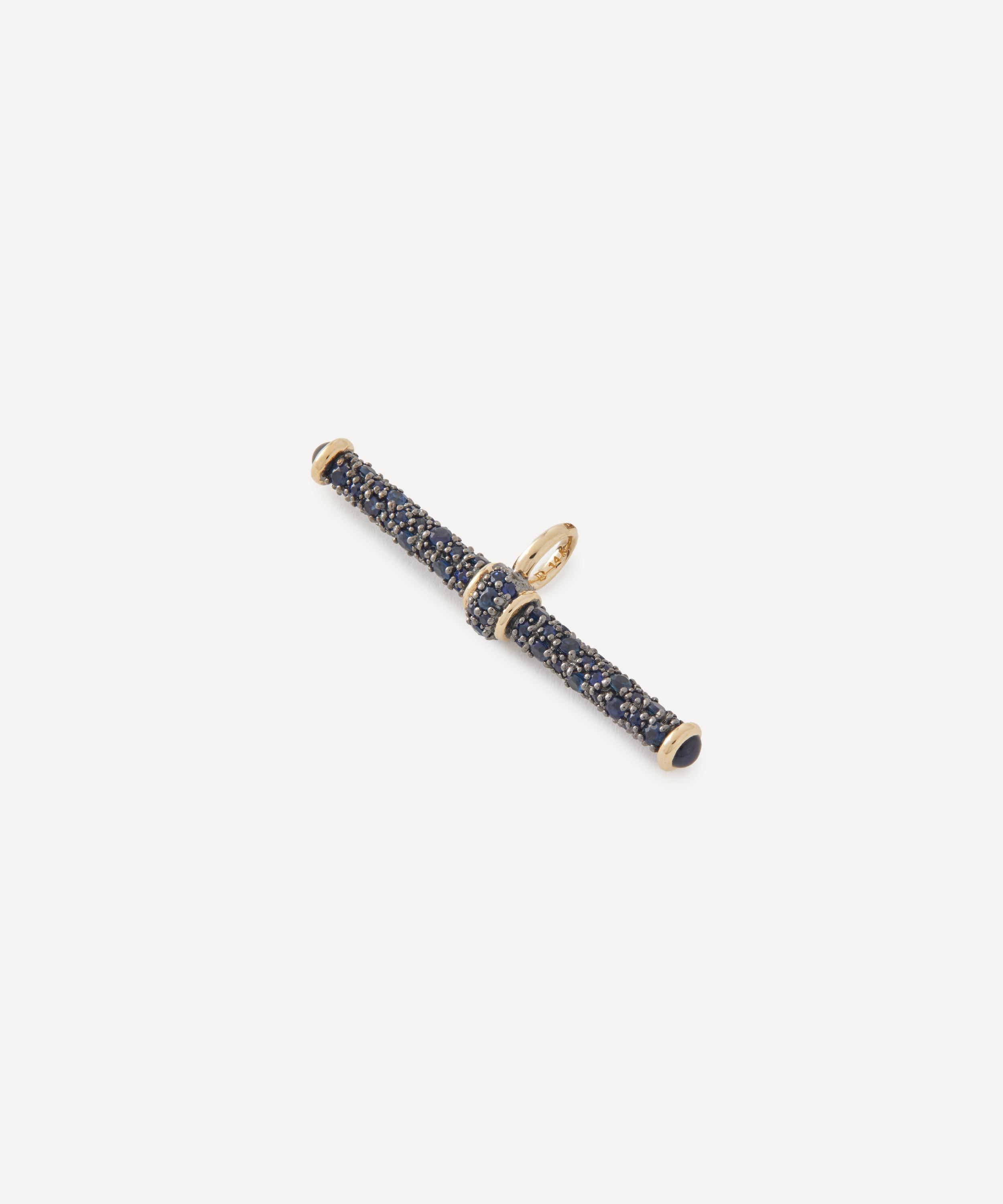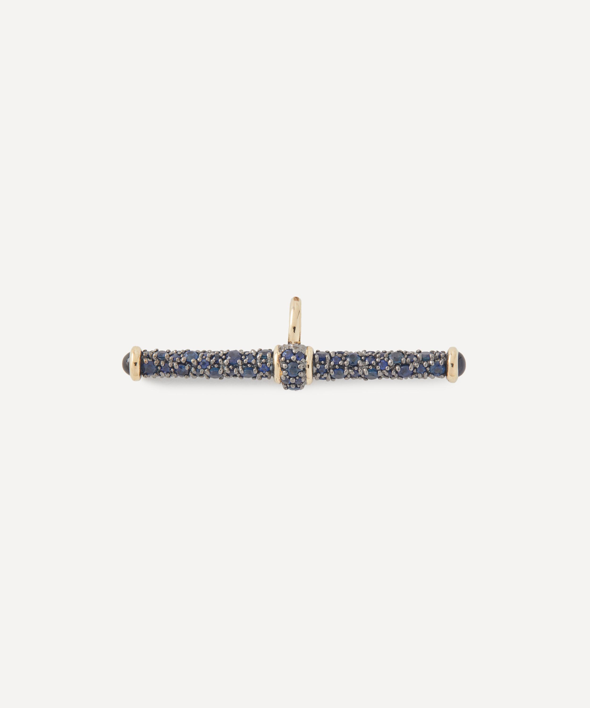 Crafted from 14ct gold, it features a classic T-bar adorned with pavé blue sapphires atop antique finish black rhodium. Complete with a sapphire cabochon on either end, it references a vintage silhouette with a modern sentiment, making it a versatile addition to any jewellery collection. Wear it with one of the brand’s fins chains or charm bracelets and instantly draw attention to both casual and formal looks with its subtle allure.