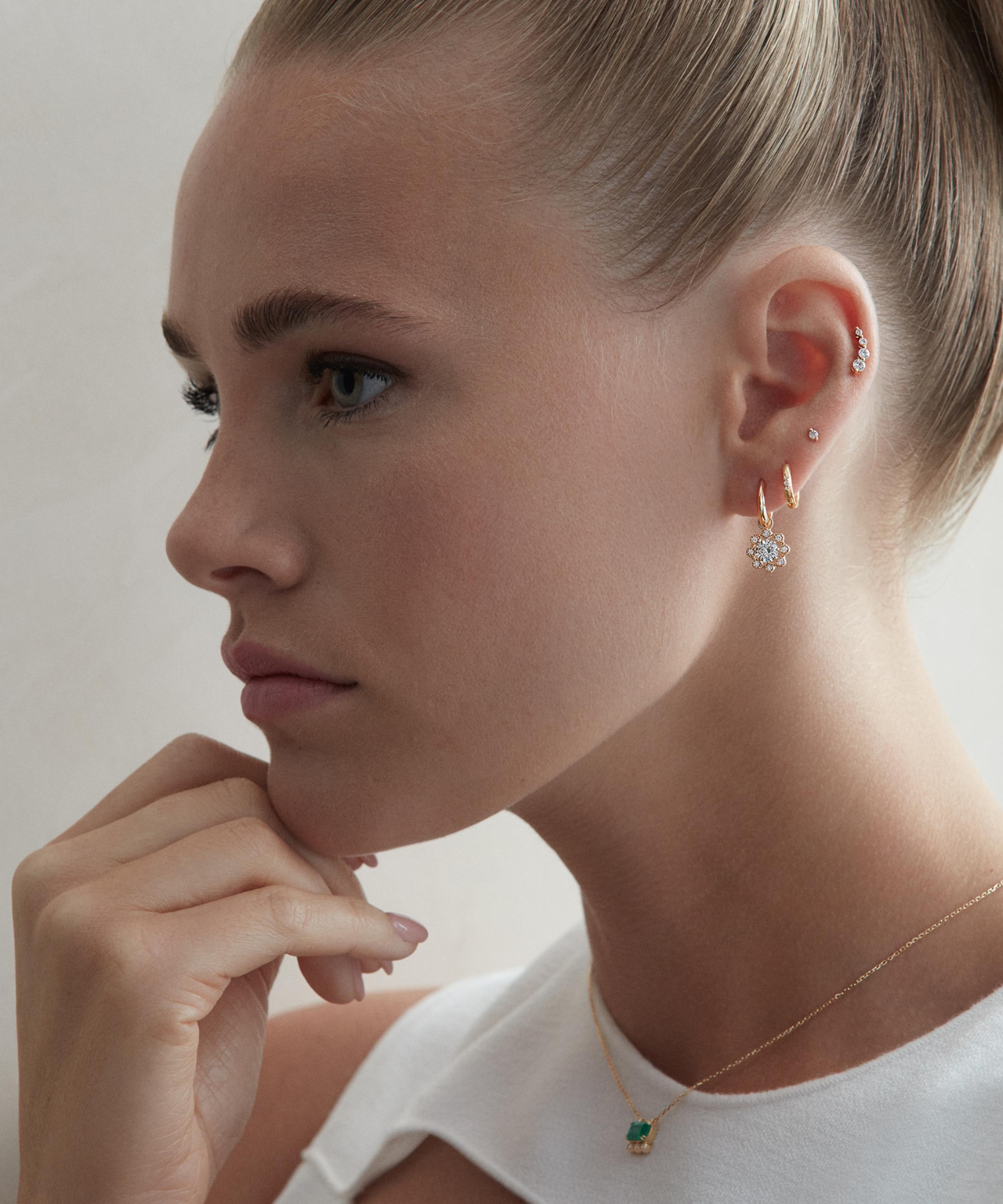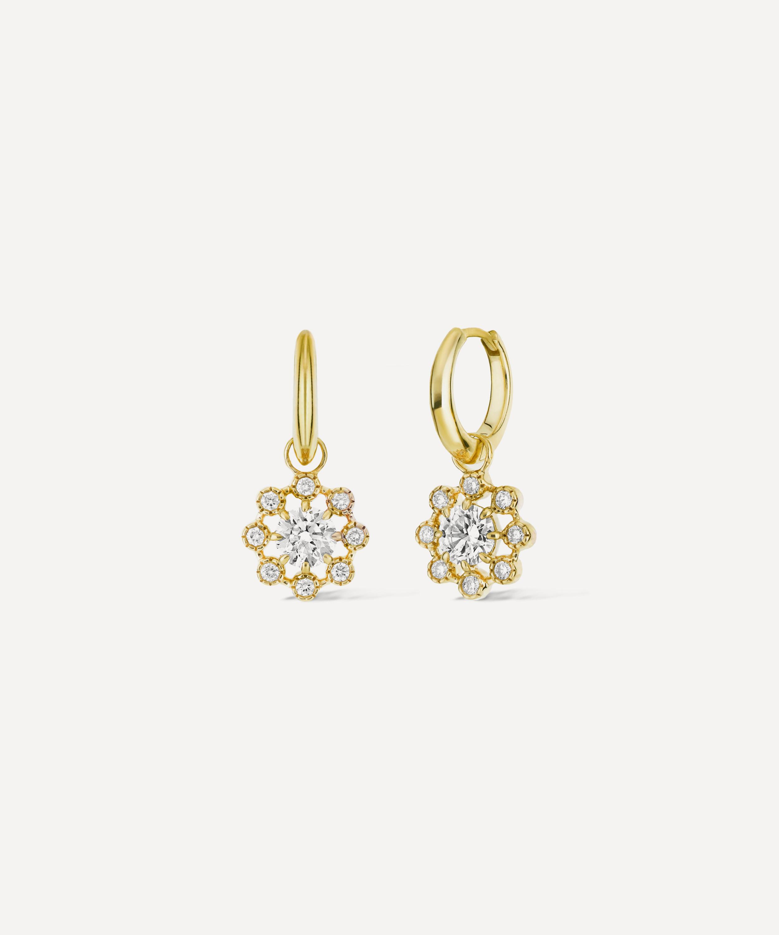 Heighten the impact of your ear stack with Dinny Hall’s unique Celandine drop hoop earrings – inspired by the British flower meadow. Crafted from 14ct gold, each earing features a polished hoop adorned with brilliant cut diamonds arranged in a beautiful flower design. Style them as a statement pair, team with additional earrings, or wear them with a matching necklace from the Wildflower collection.