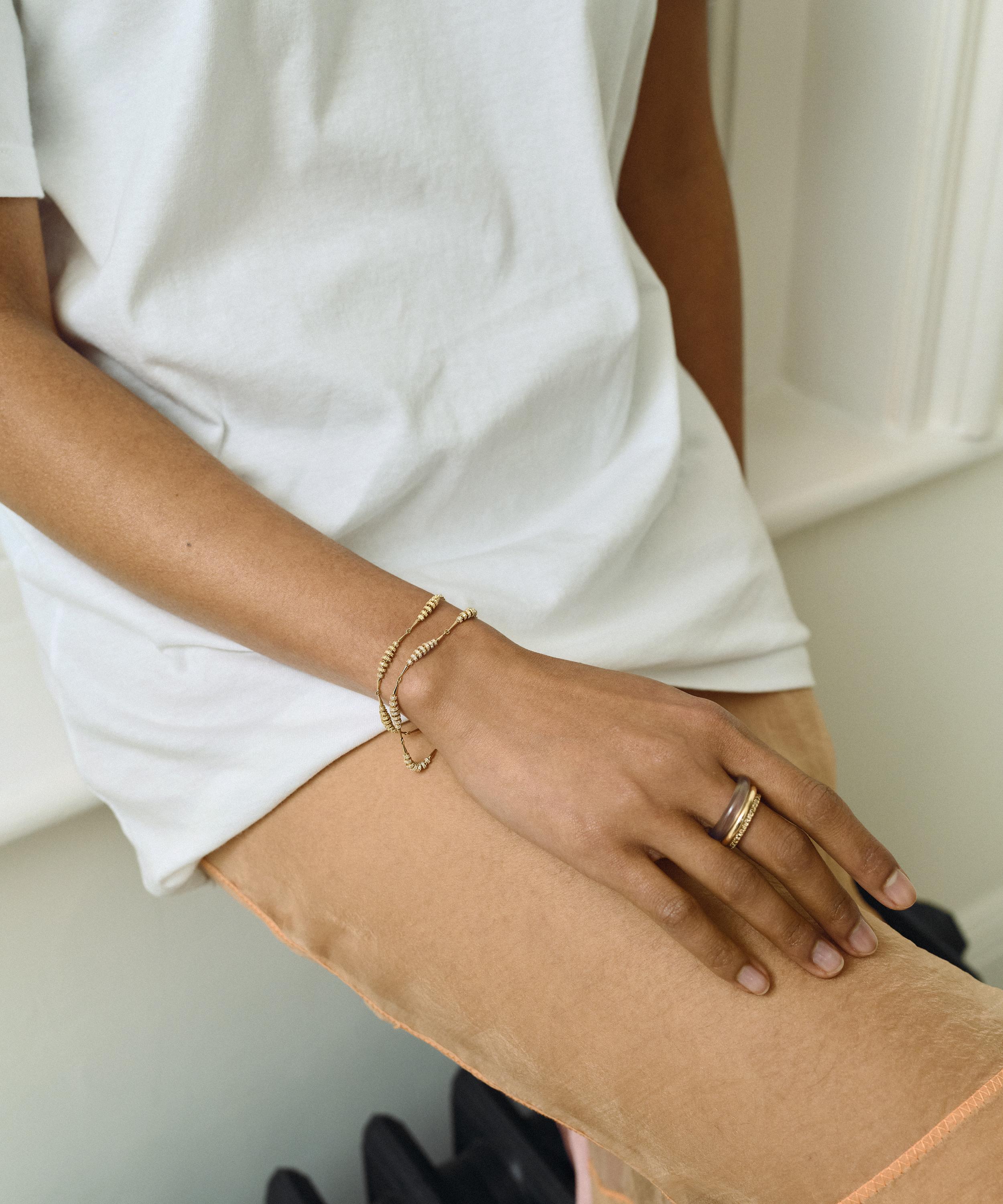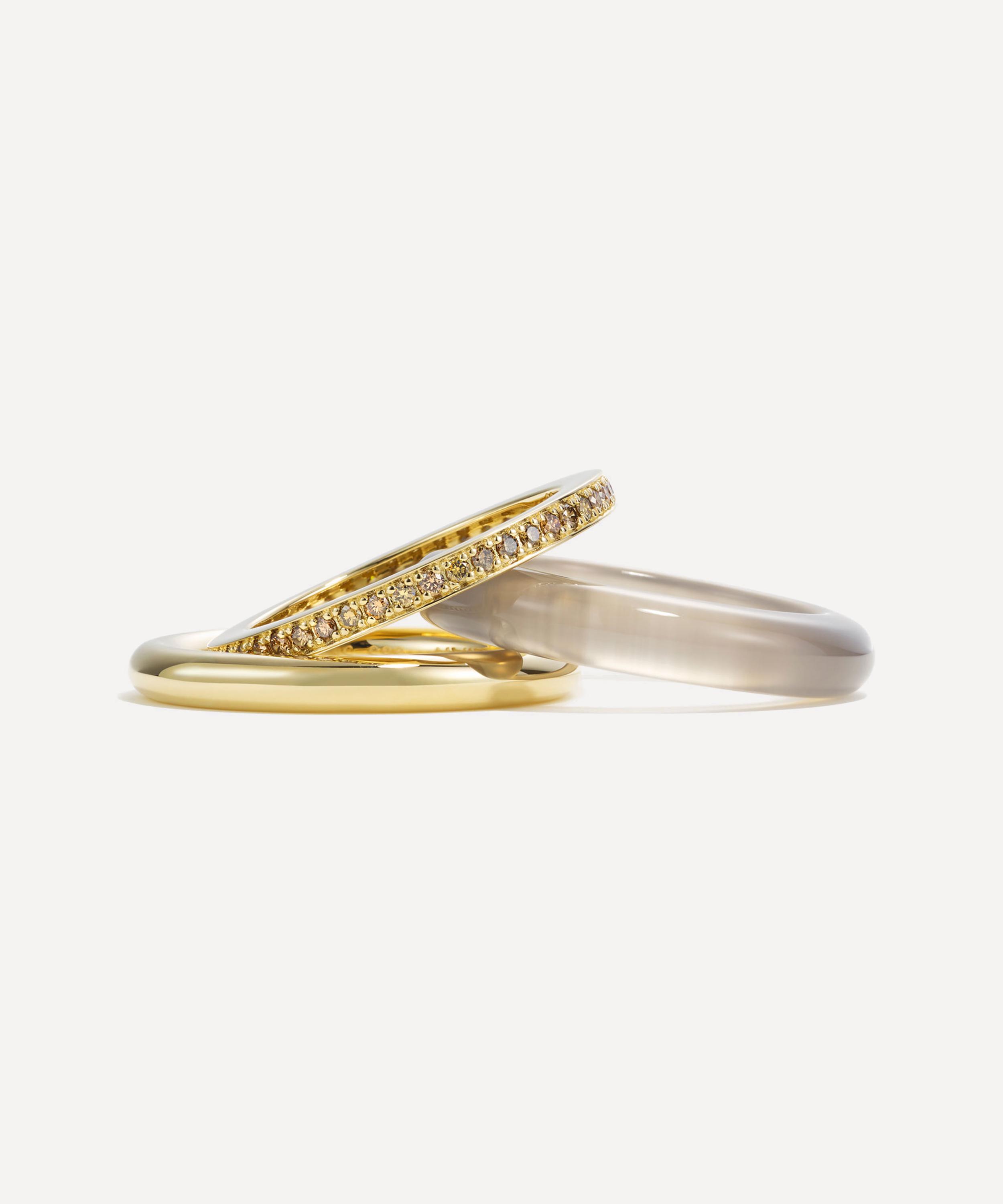 By Pariah shines a spotlight on the natural beauty of raw, untouched materials with this stacked Trilogy ring. Epitomising elevated elegance, it features a three-band stack composed of a diamond-encrusted, 14ct gold band, hand-carved grey Botswana agate and a polished 14ct gold ring. Style them as a ring stack, wear them on separate fingers, or try wearing one as a subtle statement piece, alternating between them.