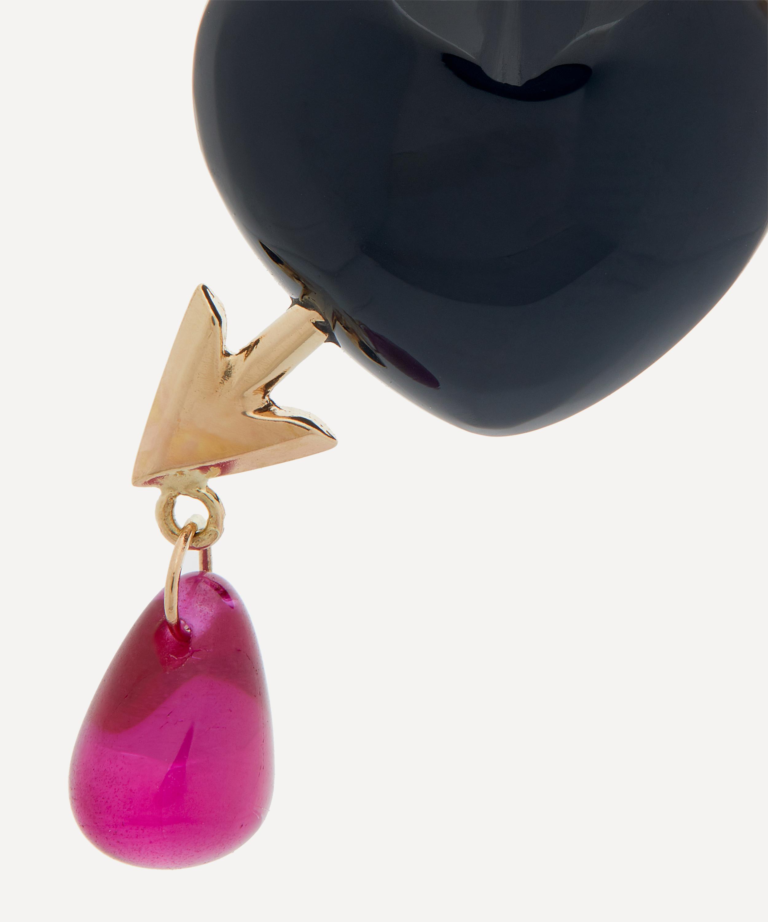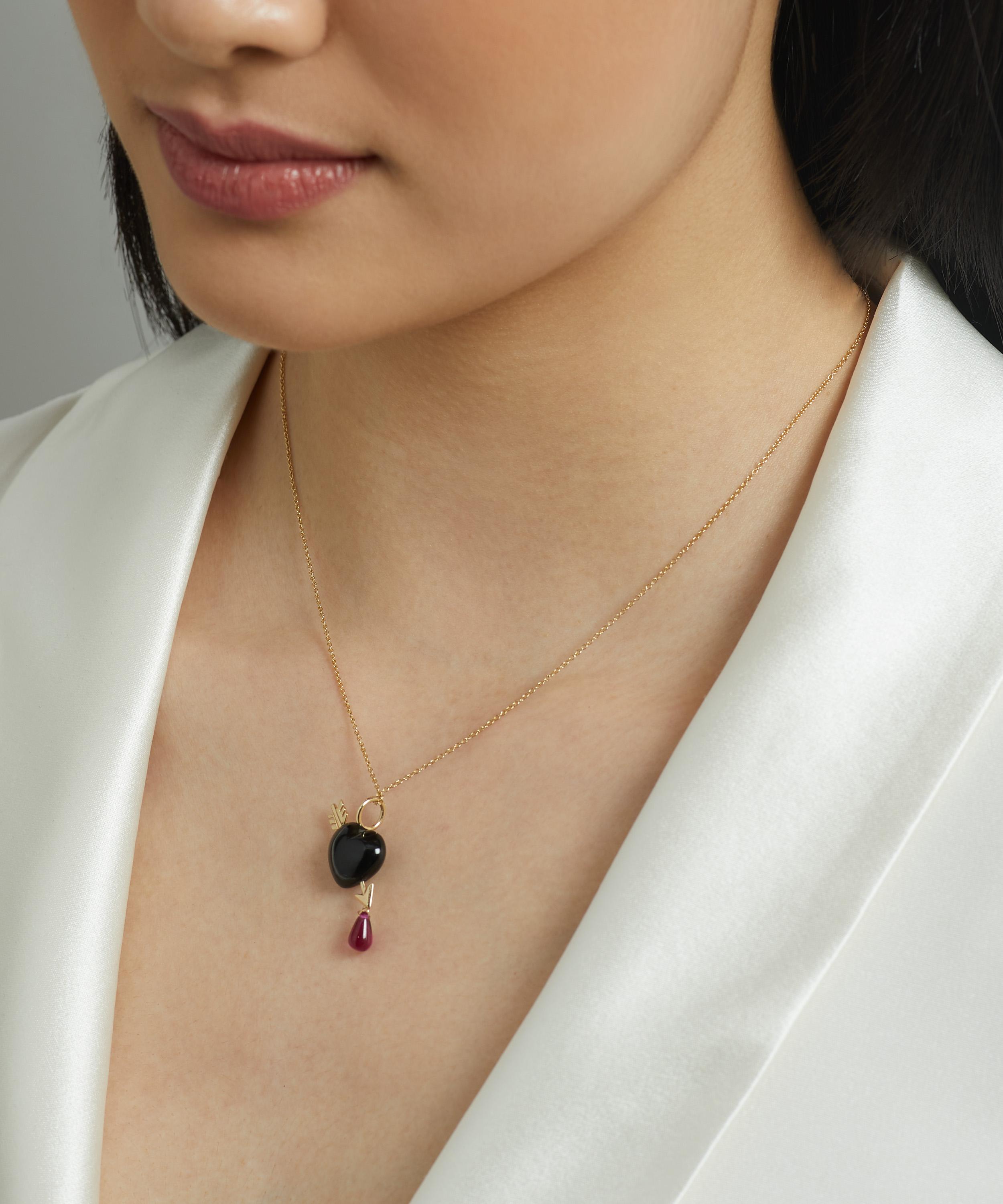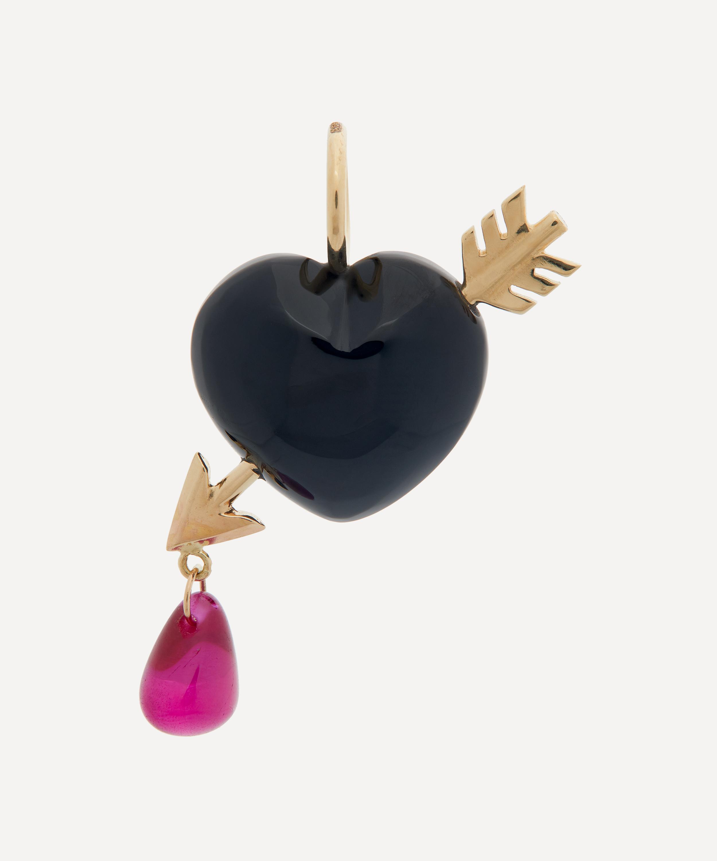 The Cupid's Arrow charm from Rachel Quinn perfectly capture the romantic surrealist narratives that run throughout the brand, from playful themes to the deeply poetic realm of the heart. Crafted from 14ct gold, this pendant charm is characterised by a smooth, heart-shaped onyx, pierced by a golden arrow adorned with a lab-grown ruby drop. Complete with a high-polished jump ring, it can be attached to your favourite chain or hoop.