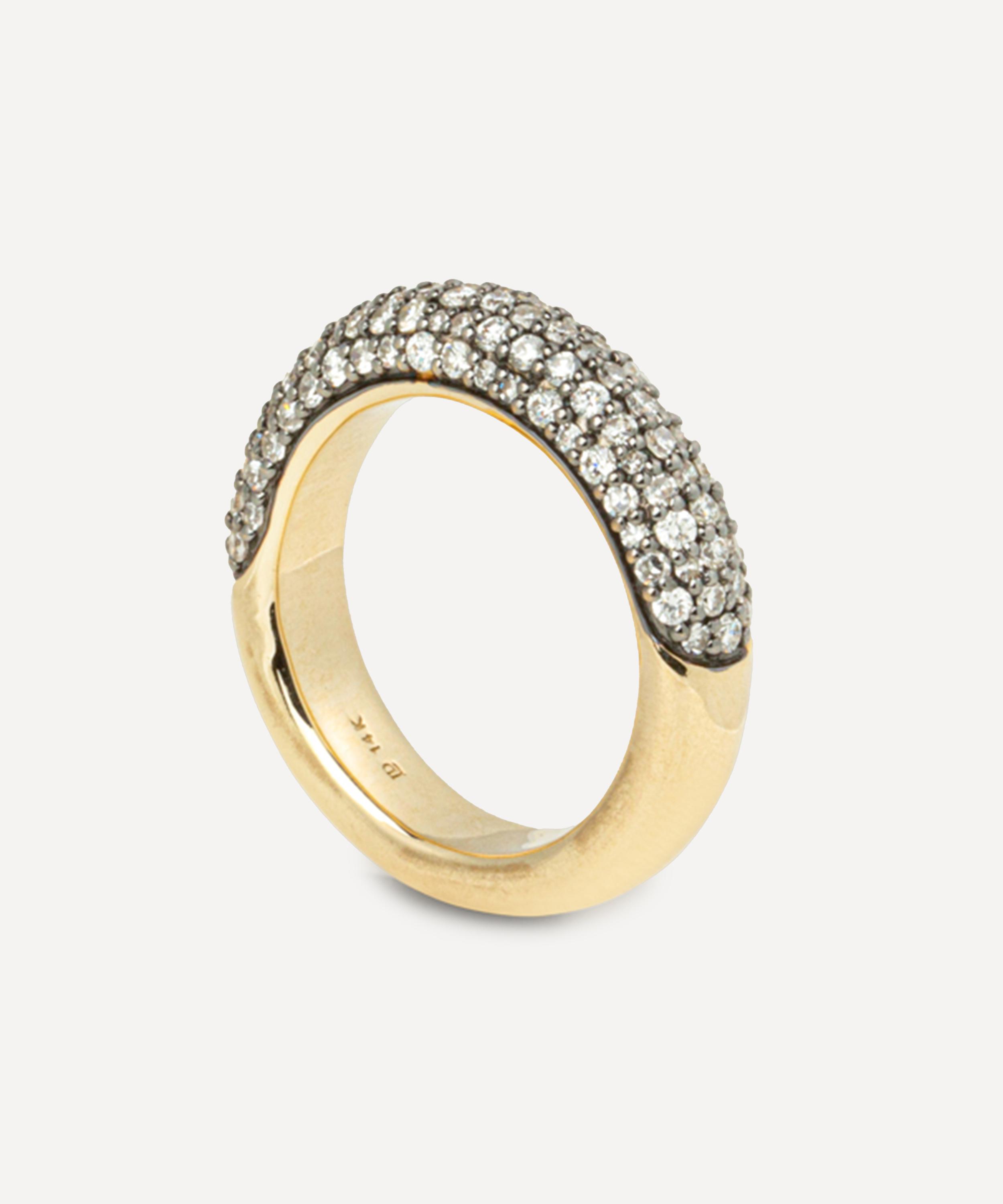 Crafted from 14ct gold, it features a slim, polished band adorned with a Victorian set diamond pavé atop black rhodium. Referencing a vintage silhouette with a modern sentiment, it makes for a versatile addition to any jewellery collection. Weather worn alone or layered, it will instantly draw attention to both casual and formal looks with its subtle allure.