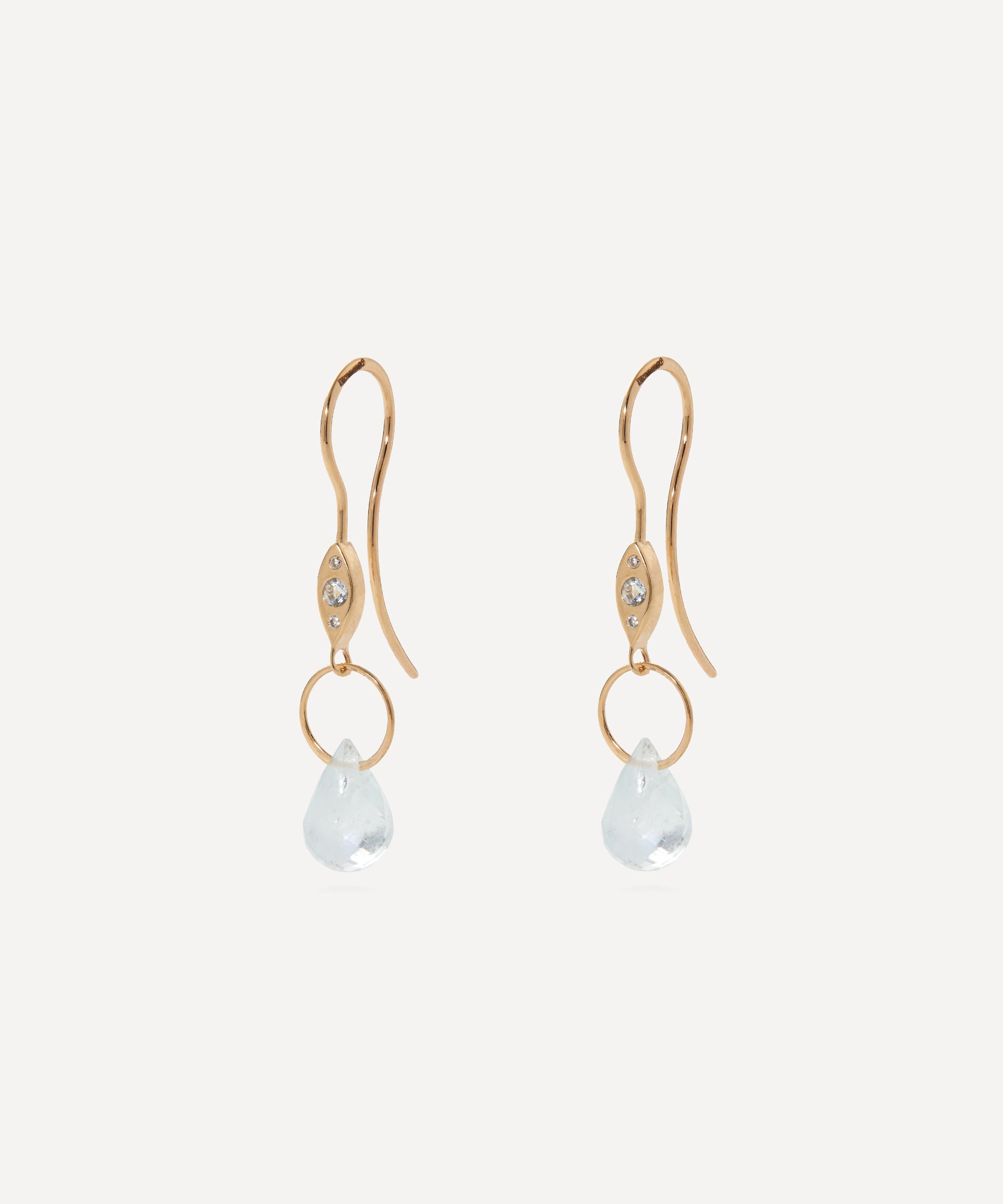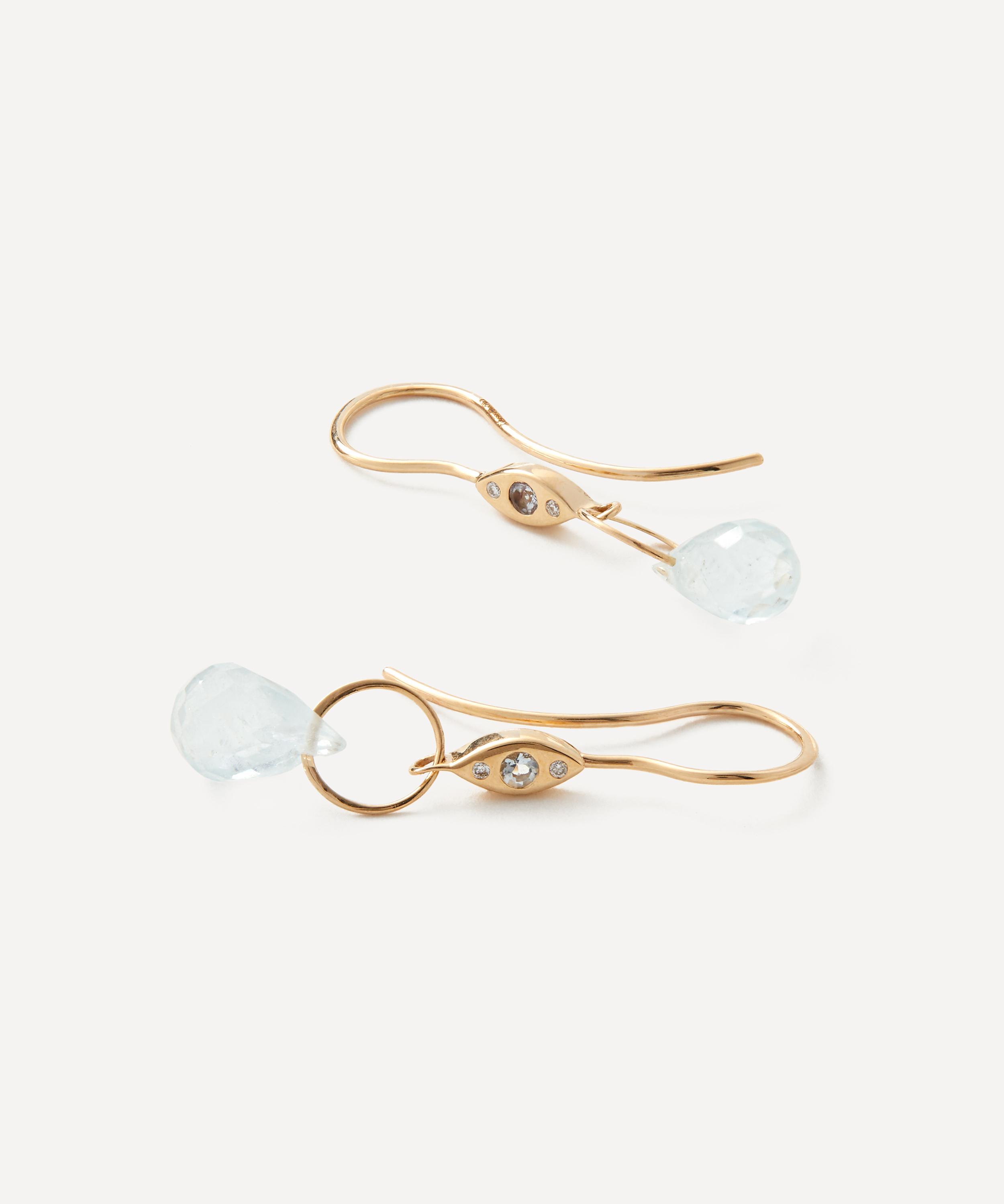 Accentuate bare lobes with these elegant drop earrings from Melissa Joy Manning. Crafted from 14ct gold, each earring is made up of a classic wire hook elevated by a rhombus detail set with an aquamarine and two sparkling diamonds, complete with an aquamarine briolette drop – offering a delicate swing when worn.