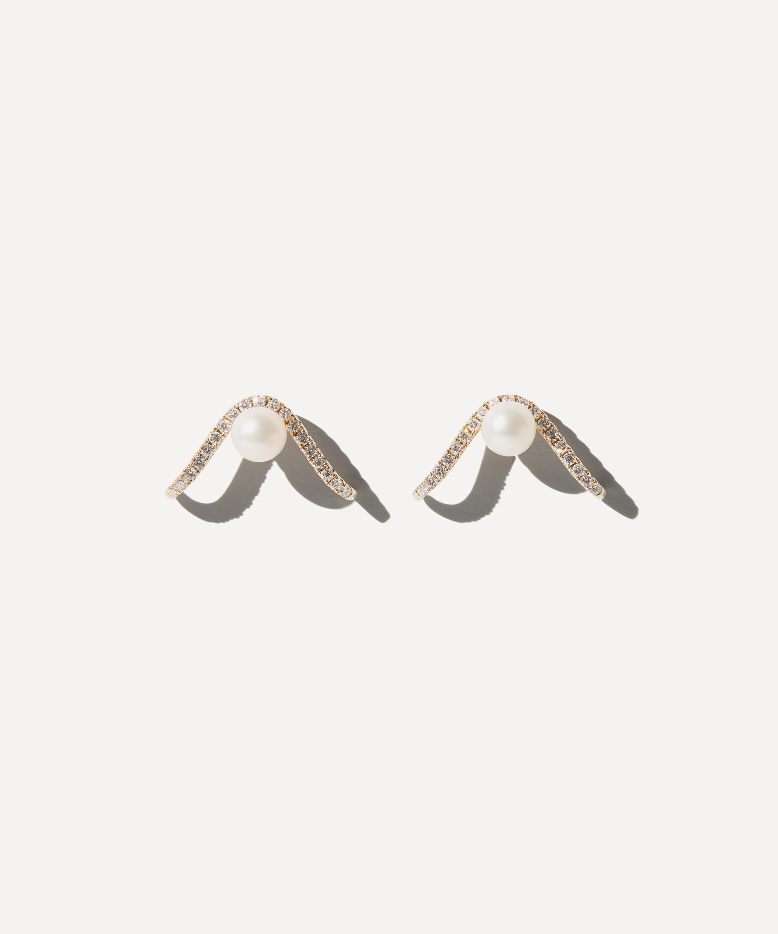 Everyday elegance encapsulated, these stud earrings by Mizuki are the minimal statement piece you will reach for again and again. Fashioned from 14ct gold, each earring features an offset, opulent freshwater pearl embraced by a curved silhouette lined with glittering diamond accents. Style them alone or layered.