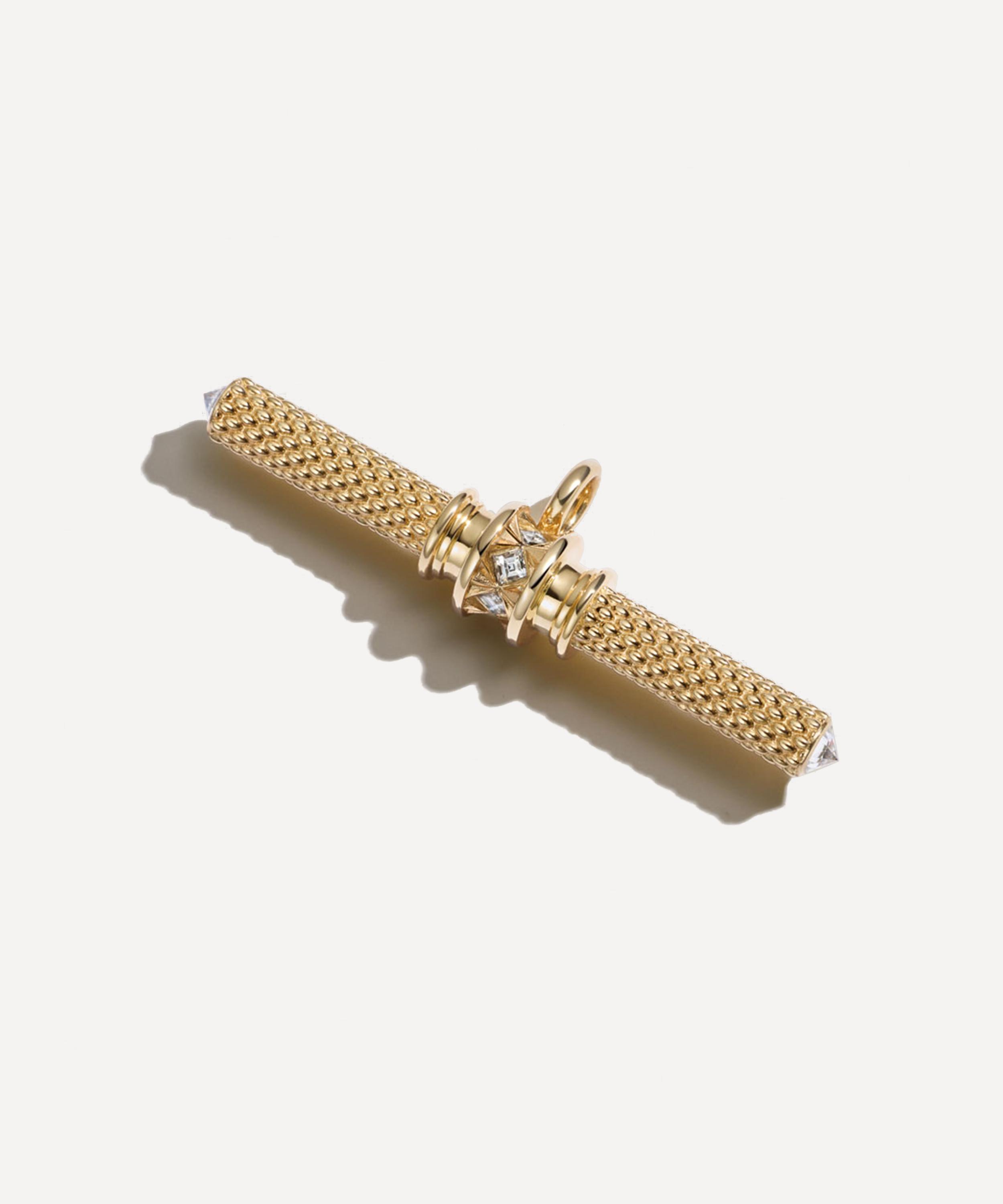 Rendered in 14ct gold, it features a classic T-bar adorned with a textured design inspired by the vintage lighters of the 40s and 50s. Complete with a carre-cut diamond centre and a diamond crown on each end, it references a vintage silhouette with a modern sentiment, making it a versatile addition to any jewellery collection. Wear it with one of the brand’s chains and instantly draw attention to both casual and formal looks with its subtle allure.