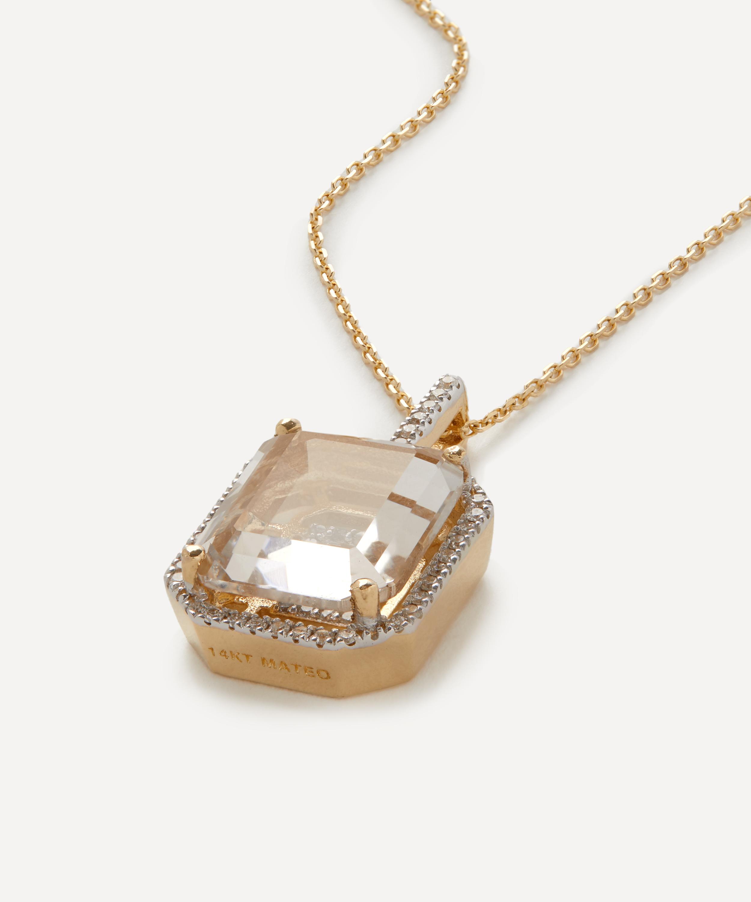 Add a personal touch to your everyday jewellery line-up with Mateo’s initial pendant necklace. Crafted from 14ct solid gold, this necklace features an octagon-shaped pendant adorned with an emerald-cut crystal quartz centre stone that’s surrounded by a sparkling diamond border, and a pave’ diamond “C” initial set underneath the gemstone.