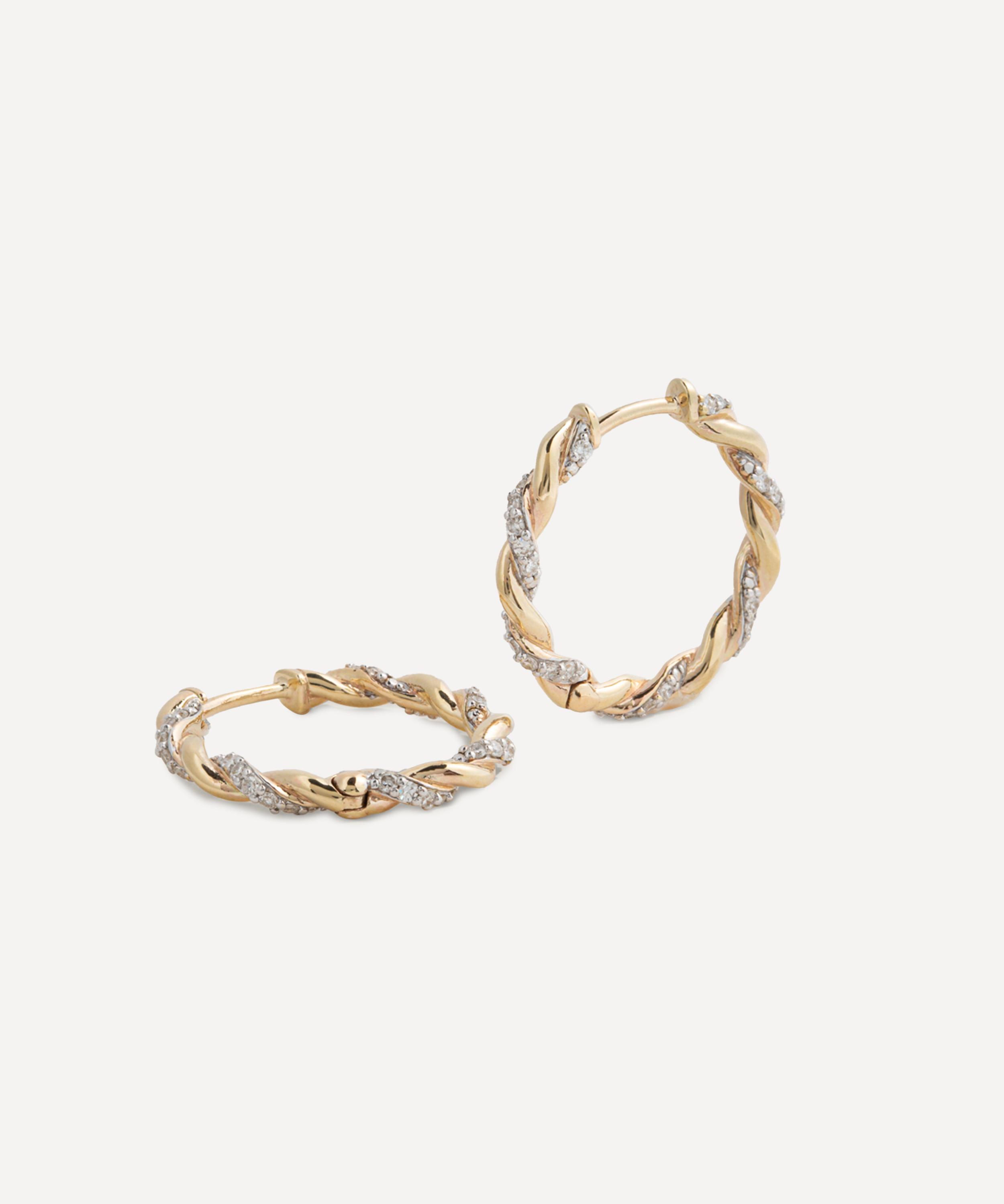 Crafted from 14ct gold, this pair exude a sense of luxury and durability, while maintaining a refined, understated aesthetic. Their twisted rope design, characterised by sparkling diamond atop white rhodium, reference and celebrates a vintage silhouette with a modern sentiment, making them a versatile addition to any jewellery collection. Weather worn alone or layered, they will instantly draw attention to both casual and formal looks with a subtle allure.