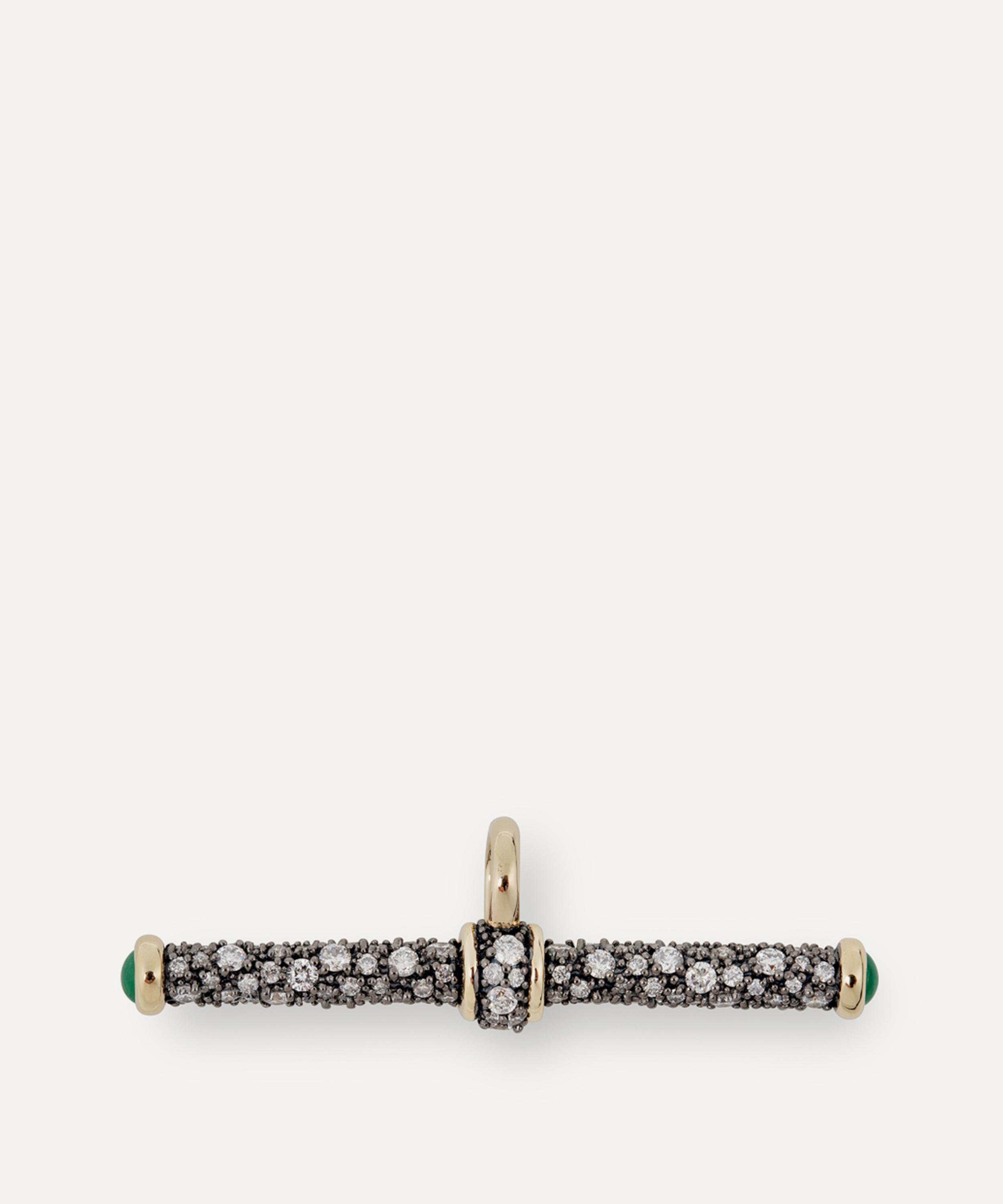 Crafted from 14ct gold, it features a classic T-bar adorned with a sparkling diamond pavé atop antique finish black rhodium. Complete with an emerald cabochon on either end, it references a vintage silhouette with a modern sentiment, making it a versatile addition to any jewellery collection. Wear it with one of the brand’s chains and instantly draw attention to both casual and formal looks with its subtle allure.