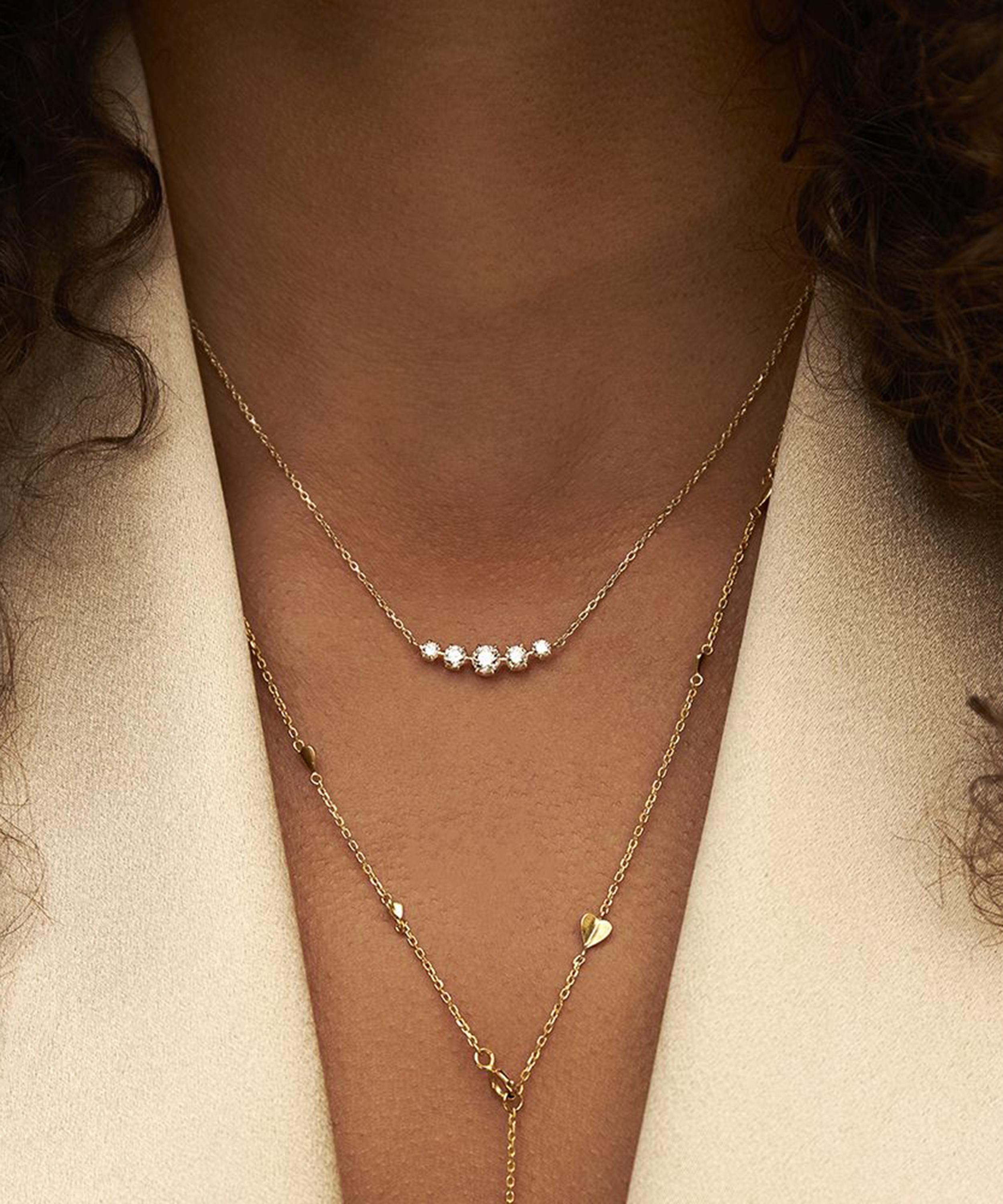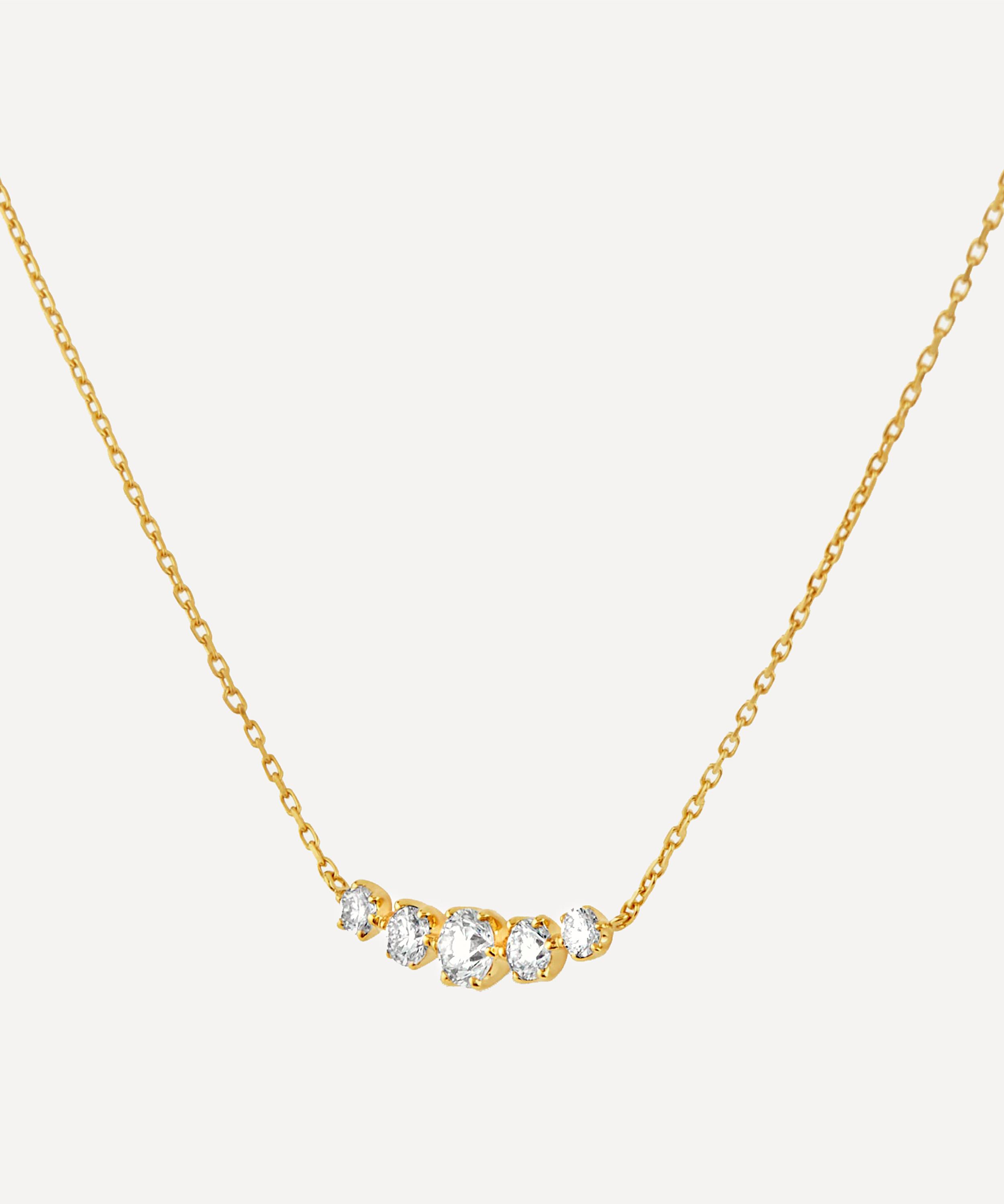 Exemplifying the designer's passion for precious stones, this necklace features a graduating row of five round, brilliant cut white diamonds with a subtly scooped silhouette that traces the curve of the neck. Each stone is presented in one of the Georgian-inspired, half-orb claw settings that characterise the Elyhara collection. Mix and match this piece with other equally iridescent styles for an enchanting evening-ready curation.