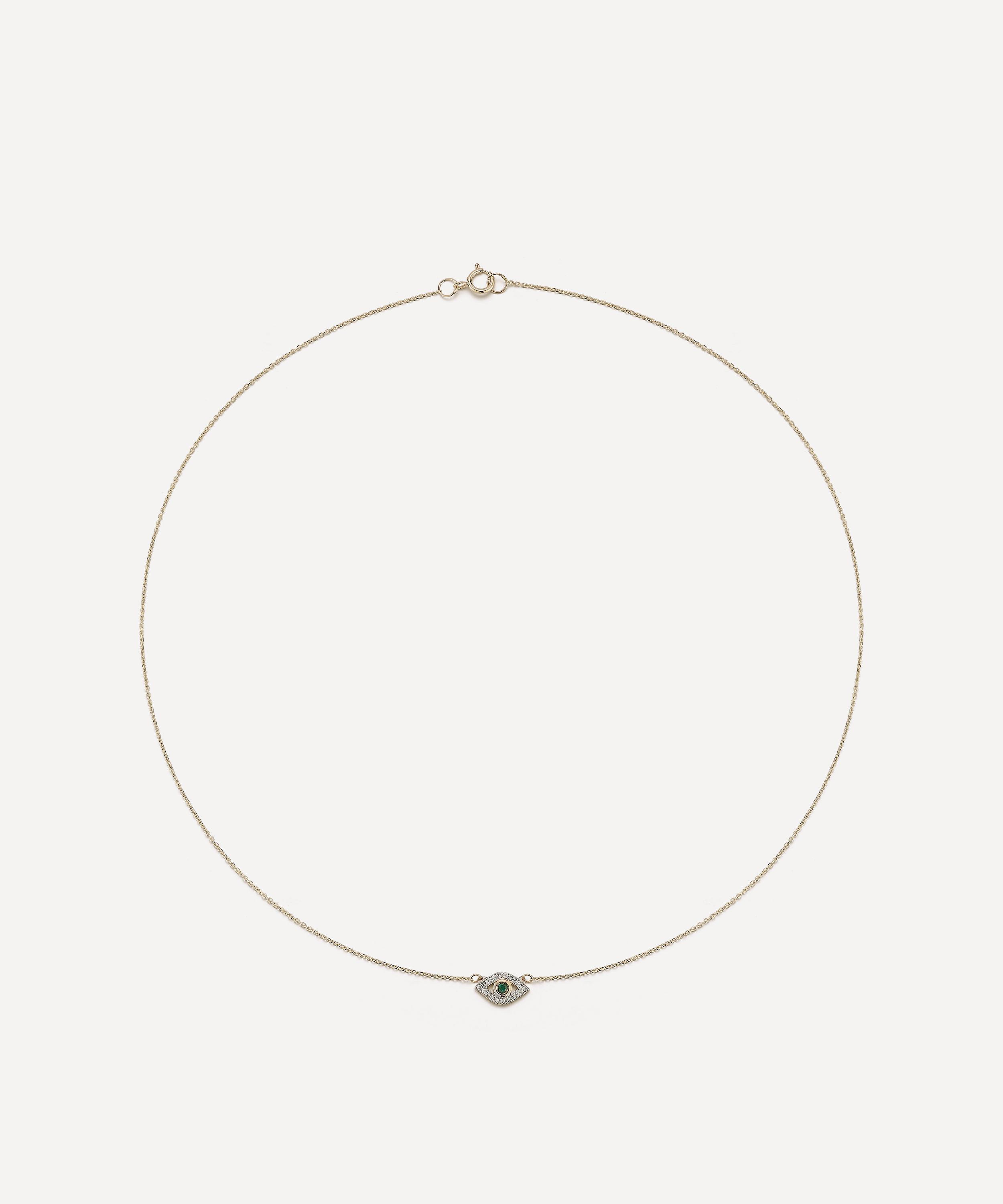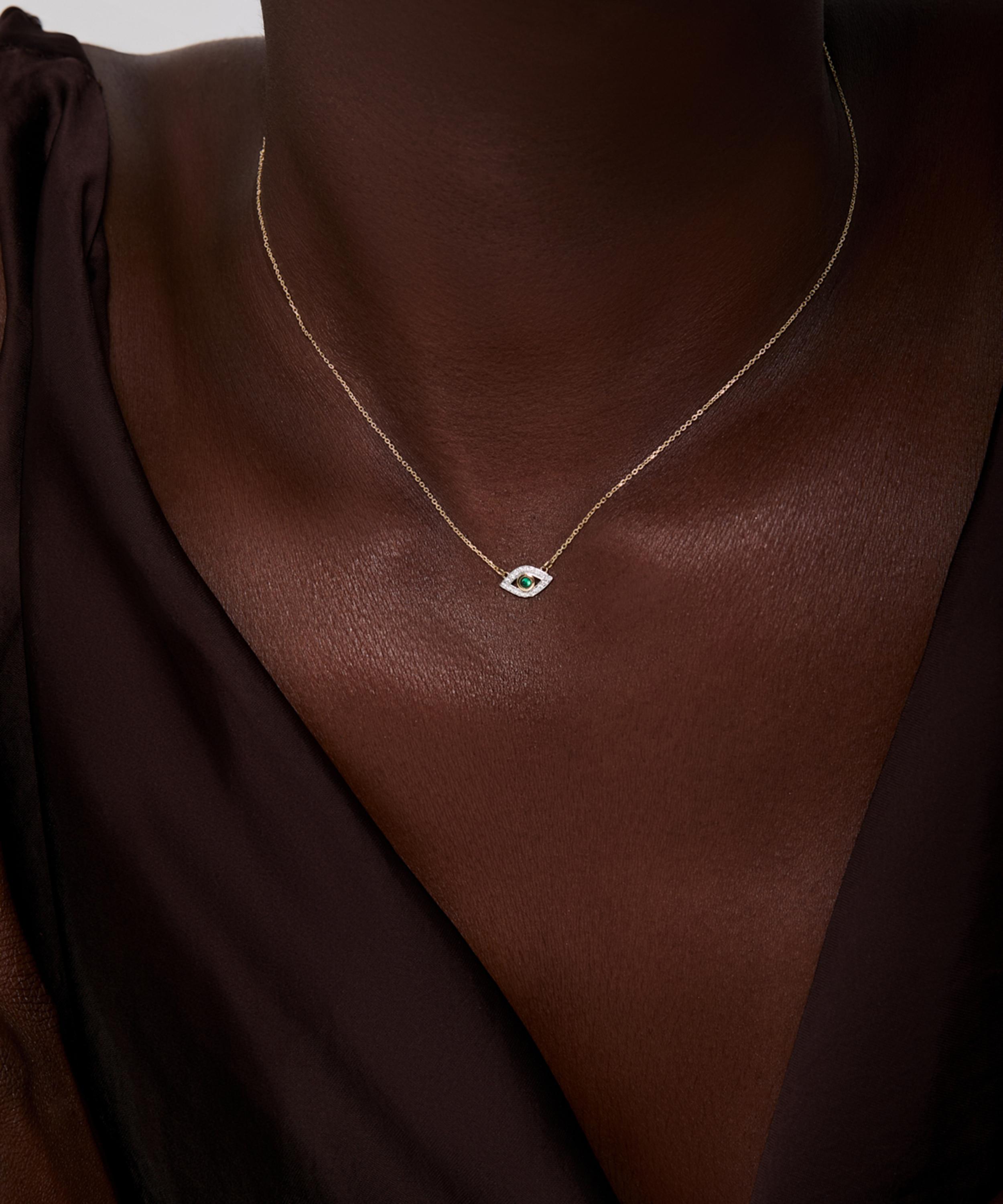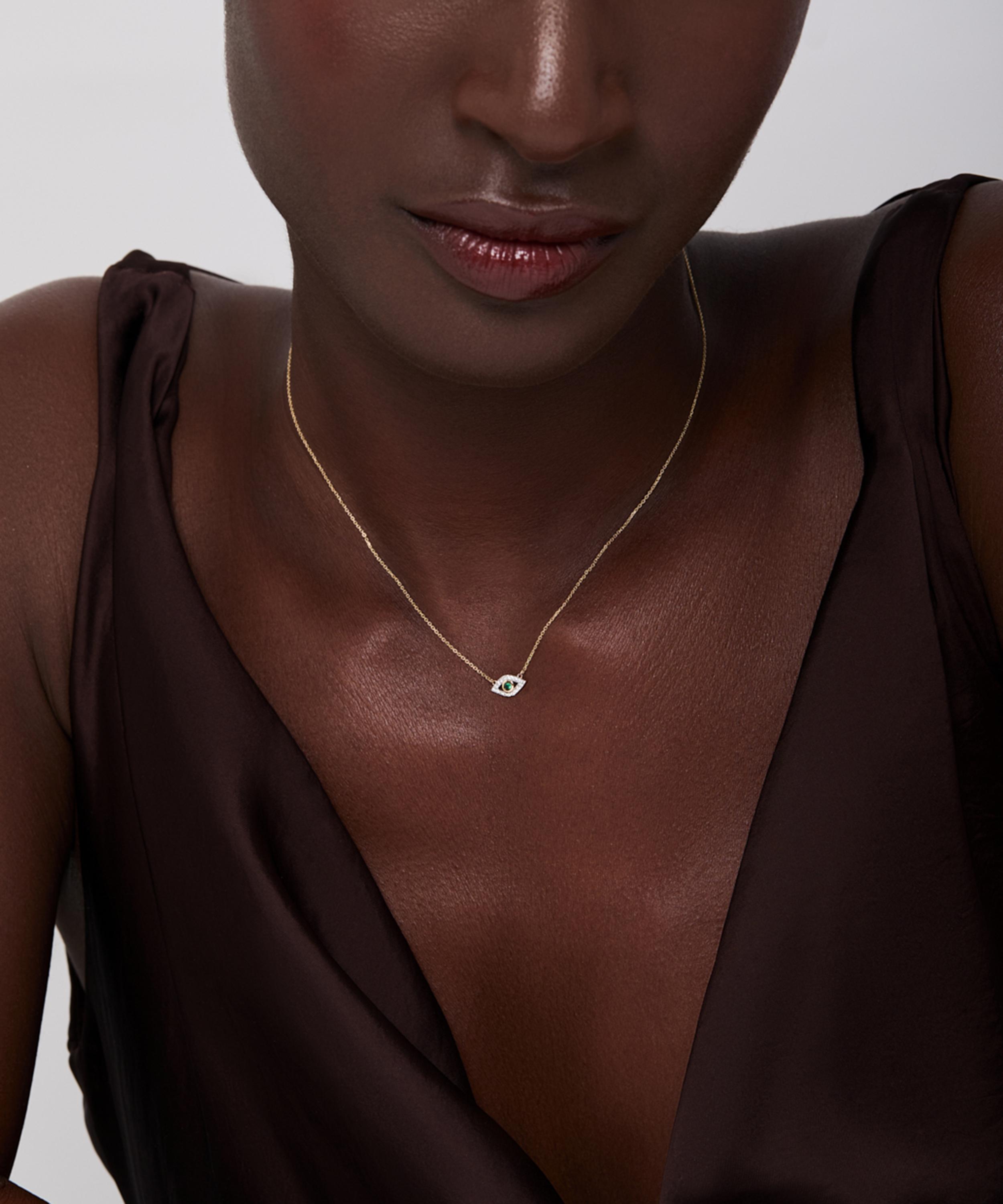 Elevate your line-up with the Emerald Evil Eye Pendant Necklace from Mateo. Crafted from solid 14ct gold, it features a fine chain embellished with a central emerald and pavé diamonds, forming an evil eye motif – a symbol of protection and grace. Wear this enchanting piece solo or pair it with the matching Evil Eye Stud Earrings and Ring for a co-ordinating look.