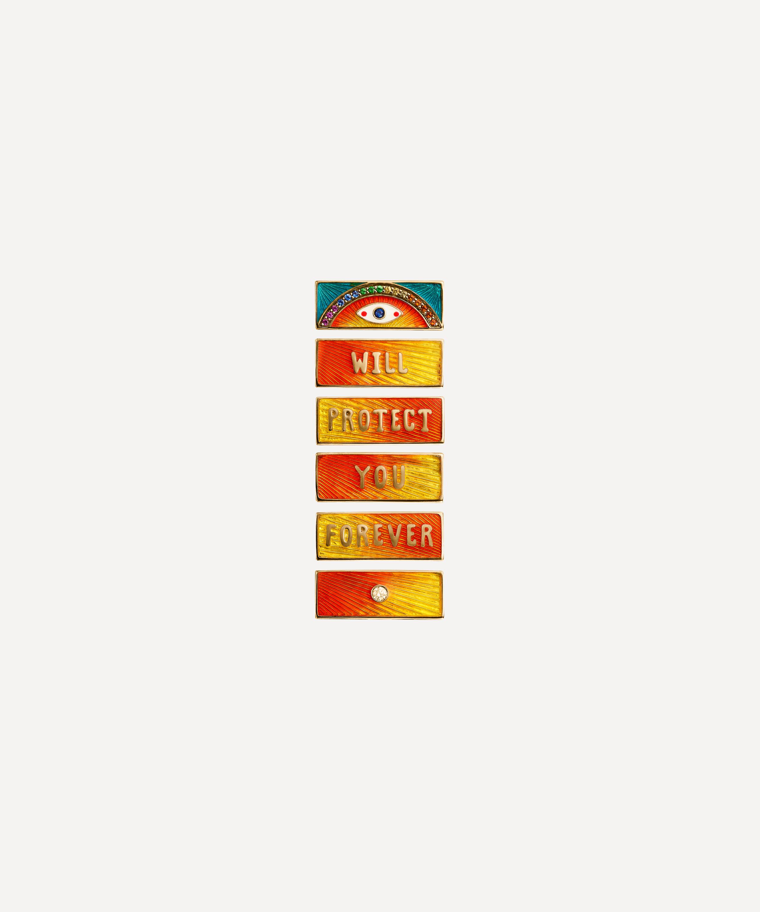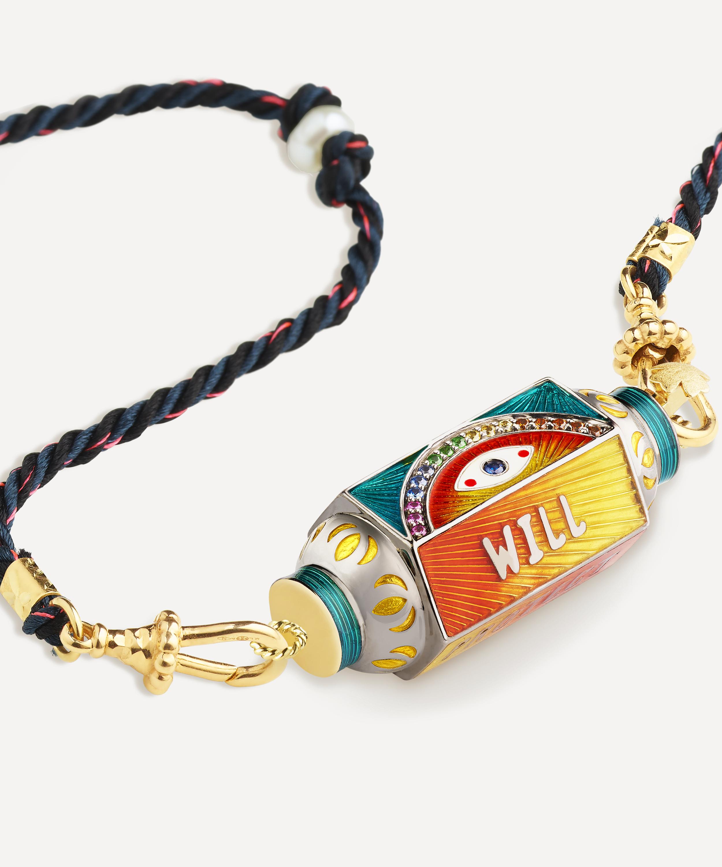 Expertly crafted from 14ct gold, it features a large barrel locket in a black rhodium finish, featuring finely chiselled and enamel detailing, a sapphire encrusted rainbow, and diamond accent. It’s complete with the inscription “Will Protect You Forever” with an evil eye motif representing the letter “I”. Team it with one of the brand’s Rosa Chains or Mauli Cord Necklaces.