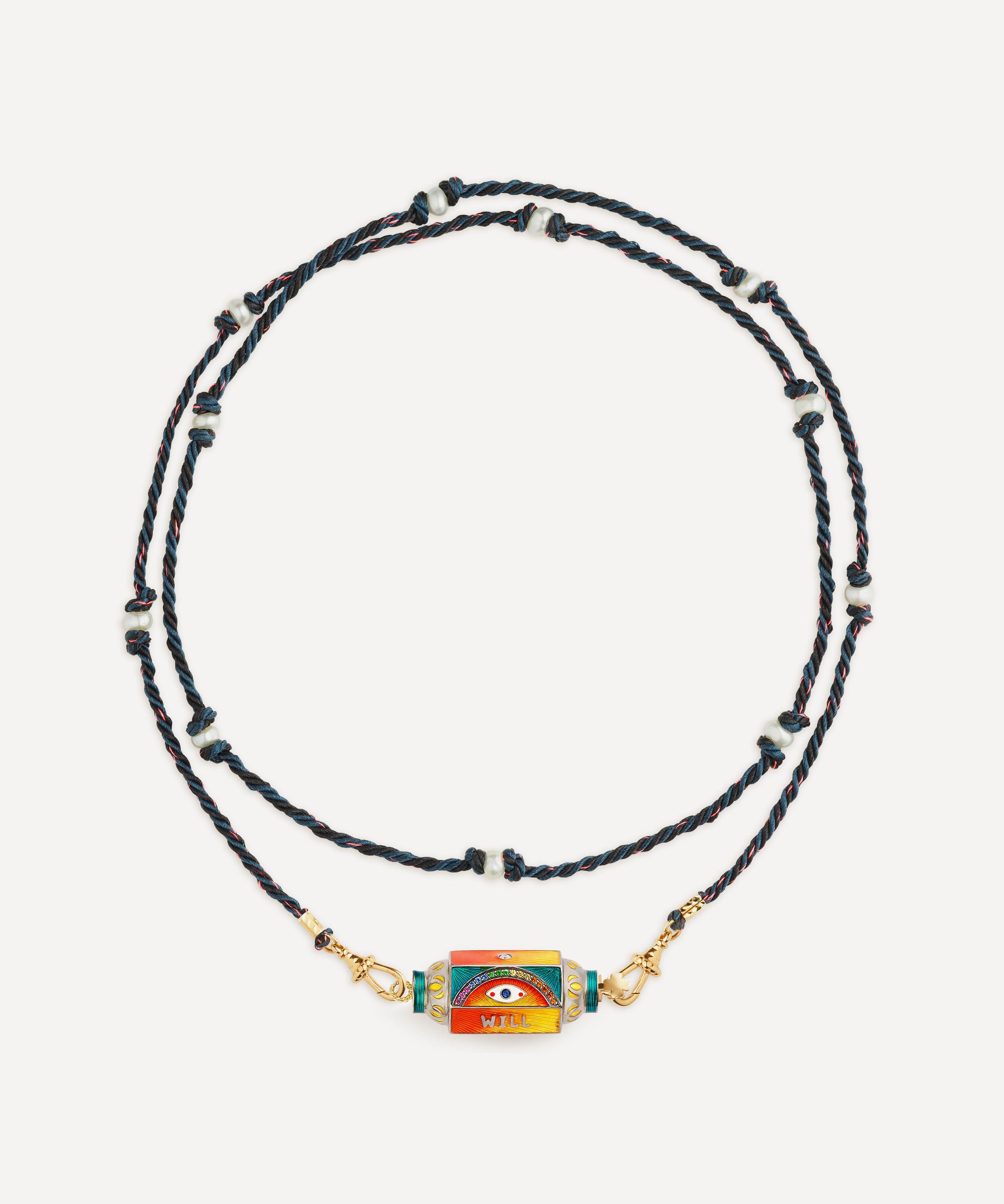 Expertly crafted from 14ct gold, this necklace features a double-loop Mauli cord with freshwater pearls and a handcuff finish at each end. At the centre hangs a large barrel pendant in a chiselled gold, black rhodium finish featuring enamel, a sapphire encrusted rainbow, and diamond accent, accompanied by the inscription “Will protect you forever” with an evil eye motif representing the letter “I”.