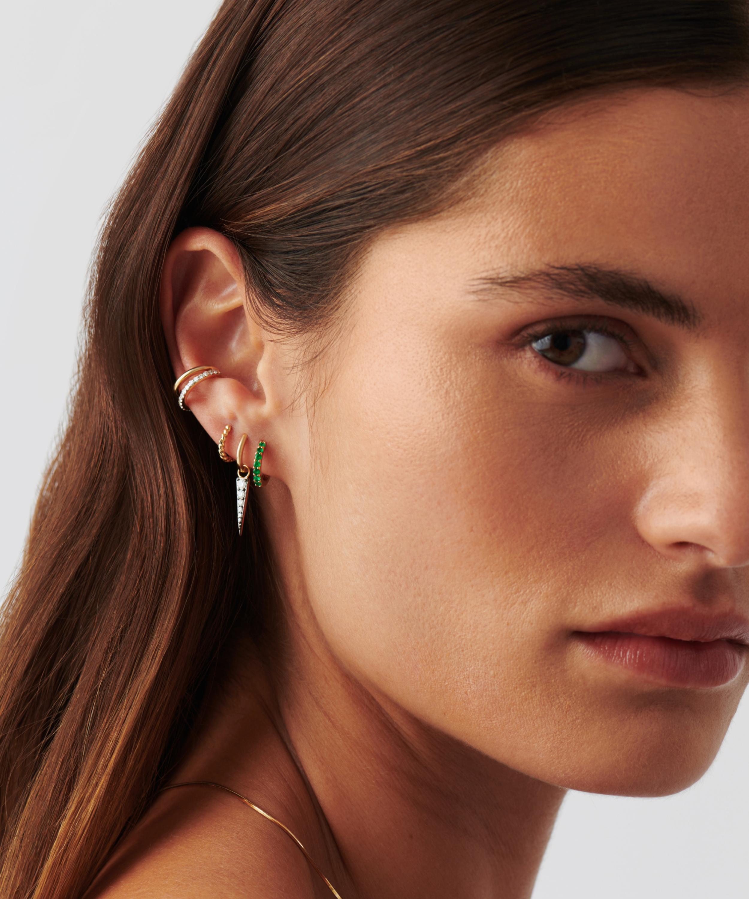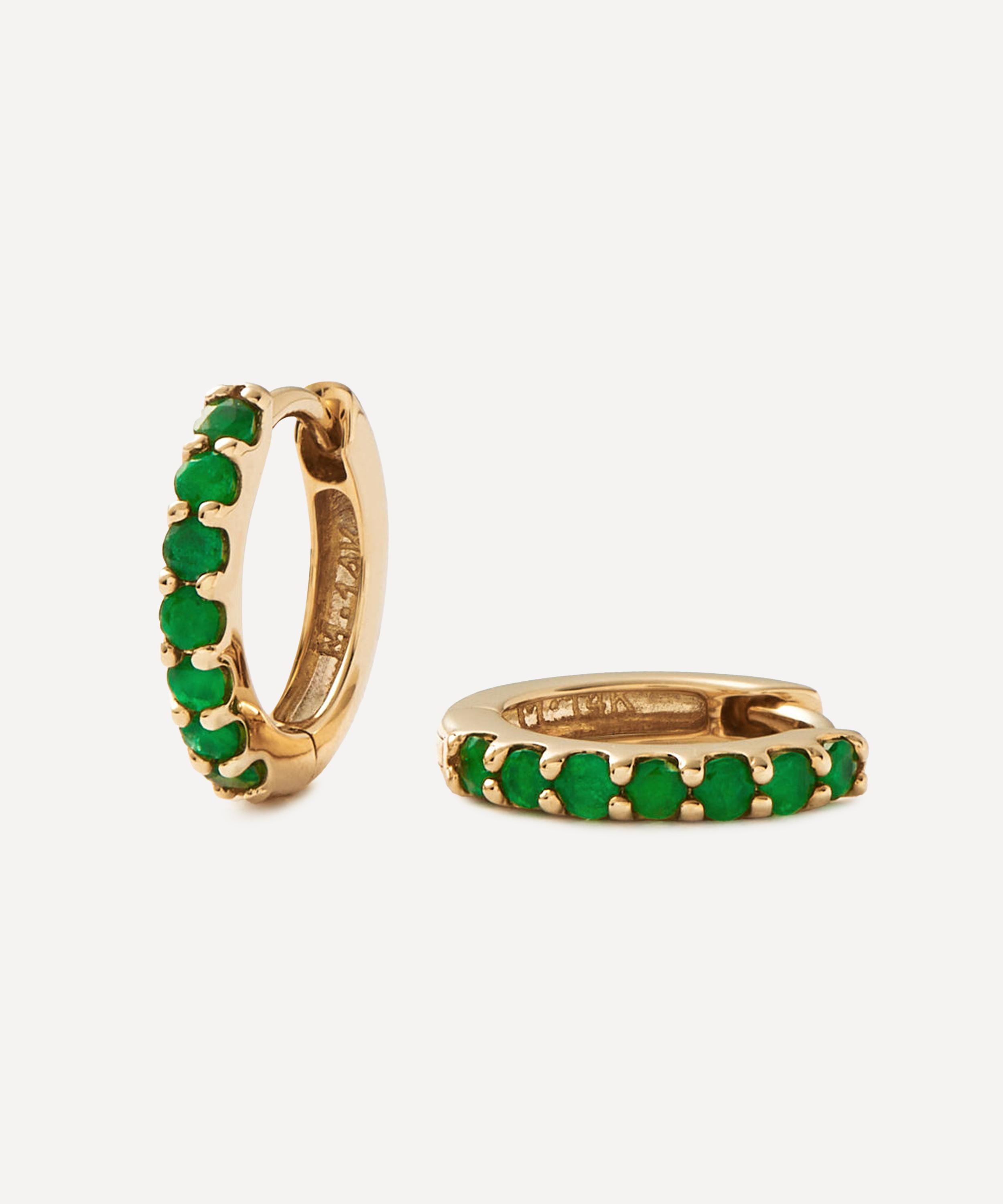 Make every day dressing feel effortless with these subtly elevating huggie hoop earrings from Missoma. Handcrafted from solid 14ct gold, each earring features a sleek, polished hoop lined with deep green emeralds, perfect for any kind of ear stack curation. Style them with other gold earrings or wear solo for a minimal look.