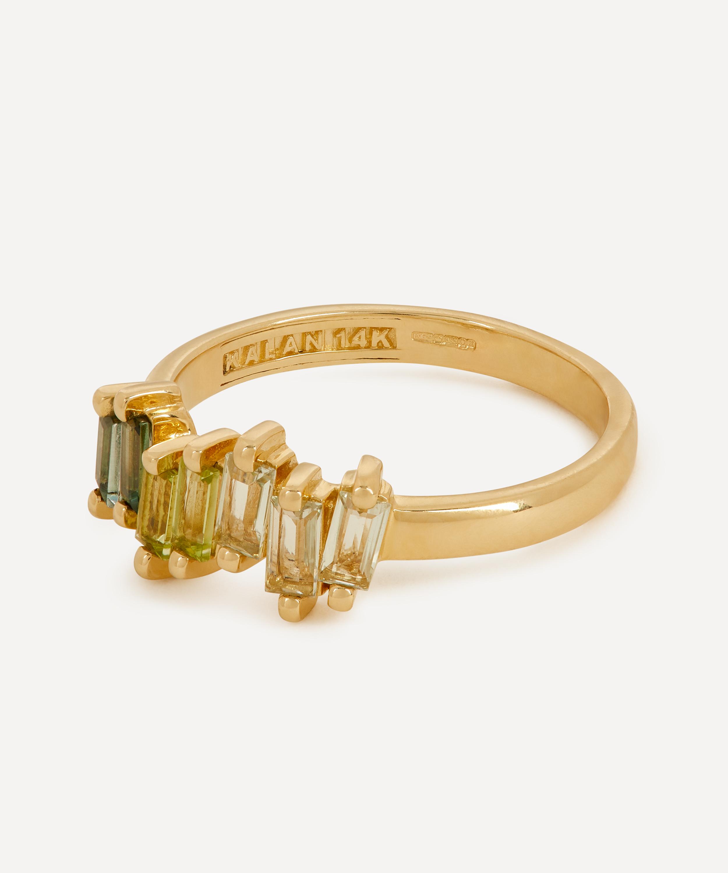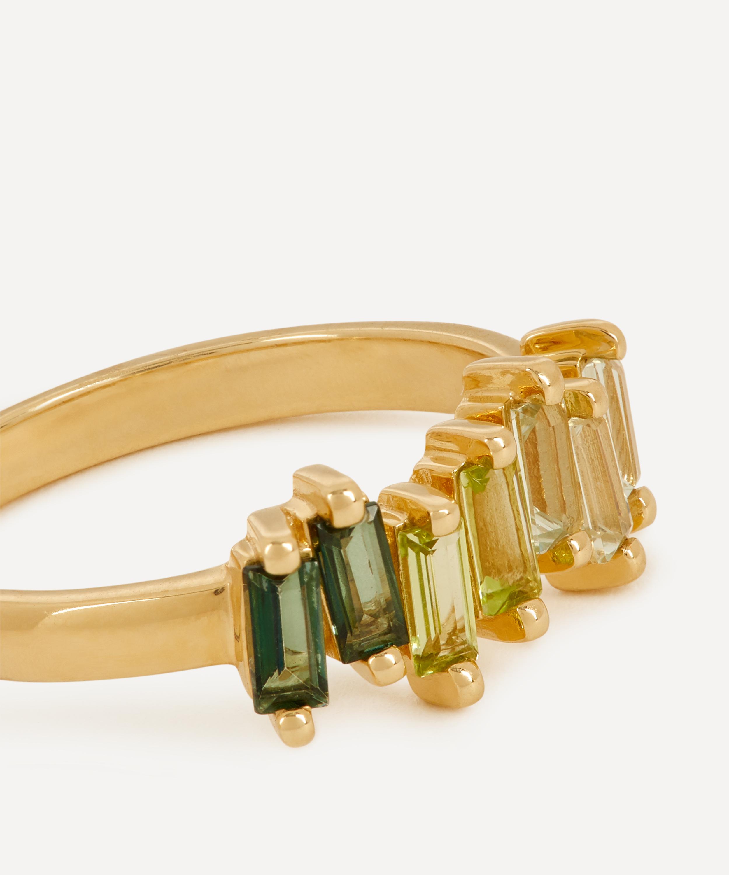 Exemplifying the designer's contemporary approach to traditional fine jewellery design, Suzanne Kalan presents this gemstone ring. Crafted from solid 14 carat gold, this ring features a subtly irregular row of baguette cut gemstones that come together to form a green colour gradient on a polished half band. Style it solo for a pop of colour day-to-day, or stack it with several of the designer's other glittering gemstone rings for a dazzling, evening-ready approach.