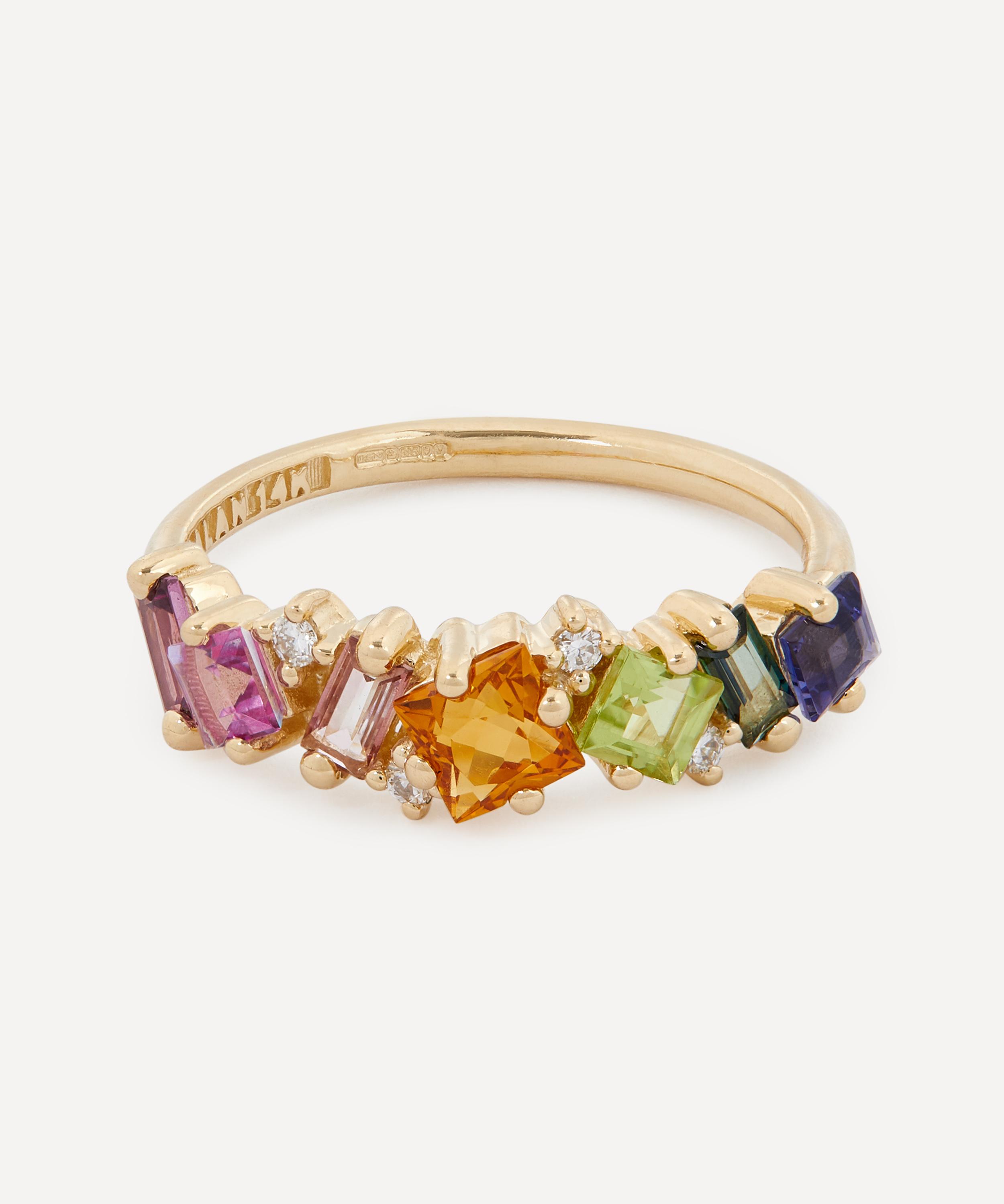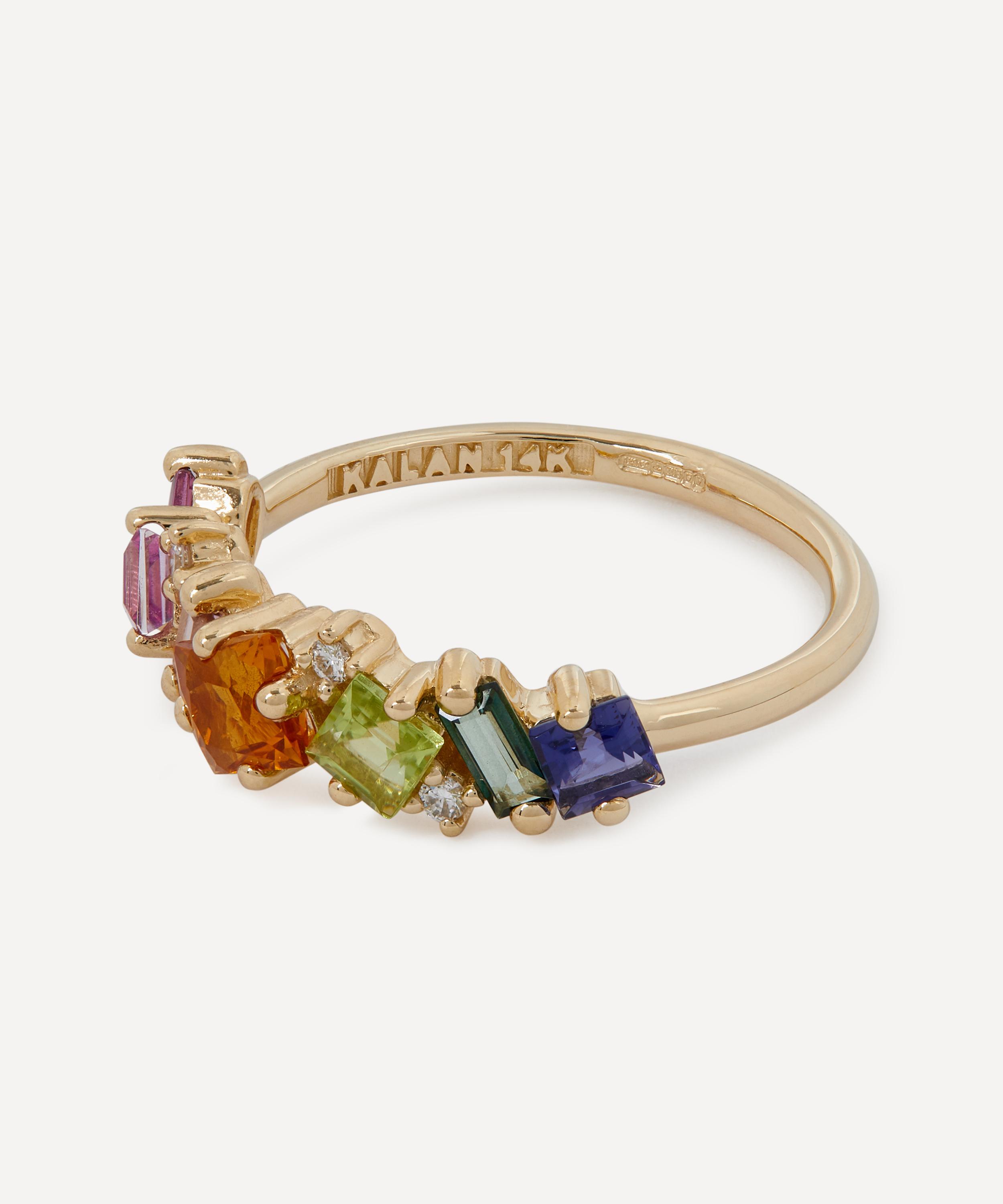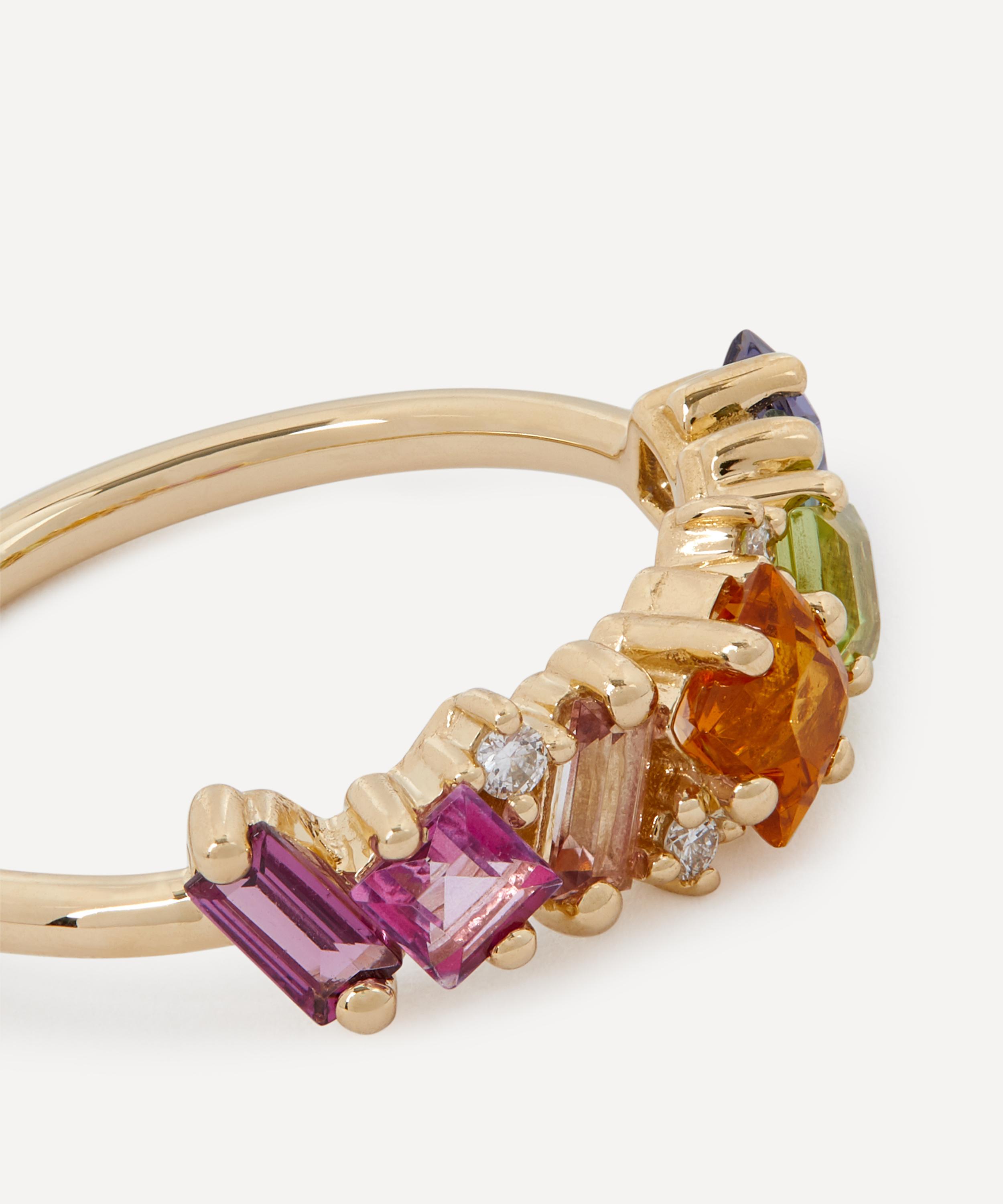 Exemplifying the designer’s contemporary approach to traditional jewellery designs, Suzanne Kalan presents this Fireworks Green Mix Diamond half band ring. Crafted from solid 14ct gold, it features a slim, polished band, embellished with an assortment of baguette cut gemstones in green hues, interspersed with sparkling diamond accents. Style this piece solo for a burst of colour day-to-day or stack it with several of the designer's other glittering gemstone rings for an unforgettable cocktail hour curation.