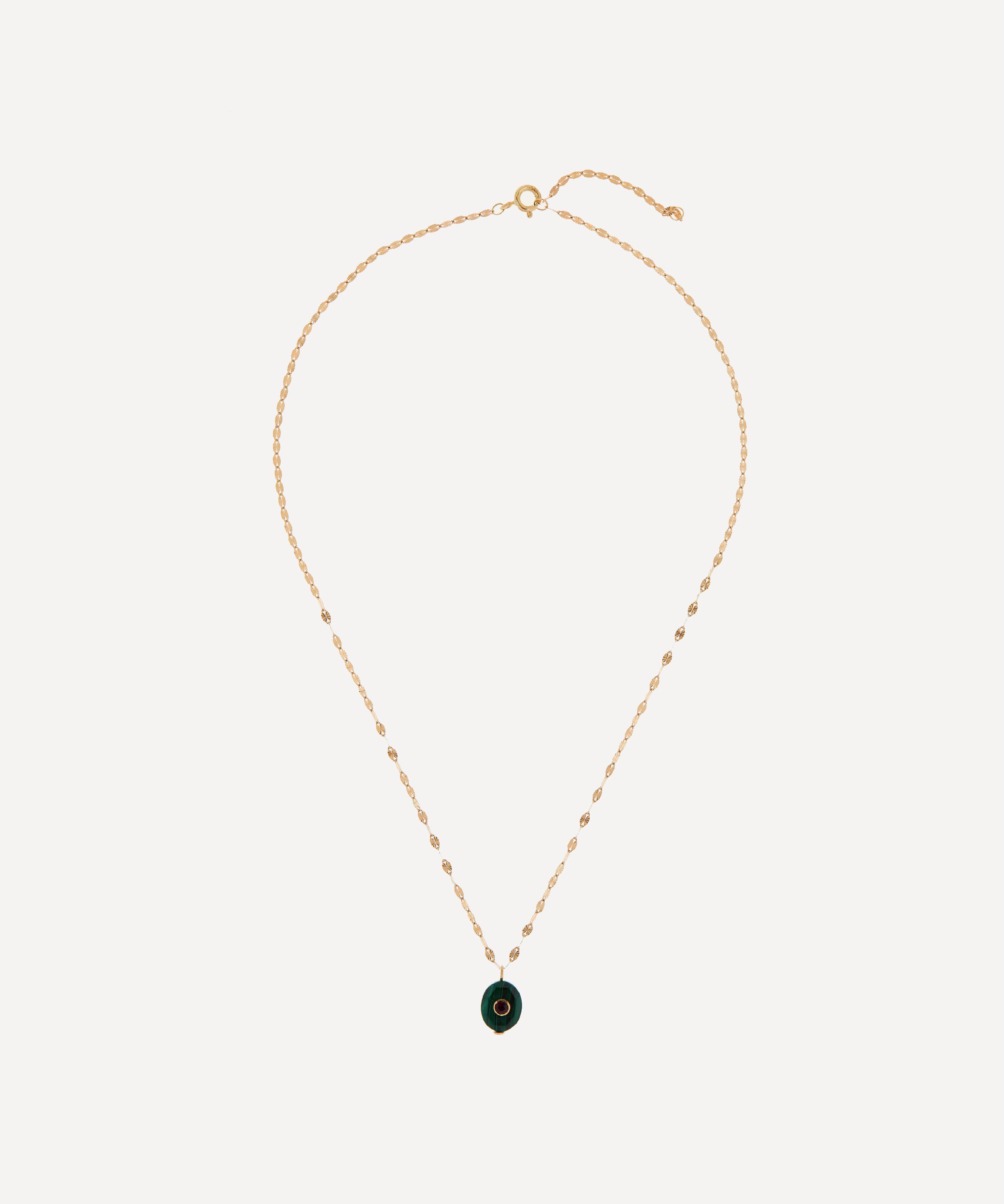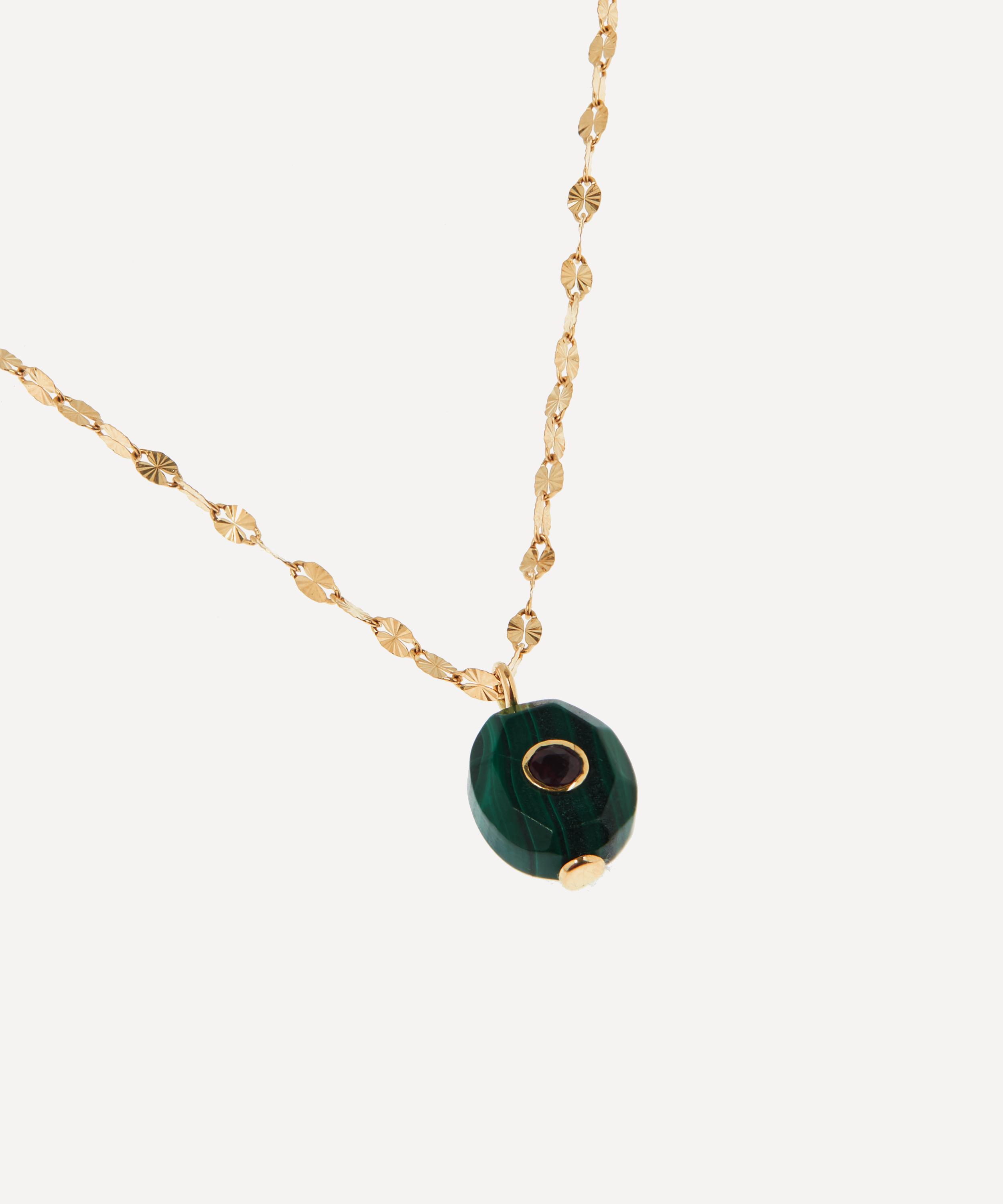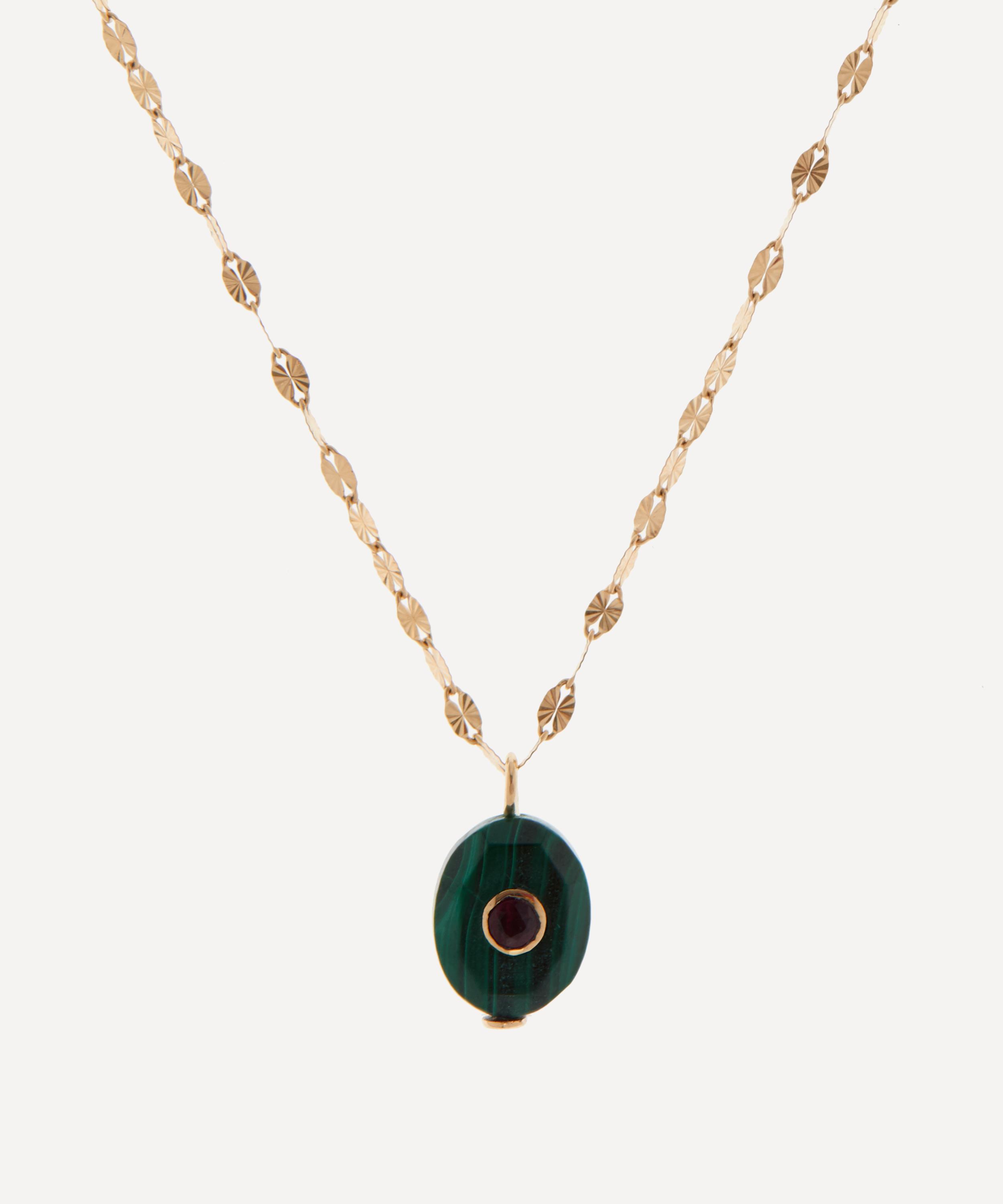 Every Pascale Monvoisin design celebrates the beauty of imperfection with individually hand-picked stones that feature subtle variations in shape and colour. Suspended from an intricate 14ct gold chain, this stunning necklace showcases a smooth green malachite pendant, adorned with a gorgeous ruby framed in a gold circle at the centre. Layer this personal talisman with several other natural stone pendants for a beautifully organic finish.