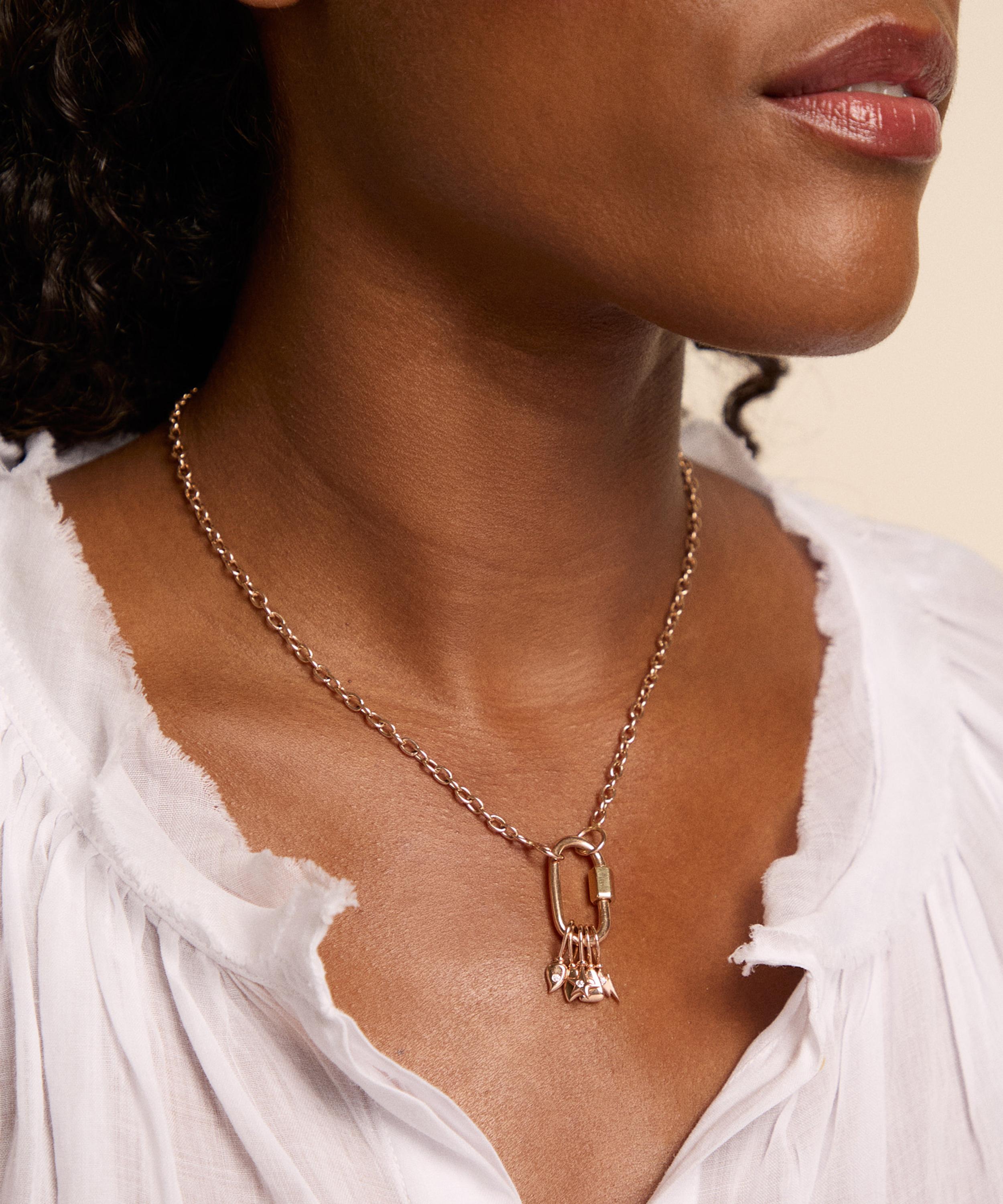 Complete your favourite chain from Marla Aaron with the Itty Bitty Bolt Charm. Rendered in solid 14ct gold, it showcases Aaron’s playful design principles, featuring a swivelling bolt adorned with a solitaire diamond. Spotlighting functional maximalism with a bold, yet refined look, it boasts endless styling possibilities - lean into the brand’s “pile it on” approach to jewellery and create your own bespoke stack.