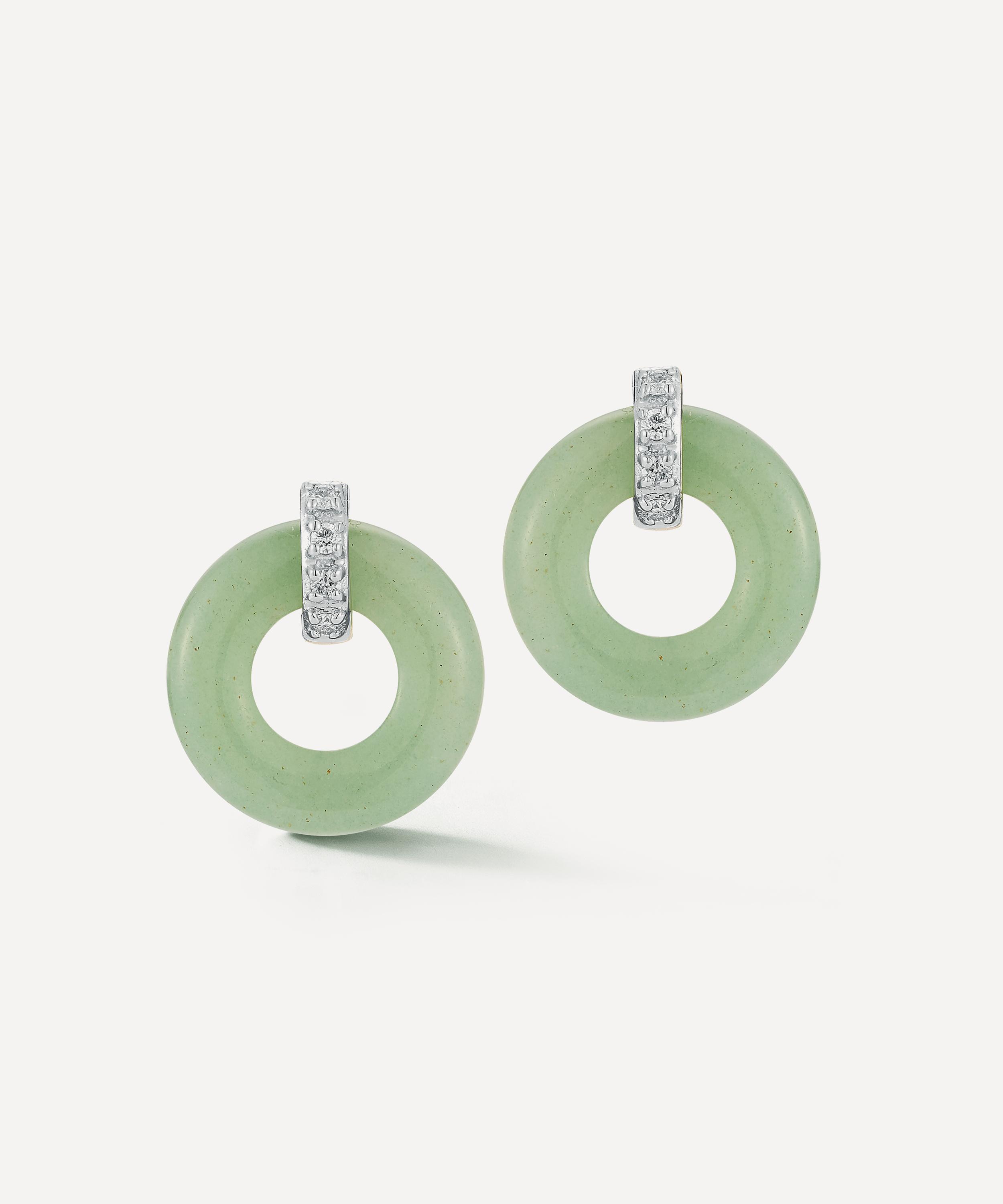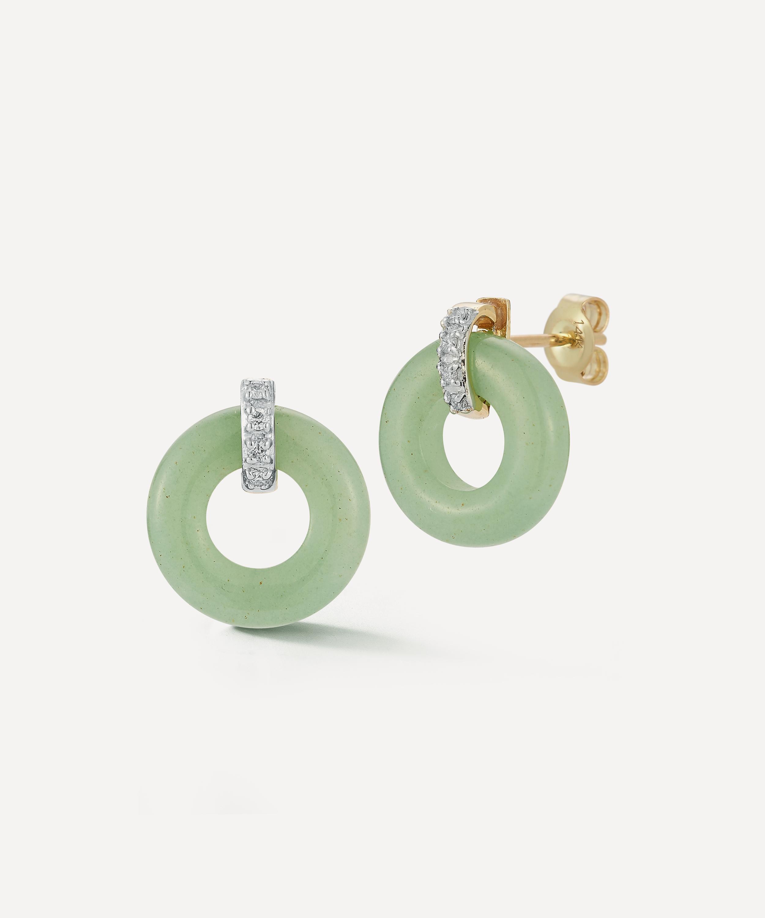 14ct Gold Jade Donut and Diamond Door Knocker Stud Earrings