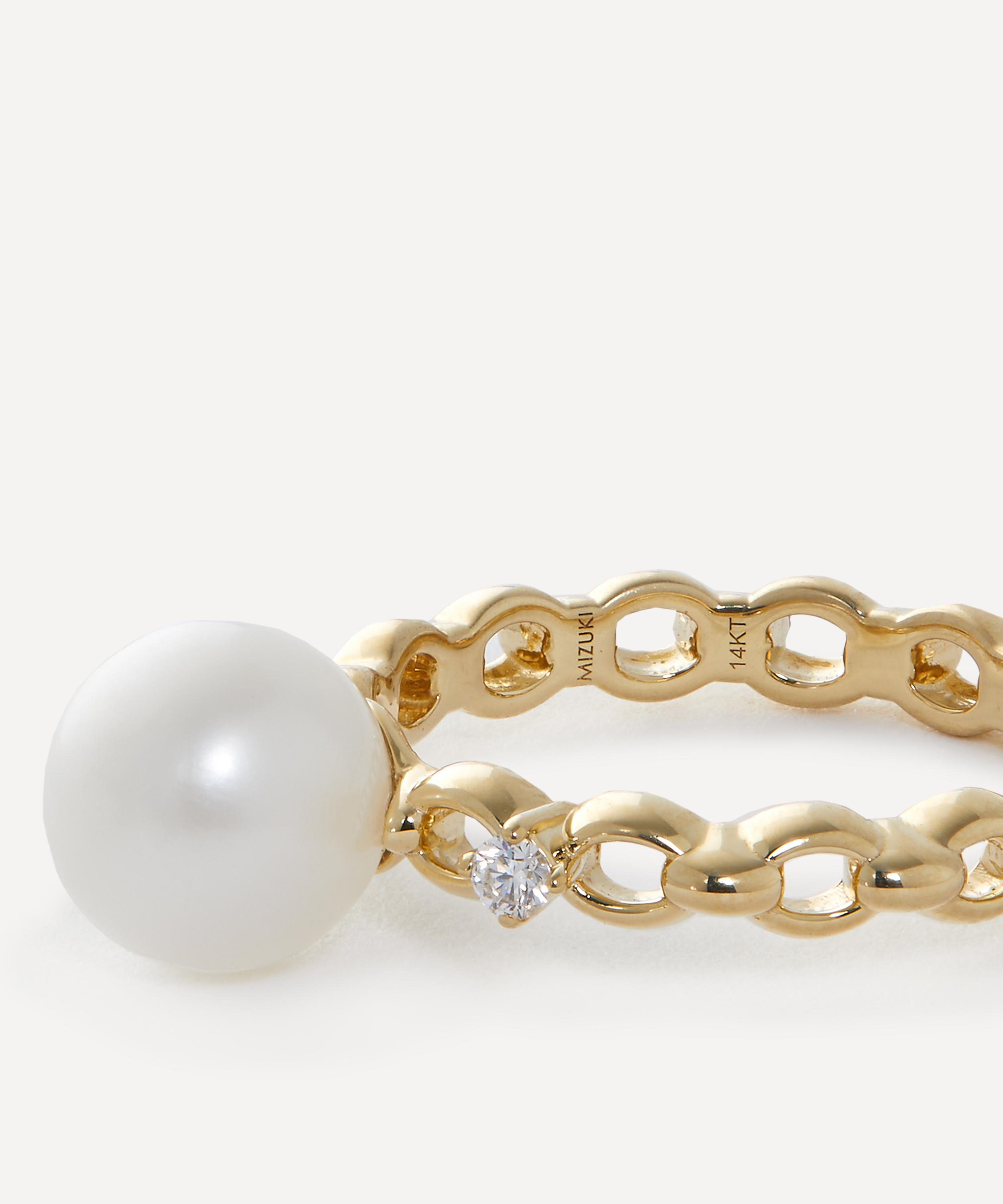 Everyday elegance encapsulated, this ring by Mizuki is the minimal statement piece you will reach for again and again. Crafted from 14ct gold, it features a gold link band, adorned with a freshwater pearl and sparkling diamond accent. Style solo, or stacked.