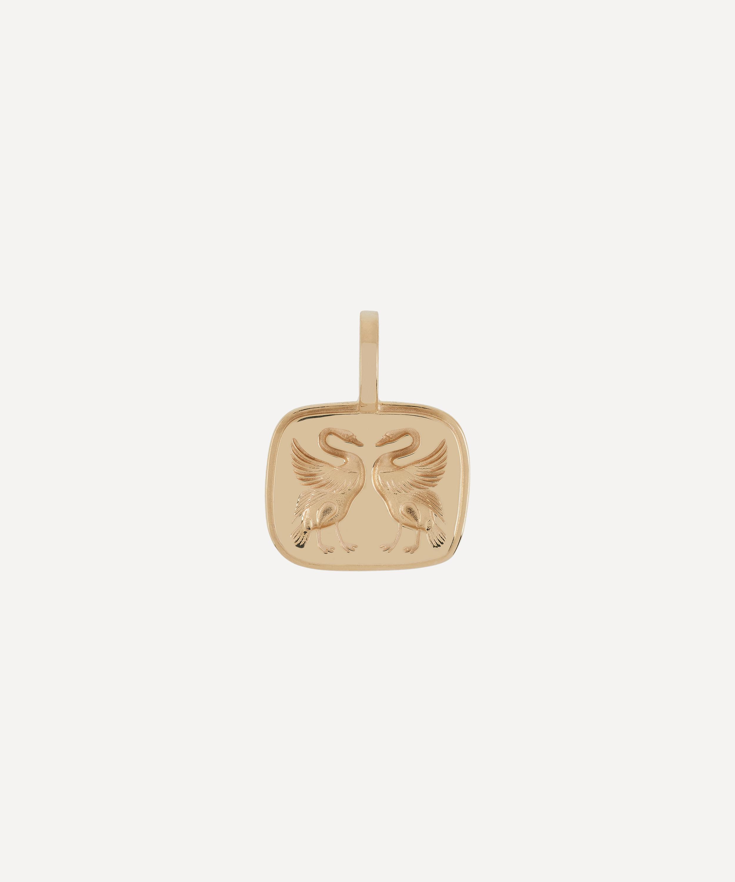 Meticulously handcrafted from 14ct gold, this charming piece features a duo of birds, carved into a sleek square backdrop, and is complete with a high-polish finish – add to a chain necklace and style it on its own to bring a personal touch to your jewellery curation, or wear with other charms and pendants for a maximalist approach.
