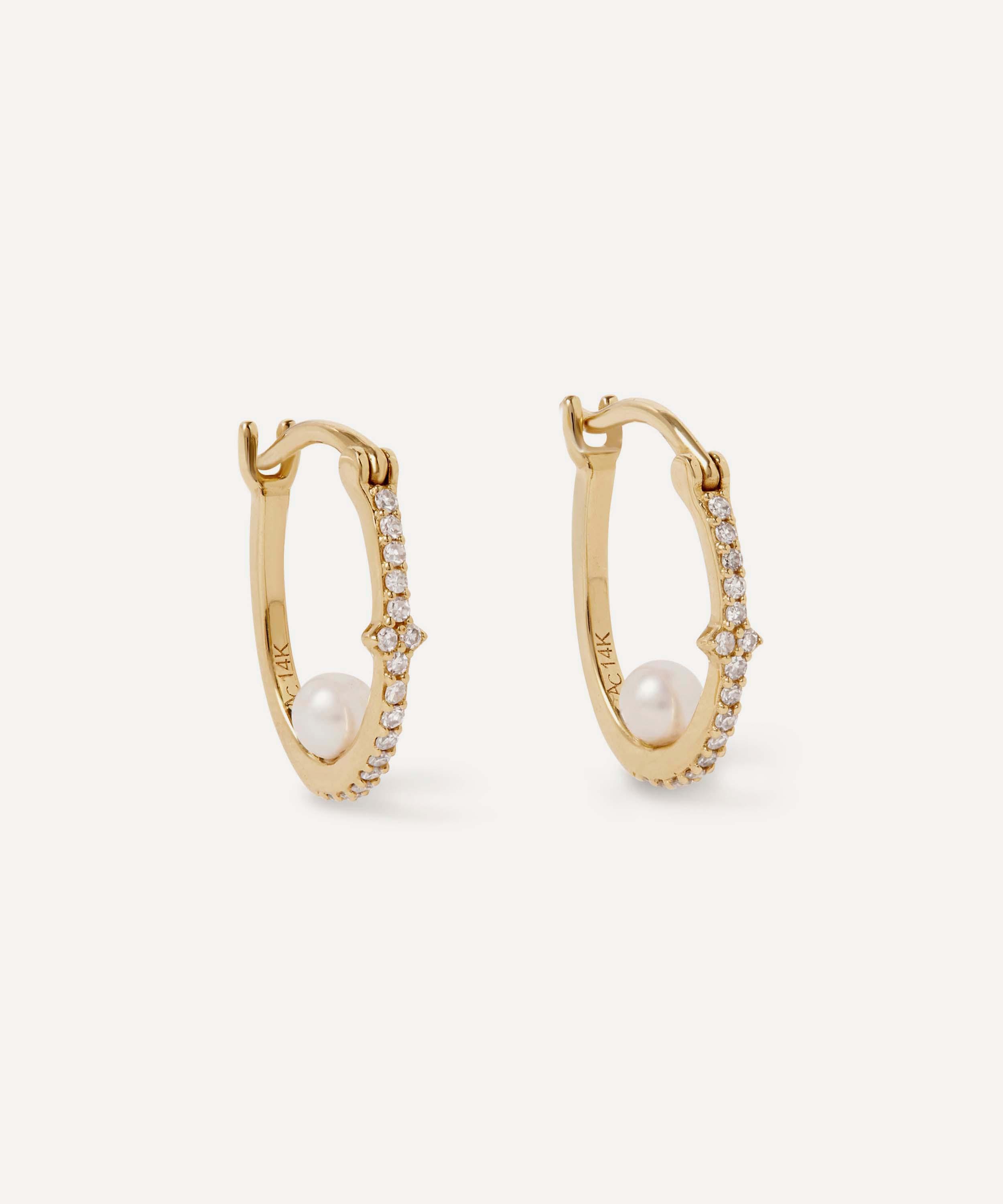 Rendered in solid 14ct gold, each hoop pairs a luminous freshwater pearl with sparkling pavé diamonds, creating a design that feels both timeless and modern. Offering endless styling options, perfect for both day and evening looks, wear yours alone for understated elegance or style as part of a curated ear stack for a contemporary finish.