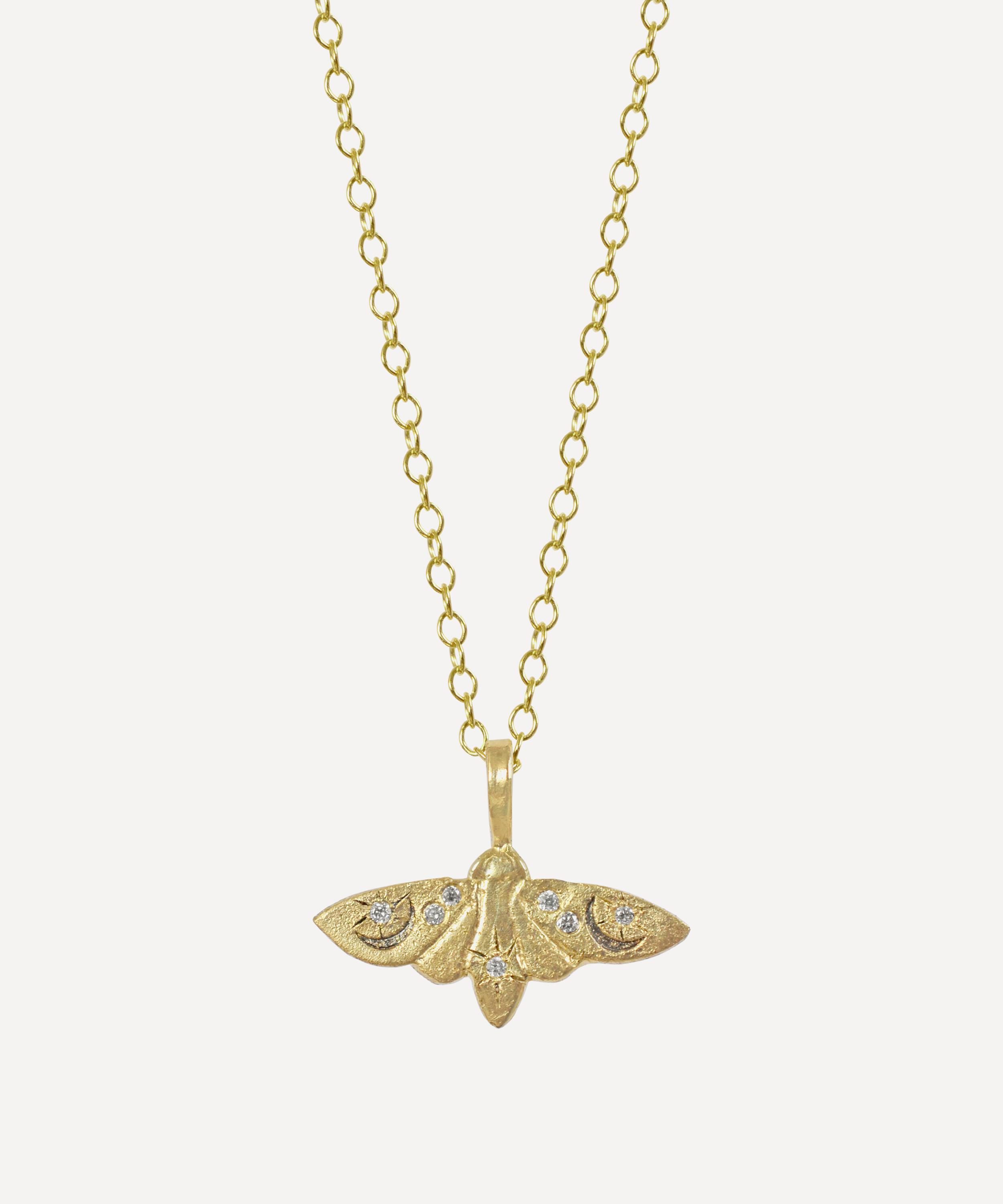Meticulously crafted from solid 14ct gold in Acanthus’s signature stardust texture, it features a moth-inspired design ornate with engraved celestial detailing and brilliant cut diamonds. Style it on a chain of your choice and layer it with several of the brand’s amulet necklaces to create a meaningful curation that is personal to you.