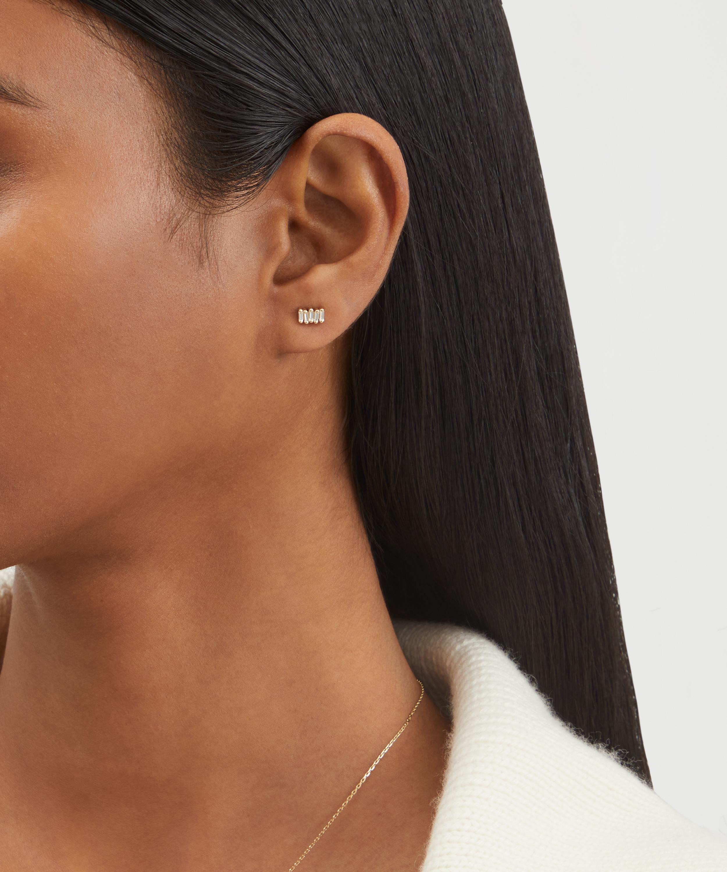 Add subtle sparkle to everyday looks with these stud earrings from Suzanne Kalan. Exemplifying the designer's contemporary approach to traditional fine jewellery design, each earring is crafted from 14ct gold, featuring a horizontal bar with five baguette cut diamonds. Style them solo, or mix and match with the designer's other gemstone encrusted pieces for an unforgettable cocktail hour curation.