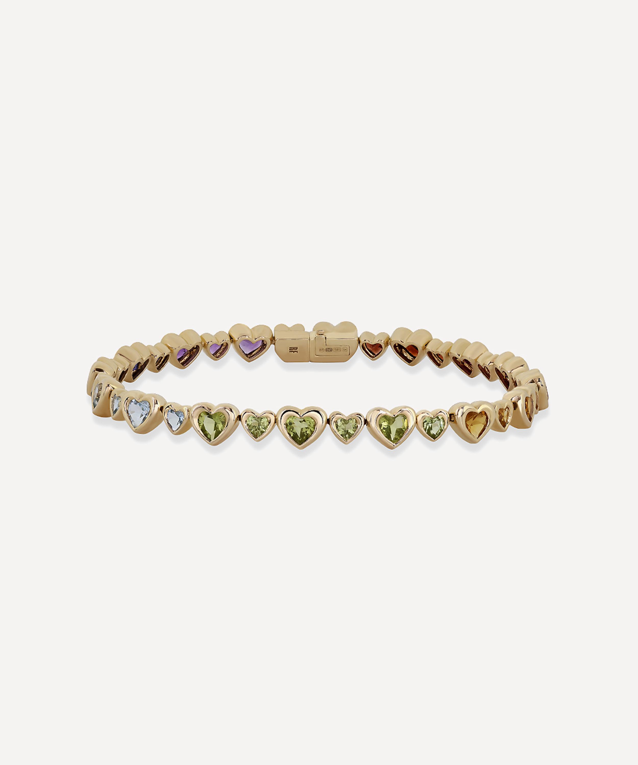 Take a playful approach to everyday dressing with the Mini Heart 2 Heart bracelet from Roxanne First. Crafted from solid 14ct gold, it features alternating small and large hearts, set with an assortment of semi-precious gemstones in all colures of the rainbow. Style it solo, or team it with a selection of bracelets to create your own bespoke stack.