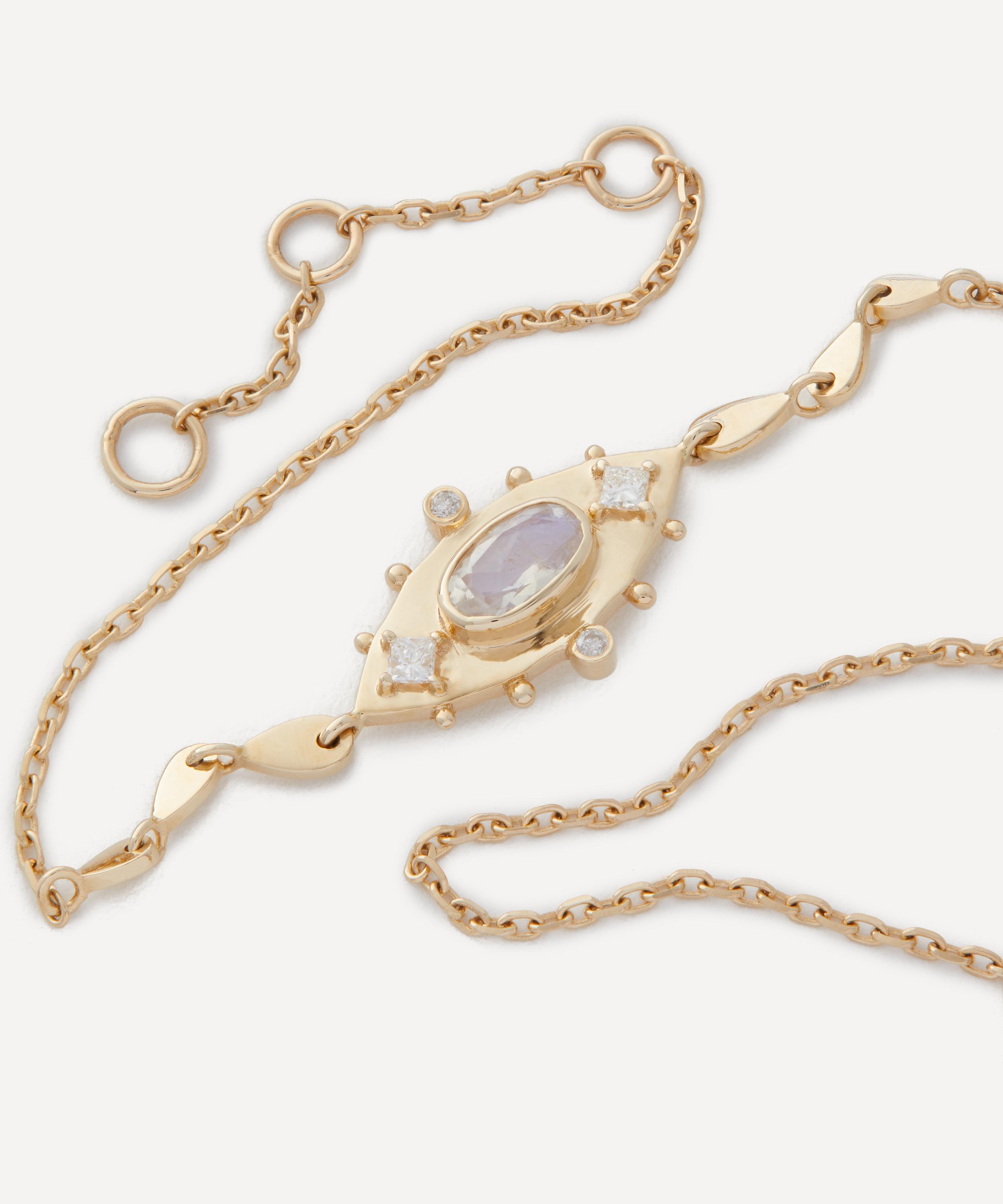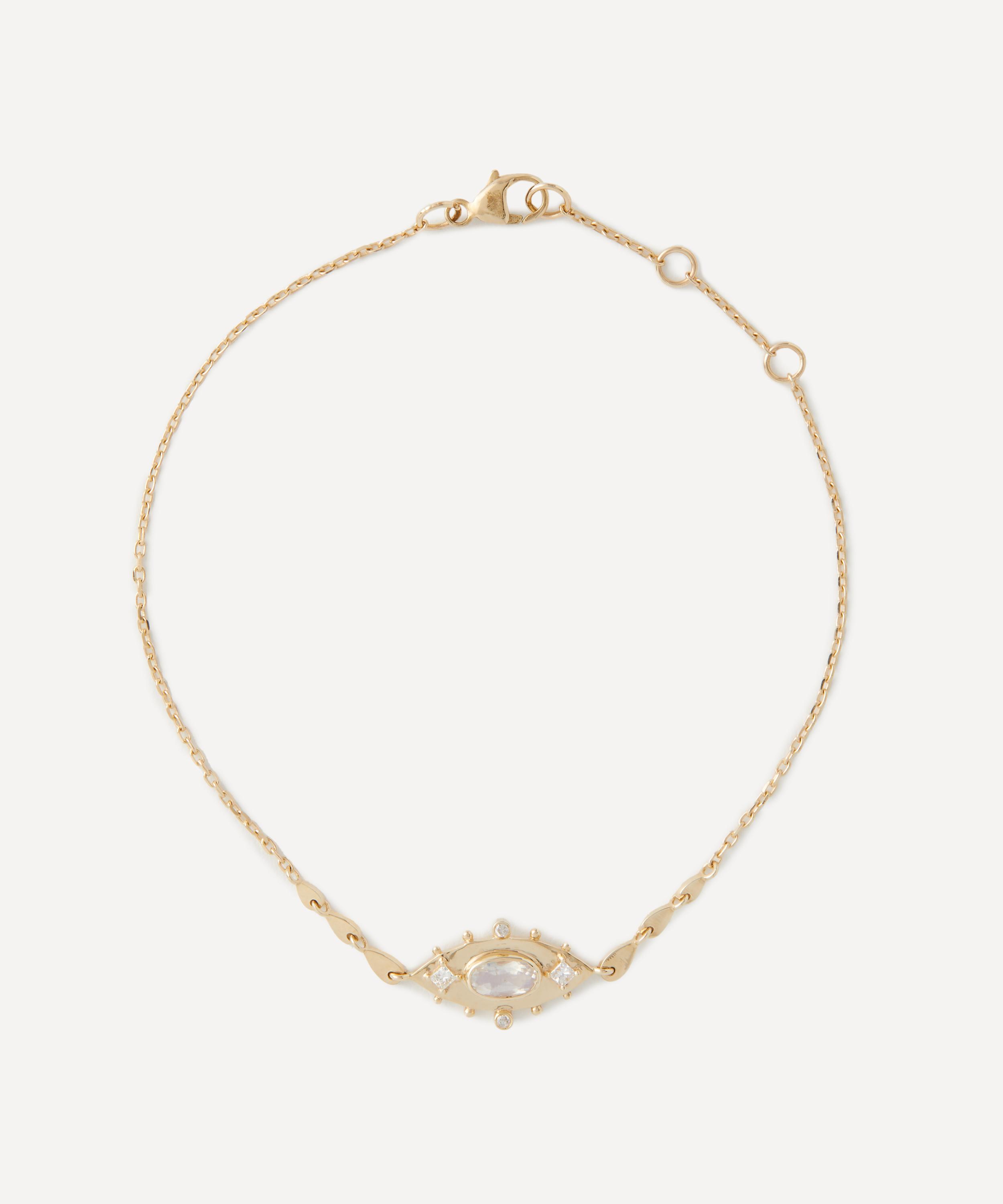 Complete styled looks and draw on the spiritual energy of gemstones through this unique and symbolic bracelet by Celine Daoust. Meticulously crafted from solid 14ct gold, it features a fine cable chain with a detailed feature inspired by the Anja eye, an important symbol in Hinduism. Finished with a moonstone at the centre and sparkling diamond accents, it radiates with a totemic energy, wear it solo or stacked.